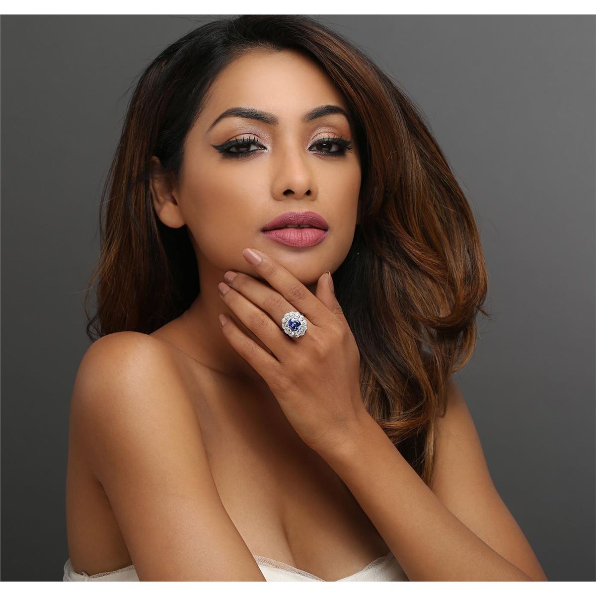 One electronically tested 14KT white gold ladies combination cast & assembled tanzanite and diamond ring with a flat shank with a bright polish finish. Identified with markings of "K14". Condition is new. Containing: One prong set oval modified brilliant cut natural tanzanite, measuring 10.24 x 8.33 x 5.46mm, approximate weight of 3.15ct., clarity is eye clean, type I, medium light, moderately strong, violet color, (GIA V 4/4), cut is good. Twelve prong set round brilliant cut diamonds, measuring 2.50 - 2.50 x 1.50mm (depth est.) approximate total weight of 12 Stones = 0.69ct. Clarity: SI-2 to I-1. Color: I - J, Cut is Good. Thirty-Six prong set round brilliant cut diamonds, measuring 1.00 - 1.00 x 0.60mm (depth est.) approximate total weight of 36 Stones = 0.13ct. Clarity: I-1. Color: H - I, Cut is Good. Colored gemstones are presumed to have been subjected to commonly used enhancement processes. All diamonds and colored gemstones are graded in the mounting, unless otherwise stated. Total Weight of Colored Stones 3.15ct. Total Weight of Diamonds 0.82ct. Total Weight of Ring 8.10 grams. GGL Appraised at $8,905.00.