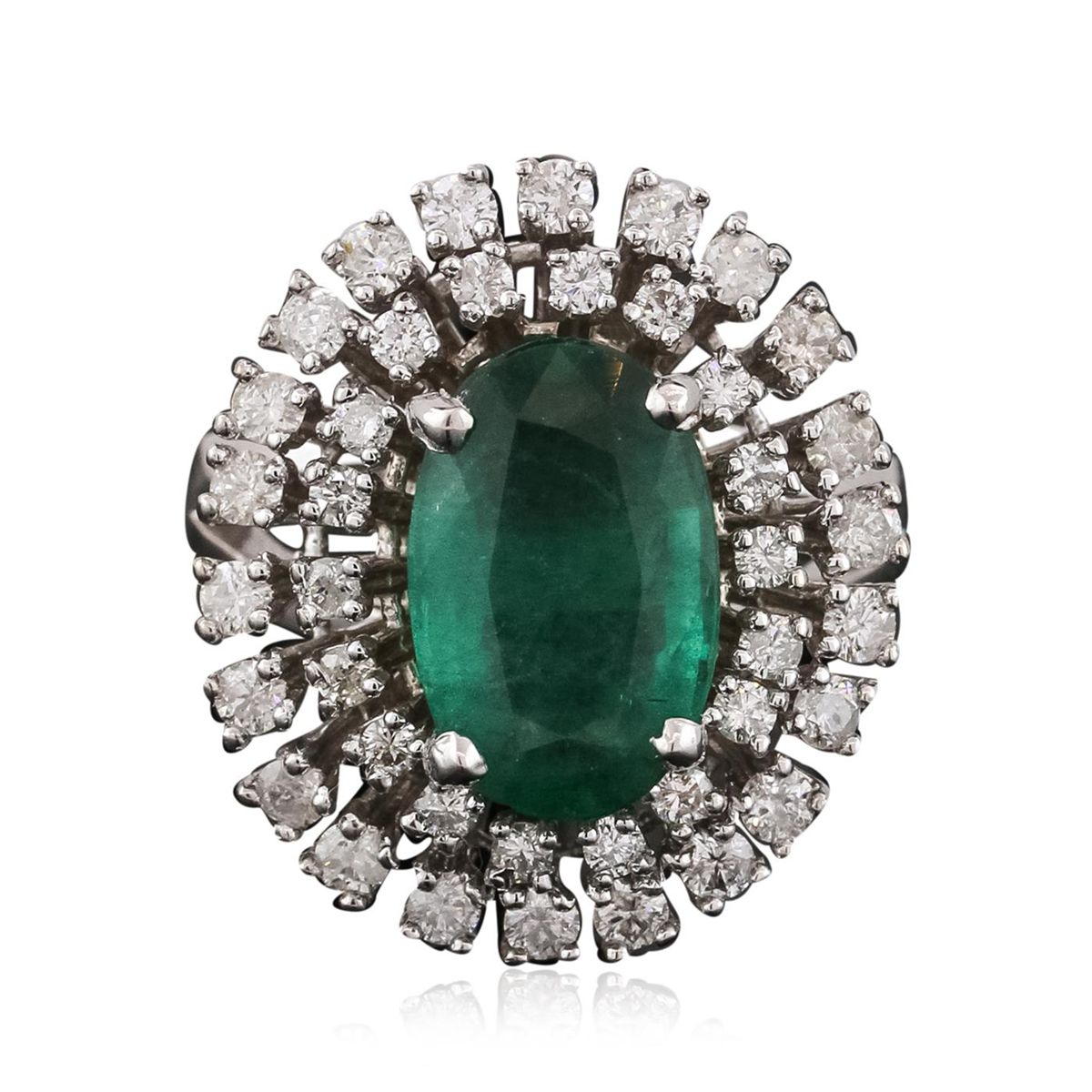 One electronically tested 14KT white gold ladies combination cast & assembled ring with a bright polish finish. Identified with markings of "K14". Condition is new. Containing: One prong set oval modified brilliant cut natural emerald, measuring 13.32 x 8.50 x 4.88mm, approximate weight of 3.16ct., clarity is heavily included, type III, medium, moderately strong, green color, (GIA G 5/4), cut is good. Forty prong set round brilliant cut diamonds, measuring 1.90 - 1.50 x 1.02mm (depth est.) approximate total weight of 40 Stones = 0.72ct. Clarity: I-1 to I-2. Color: I - J, Cut is Good. Colored gemstones are presumed to have been subjected to commonly used enhancement processes. All diamonds and colored gemstones are graded in the mounting, unless otherwise stated. Total Weight of Colored Stones 3.16ct. Total Weight of Diamonds 0.72ct. Total Weight of Ring 12.40 grams. GGL Appraised at $12,125.00.