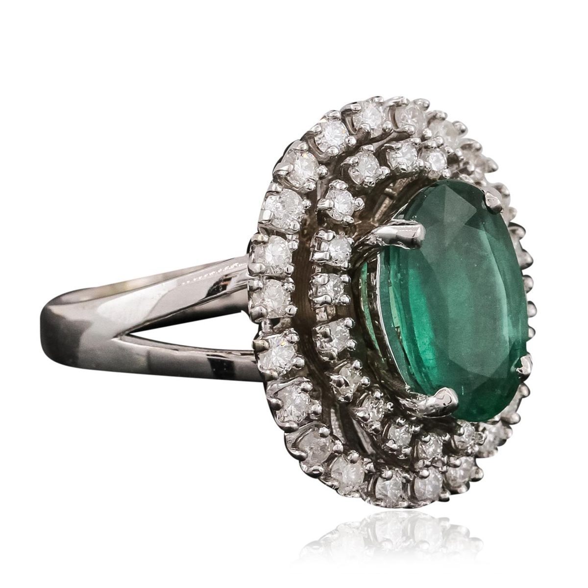 One electronically tested 14KT white gold ladies combination cast & assembled ring with a bright polish finish. Identified with markings of "K14". Condition is new. Containing: One prong set oval modified brilliant cut natural emerald, measuring 13.32 x 8.50 x 4.88mm, approximate weight of 3.16ct., clarity is heavily included, type III, medium, moderately strong, green color, (GIA G 5/4), cut is good. Forty prong set round brilliant cut diamonds, measuring 1.90 - 1.50 x 1.02mm (depth est.) approximate total weight of 40 Stones = 0.72ct. Clarity: I-1 to I-2. Color: I - J, Cut is Good. Colored gemstones are presumed to have been subjected to commonly used enhancement processes. All diamonds and colored gemstones are graded in the mounting, unless otherwise stated. Total Weight of Colored Stones 3.16ct. Total Weight of Diamonds 0.72ct. Total Weight of Ring 12.40 grams. GGL Appraised at $12,125.00.