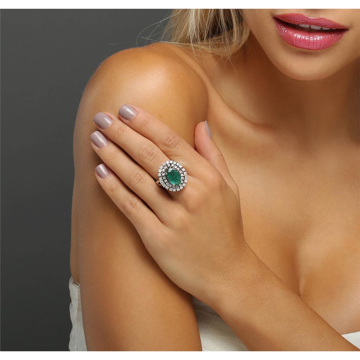 One electronically tested 14KT white gold ladies combination cast & assembled ring with a bright polish finish. Identified with markings of "K14". Condition is new. Containing: One prong set oval modified brilliant cut natural emerald, measuring 13.32 x 8.50 x 4.88mm, approximate weight of 3.16ct., clarity is heavily included, type III, medium, moderately strong, green color, (GIA G 5/4), cut is good. Forty prong set round brilliant cut diamonds, measuring 1.90 - 1.50 x 1.02mm (depth est.) approximate total weight of 40 Stones = 0.72ct. Clarity: I-1 to I-2. Color: I - J, Cut is Good. Colored gemstones are presumed to have been subjected to commonly used enhancement processes. All diamonds and colored gemstones are graded in the mounting, unless otherwise stated. Total Weight of Colored Stones 3.16ct. Total Weight of Diamonds 0.72ct. Total Weight of Ring 12.40 grams. GGL Appraised at $12,125.00.
