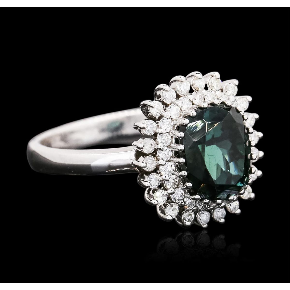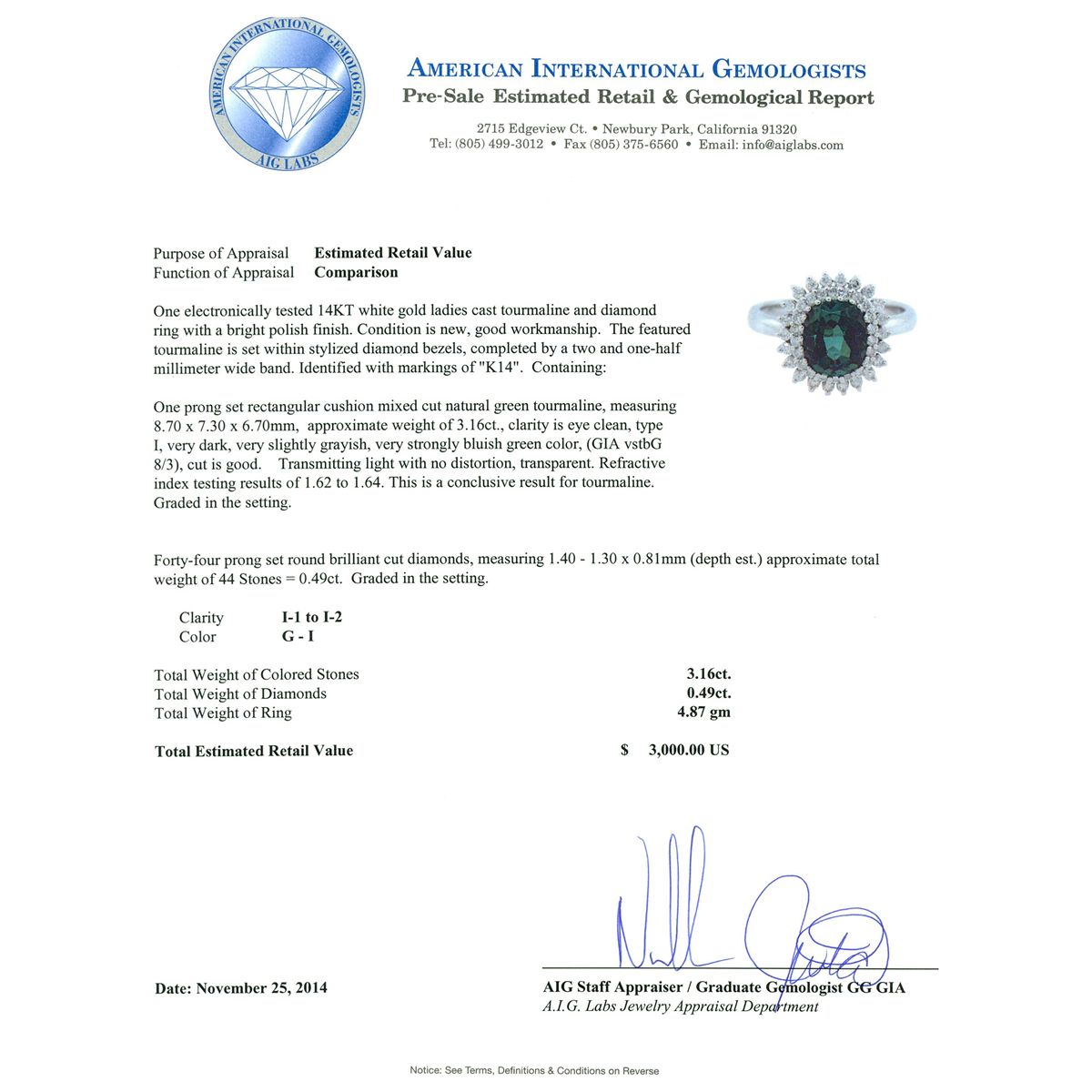 One electronically tested 14KT white gold ladies cast tourmaline and diamond ring with a bright polish finish. The featured tourmaline is set within stylized diamond bezels, completed by a two and one-half millimeter wide band. Identified with markings of "K14". Condition is new, good workmanship. Containing: One prong set rectangular cushion mixed cut natural green tourmaline, measuring 8.70 x 7.30 x 6.70mm, approximate weight of 3.16ct., clarity is eye clean, type I, very dark, very slightly grayish, very strongly bluish green color, (GIA vstbG 8/3), cut is good. Transmitting light with no distortion, transparent. Refractive index testing results of 1.62 to 1.64. This is a conclusive result for tourmaline. Graded in the setting. Forty-Four prong set round brilliant cut diamonds, measuring 1.40 - 1.30 x 0.81mm (depth est.) approximate total weight of 44 Stones = 0.49ct. Graded in the setting. Clarity: I-1 to I-2. Color: G - I. Total Weight of Colored Stones 3.16ct. Total Weight of Diamonds 0.49ct. Total Weight of Ring 4.87 grams. AIG Appraised at $3,000.00.