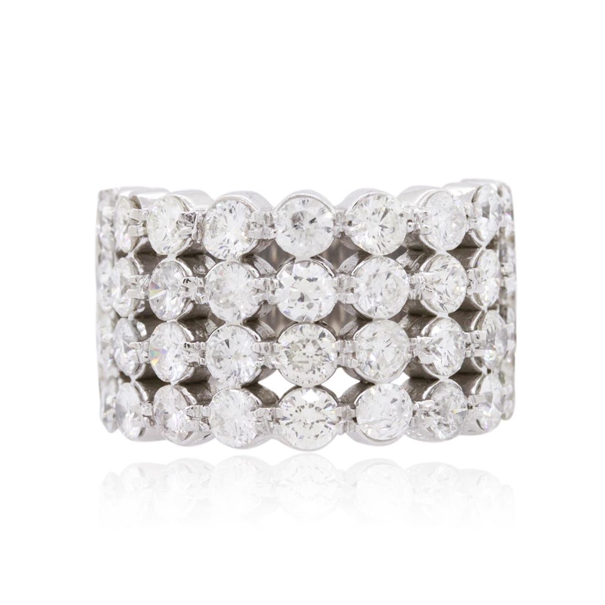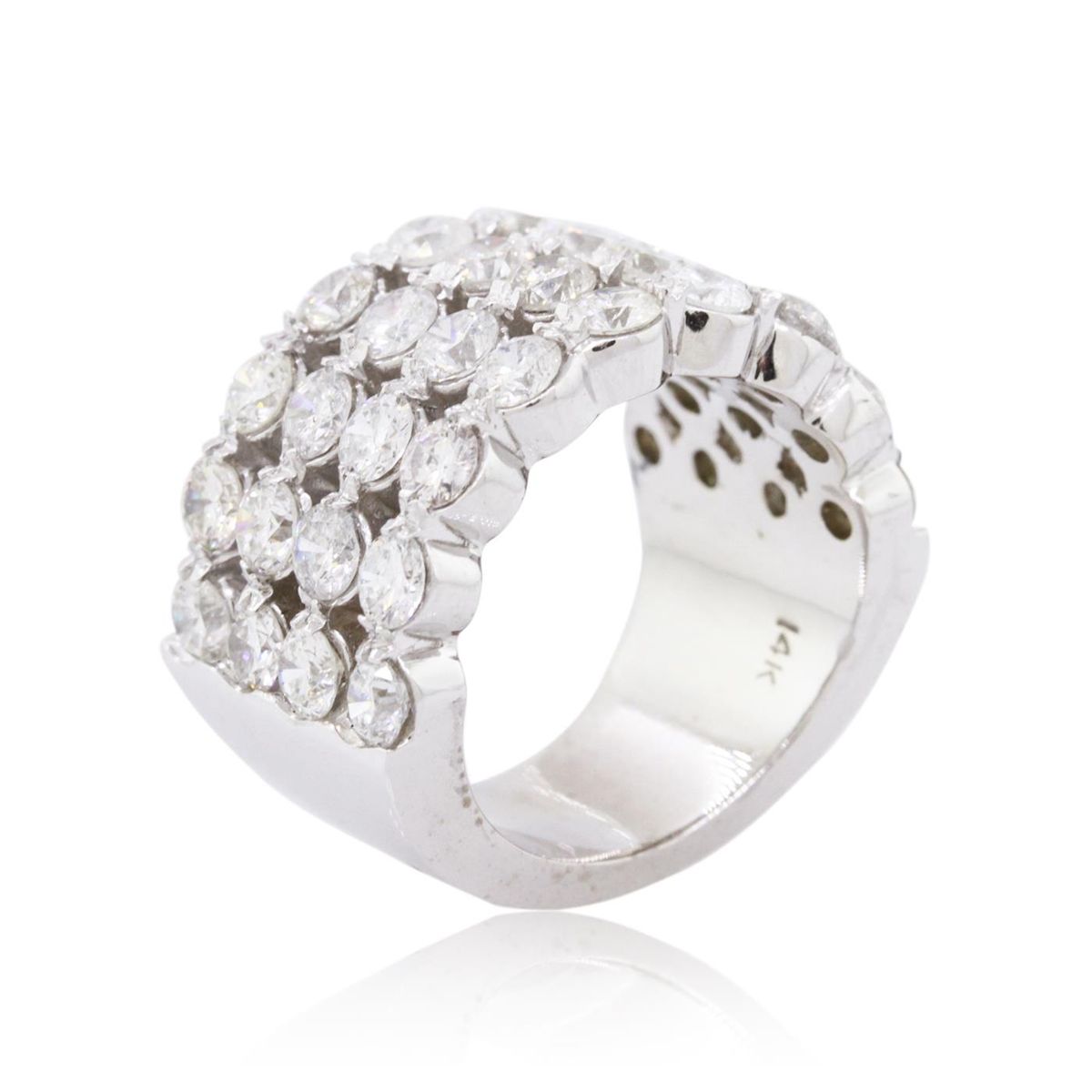 One electronically tested 14KT white gold ladies combination cast & assembled diamond ring with a bright polish finish. Identified with markings of "14K". Condition is new. Containing: Thirty-Two prong set round brilliant cut diamonds, measuring 3.00 - 3.00 x 1.80mm (depth est.) approximate total weight of 32 Stones = 3.16ct. Clarity: SI-2 to I-2. Color: I - K, Cut is Good. All diamonds are graded in the mounting, unless otherwise stated. Total Weight of Diamonds 3.16ct. Total Weight of Ring 17.10 grams. GGL Appraised at $9,610.00.