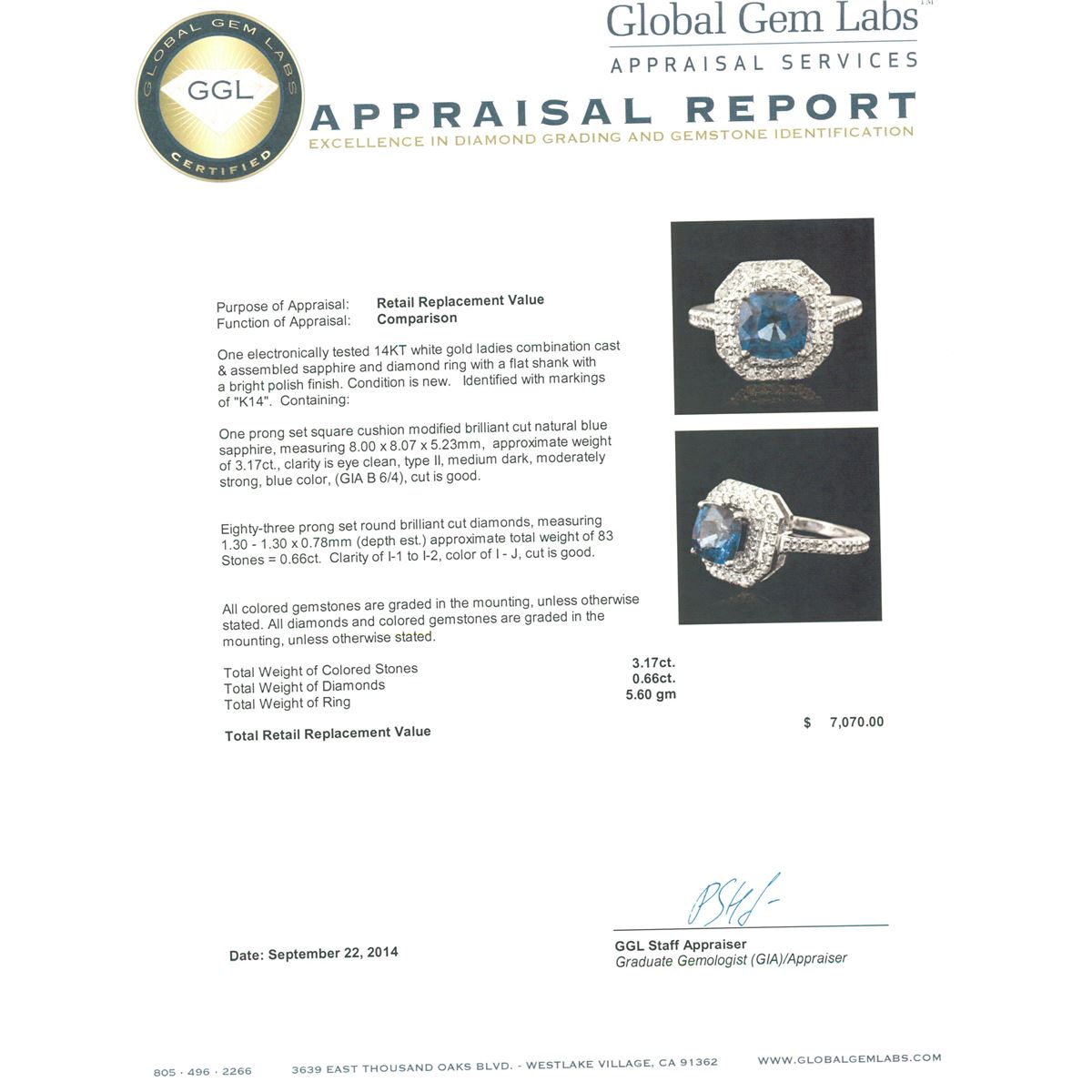One electronically tested 14KT white gold ladies combination cast & assembled sapphire and diamond ring with a flat shank with a bright polish finish. Identified with markings of "K14". Condition is new. Containing: One prong set square cushion modified brilliant cut natural blue sapphire, measuring 8.00 x 8.07 x 5.23mm, approximate weight of 3.17ct., clarity is eye clean, type II, medium dark, moderately strong, blue color, (GIA B 6/4), cut is good. Eighty-Three prong set round brilliant cut diamonds, measuring 1.30 - 1.30 x 0.78mm (depth est.) approximate total weight of 83 Stones = 0.66ct. Clarity: I-1 to I-2. Color: I - J, Cut is Good. All colored gemstones are graded in the mounting, unless otherwise stated. All diamonds and colored gemstones are graded in the mounting, unless otherwise stated. Total Weight of Colored Stones 3.17ct. Total Weight of Diamonds 0.66ct. Total Weight of Ring 5.60 grams. GGL Appraised at $7,070.00.