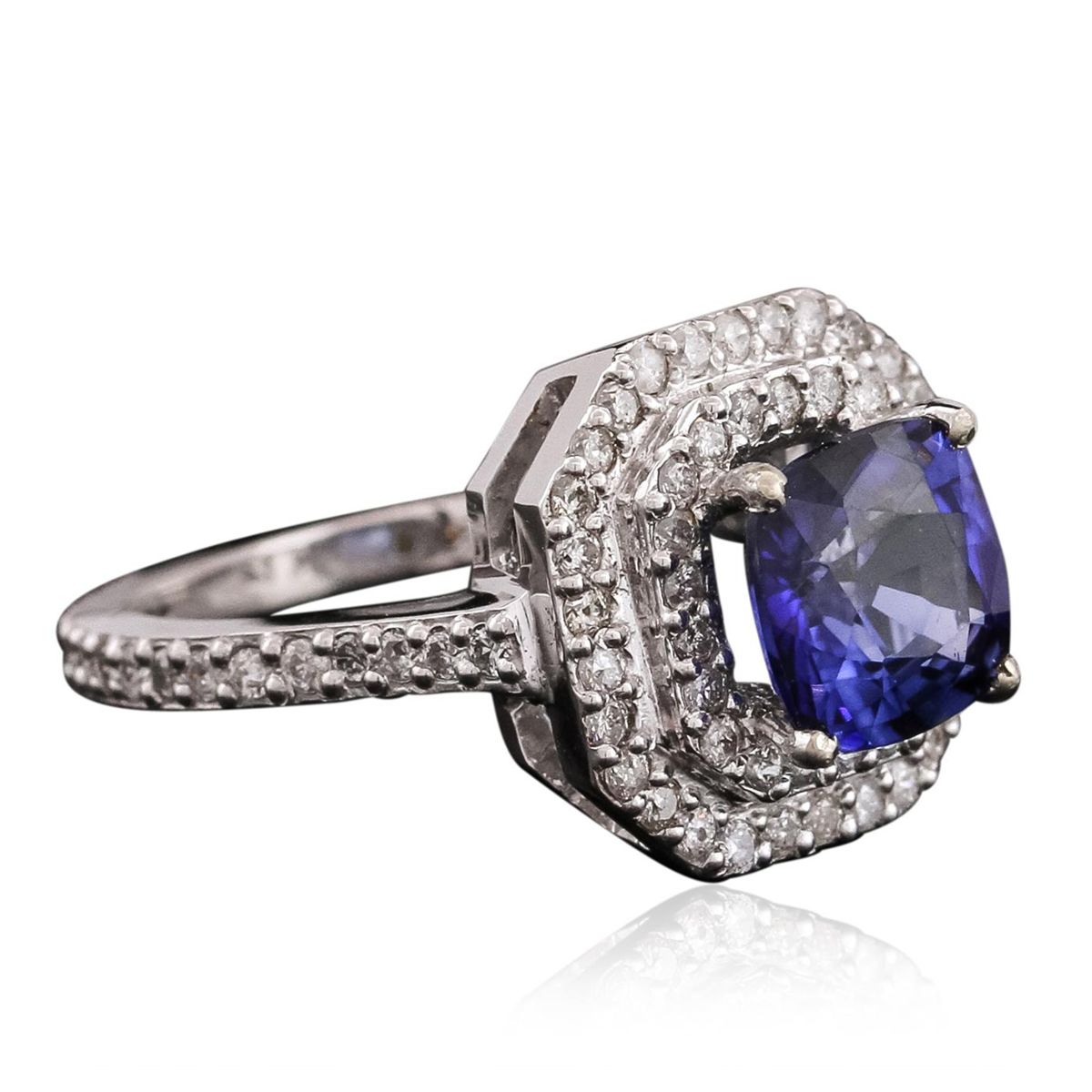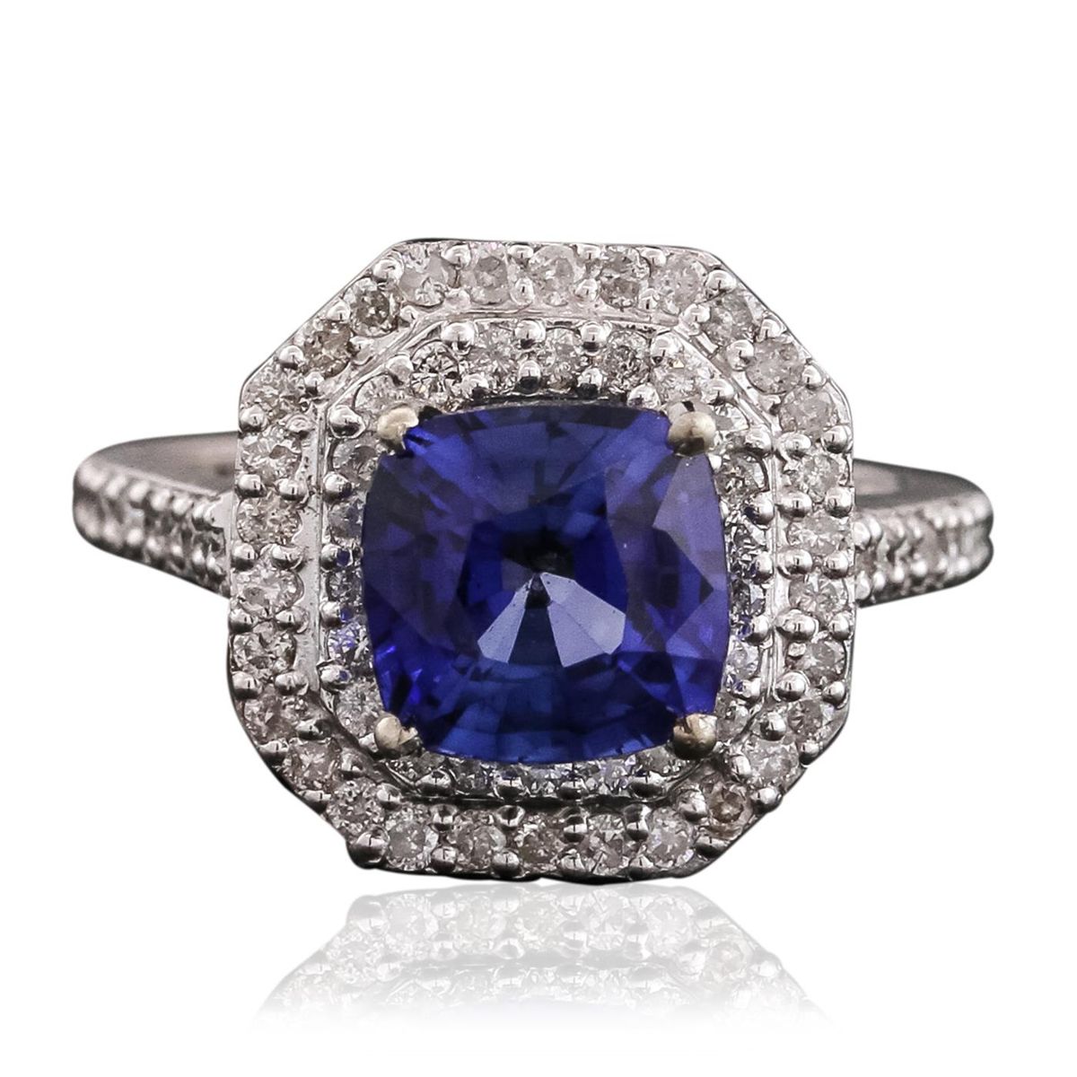 One electronically tested 14KT white gold ladies combination cast & assembled sapphire and diamond ring with a flat shank with a bright polish finish. Identified with markings of "K14". Condition is new. Containing: One prong set square cushion modified brilliant cut natural blue sapphire, measuring 8.00 x 8.07 x 5.23mm, approximate weight of 3.17ct., clarity is eye clean, type II, medium dark, moderately strong, blue color, (GIA B 6/4), cut is good. Eighty-Three prong set round brilliant cut diamonds, measuring 1.30 - 1.30 x 0.78mm (depth est.) approximate total weight of 83 Stones = 0.66ct. Clarity: I-1 to I-2. Color: I - J, Cut is Good. All colored gemstones are graded in the mounting, unless otherwise stated. All diamonds and colored gemstones are graded in the mounting, unless otherwise stated. Total Weight of Colored Stones 3.17ct. Total Weight of Diamonds 0.66ct. Total Weight of Ring 5.60 grams. GGL Appraised at $7,070.00.