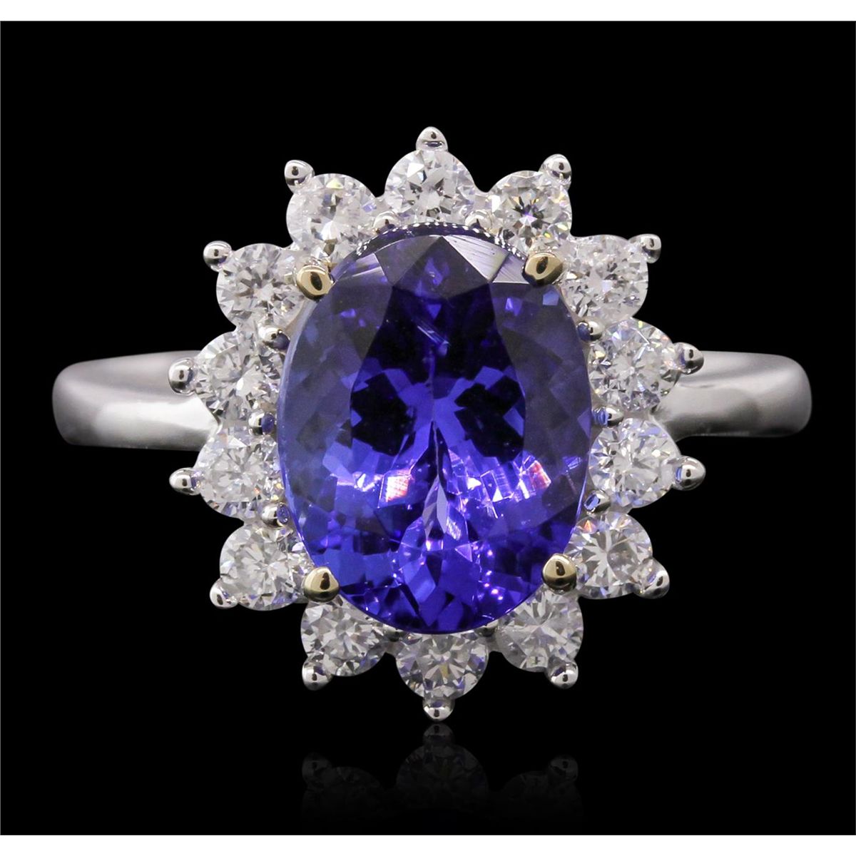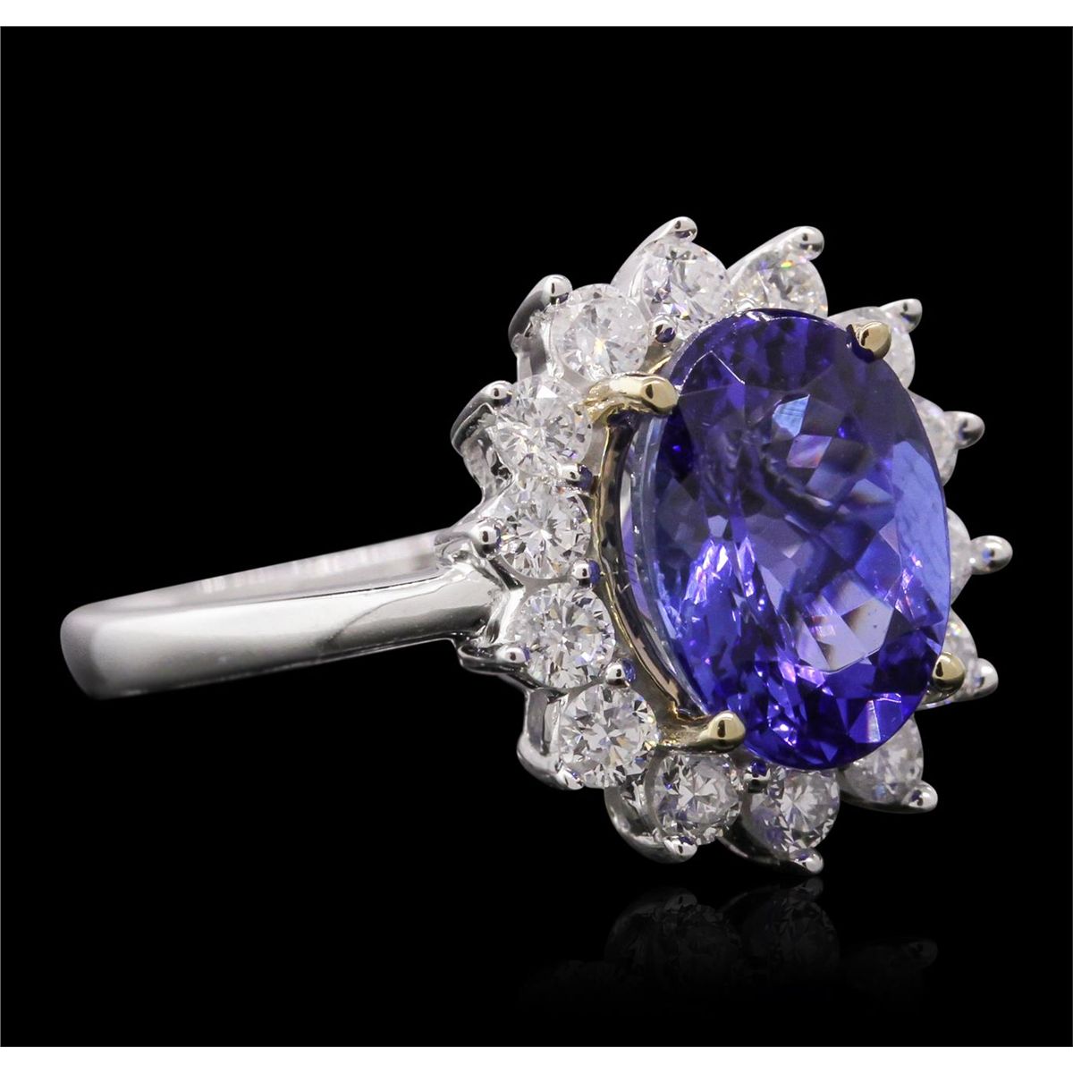 One electronically tested 14KT white gold ladies cast tanzanite and diamond ring with a bright polish finish. Condition is new, good workmanship. The featured tanzanite is set within a diamond bezel supported by tapering shoulders, completed by a two and one-half millimeter wide band. Identified with markings of "14K". Containing: One prong set oval mixed cut natural tanzanite, measuring 10.40 x 7.90 x 5.45mm, 5%. bulge factor, approximate weight of 3.17ct., clarity is eye clean, type I, medium dark, very slightly grayish, violetish blue color, (GIA vB 6/3), cut is good. Transmitting light with no distortion, transparent. Graded in the setting. Tanzanite is a very rare gemstone that is only found in the country of Tanzania. Originally discovered in 1967. Tiffany & Company, named the stone Tanzanite. It is found in the Usumburu Mountains that border the Umba Valley of northern Tanzania. Tanzanite occurs in gray, brown, violet, blue, reddish-purple, & green. The gem is interesting because of its exceptional pleochroism. Rotated in different directions a tanzanite will exhibit multiple changes of color. Tanzanite has a low tolerance to ultrasonic cleaning, and should not be cleaned using this method. Fourteen prong set round brilliant cut diamonds, measuring 2.50 - 2.40 x 1.47mm (depth est.) approximate. Total Weight of 14 Stones = 0.83ct. Graded in the setting. Clarity: SI-1 to I-1. Color: G - I. Total Weight of Colored Stones 3.17ct. Total Weight of Diamonds 0.83ct. Total Weight of Ring 4.55grams. AIG Appraised at $11,185.00.