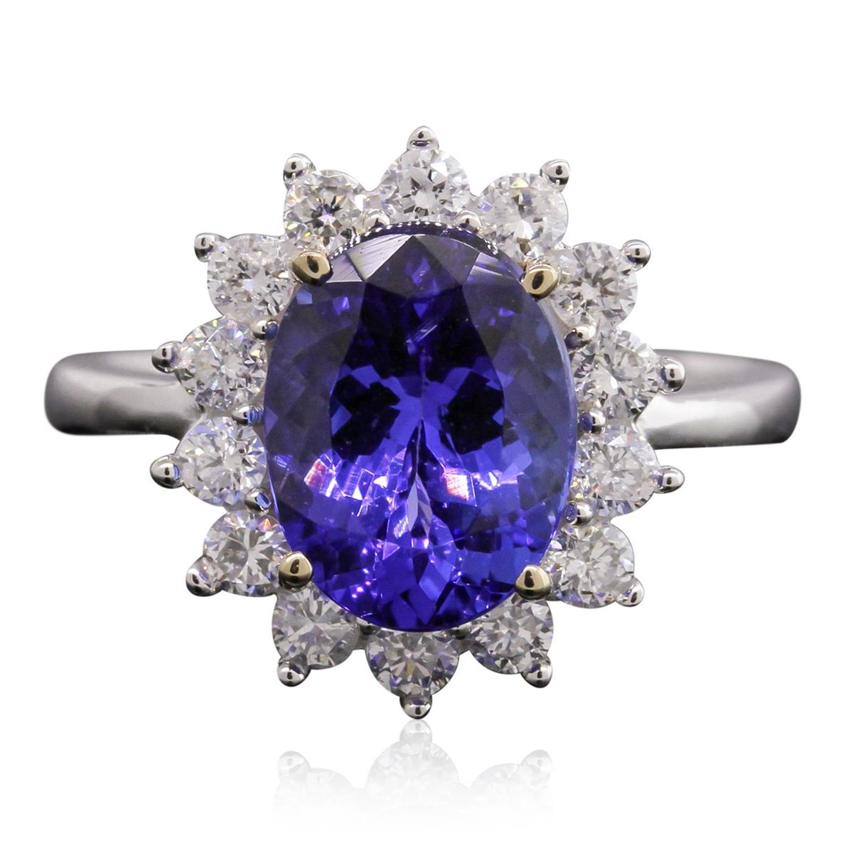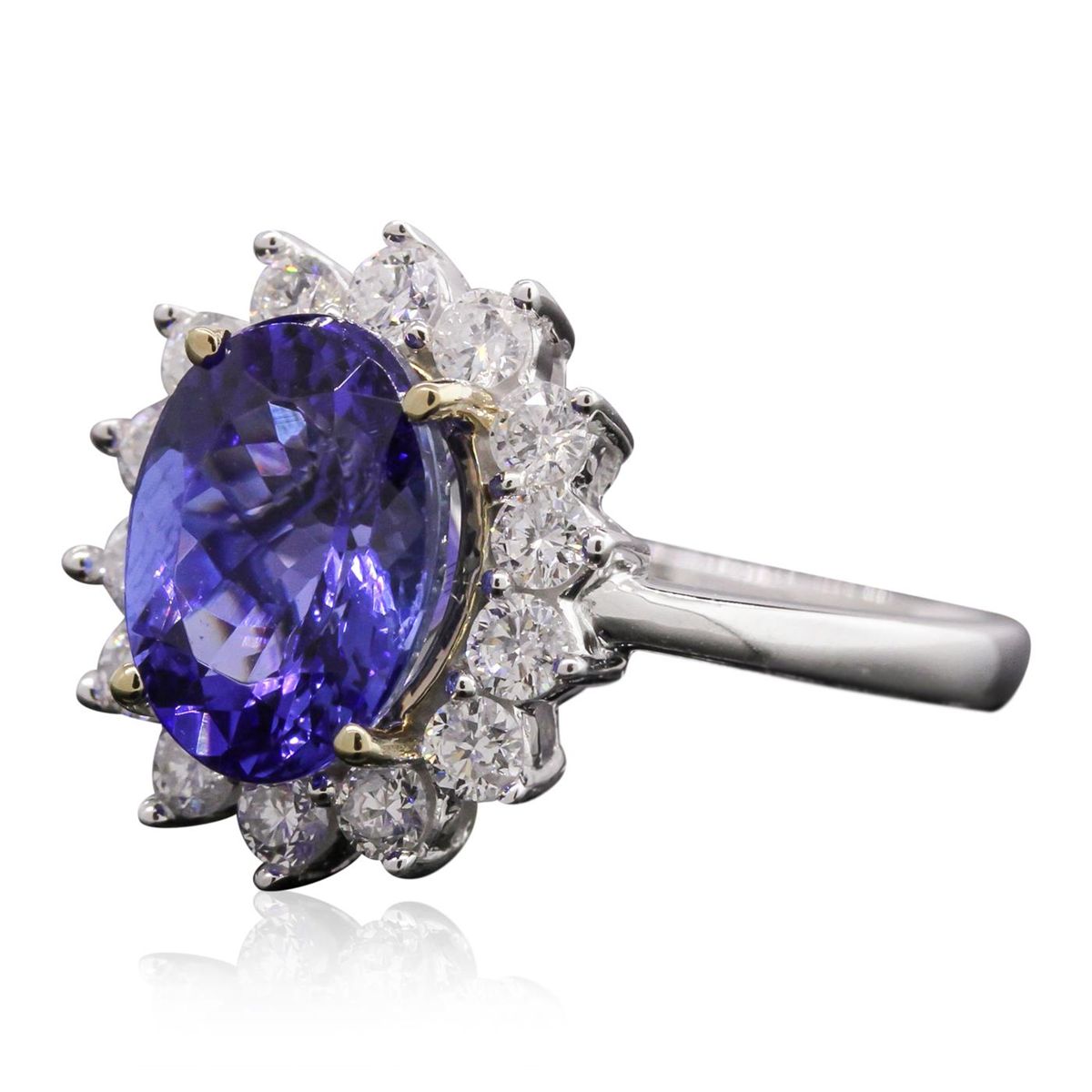 One electronically tested 14KT white gold ladies cast tanzanite and diamond ring with a bright polish finish. Condition is new, good workmanship. The featured tanzanite is set within a diamond bezel supported by tapering shoulders, completed by a two and one-half millimeter wide band. Identified with markings of "14K". Containing: One prong set oval mixed cut natural tanzanite, measuring 10.40 x 7.90 x 5.45mm, 5%. bulge factor, approximate weight of 3.17ct., clarity is eye clean, type I, medium dark, very slightly grayish, violetish blue color, (GIA vB 6/3), cut is good. Transmitting light with no distortion, transparent. Graded in the setting. Tanzanite is a very rare gemstone that is only found in the country of Tanzania. Originally discovered in 1967. Tiffany & Company, named the stone Tanzanite. It is found in the Usumburu Mountains that border the Umba Valley of northern Tanzania. Tanzanite occurs in gray, brown, violet, blue, reddish-purple, & green. The gem is interesting because of its exceptional pleochroism. Rotated in different directions a tanzanite will exhibit multiple changes of color. Tanzanite has a low tolerance to ultrasonic cleaning, and should not be cleaned using this method. Fourteen prong set round brilliant cut diamonds, measuring 2.50 - 2.40 x 1.47mm (depth est.) approximate. Total Weight of 14 Stones = 0.83ct. Graded in the setting. Clarity: SI-1 to I-1. Color: G - I. Total Weight of Colored Stones 3.17ct. Total Weight of Diamonds 0.83ct. Total Weight of Ring 4.55grams. AIG Appraised at $11,185.00.