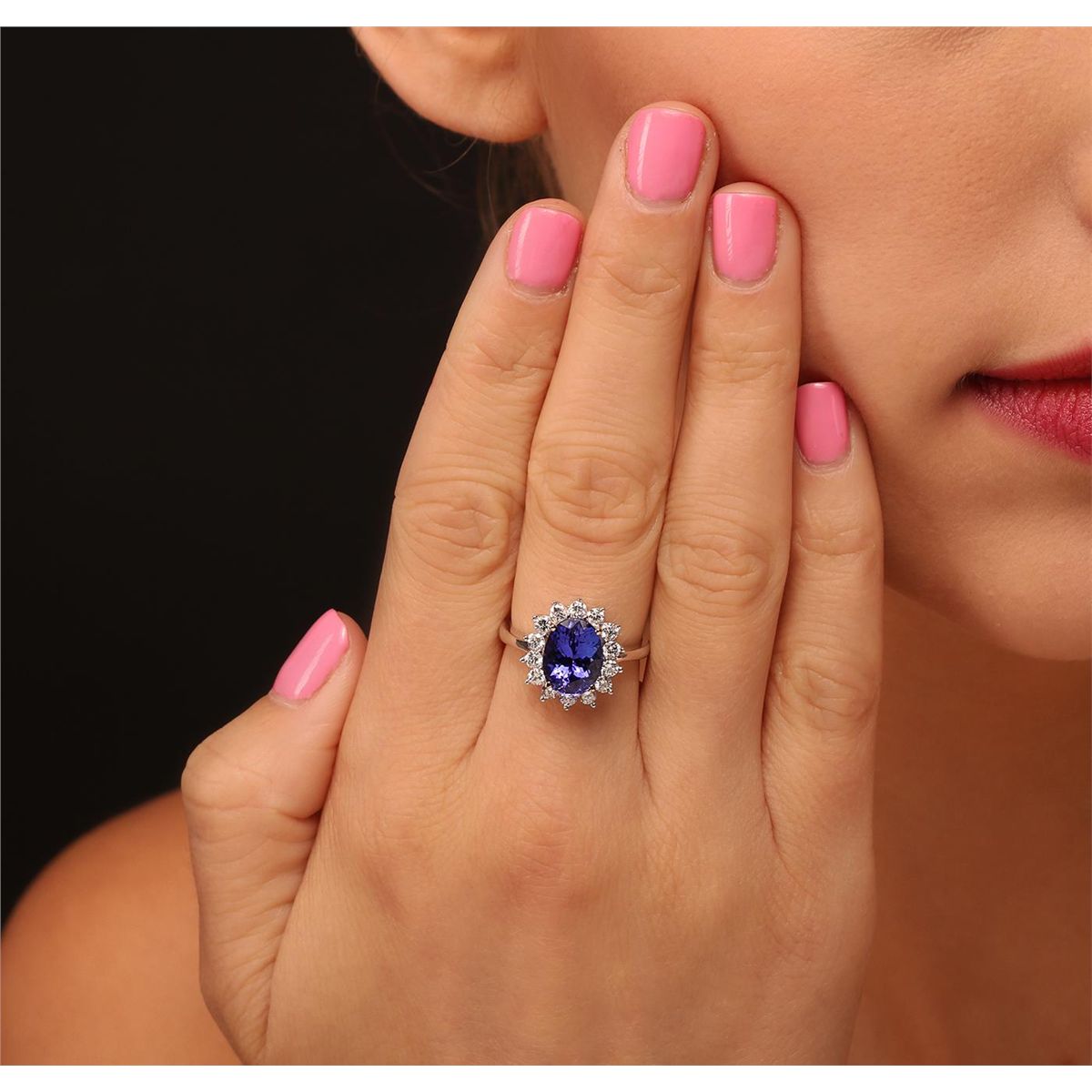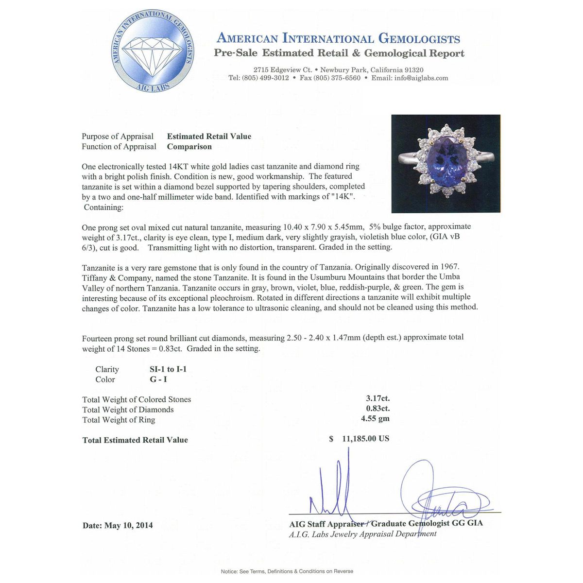 One electronically tested 14KT white gold ladies cast tanzanite and diamond ring with a bright polish finish. Condition is new, good workmanship. The featured tanzanite is set within a diamond bezel supported by tapering shoulders, completed by a two and one-half millimeter wide band. Identified with markings of "14K". Containing: One prong set oval mixed cut natural tanzanite, measuring 10.40 x 7.90 x 5.45mm, 5%. bulge factor, approximate weight of 3.17ct., clarity is eye clean, type I, medium dark, very slightly grayish, violetish blue color, (GIA vB 6/3), cut is good. Transmitting light with no distortion, transparent. Graded in the setting. Tanzanite is a very rare gemstone that is only found in the country of Tanzania. Originally discovered in 1967. Tiffany & Company, named the stone Tanzanite. It is found in the Usumburu Mountains that border the Umba Valley of northern Tanzania. Tanzanite occurs in gray, brown, violet, blue, reddish-purple, & green. The gem is interesting because of its exceptional pleochroism. Rotated in different directions a tanzanite will exhibit multiple changes of color. Tanzanite has a low tolerance to ultrasonic cleaning, and should not be cleaned using this method. Fourteen prong set round brilliant cut diamonds, measuring 2.50 - 2.40 x 1.47mm (depth est.) approximate. Total Weight of 14 Stones = 0.83ct. Graded in the setting. Clarity: SI-1 to I-1. Color: G - I. Total Weight of Colored Stones 3.17ct. Total Weight of Diamonds 0.83ct. Total Weight of Ring 4.55grams. AIG Appraised at $11,185.00.