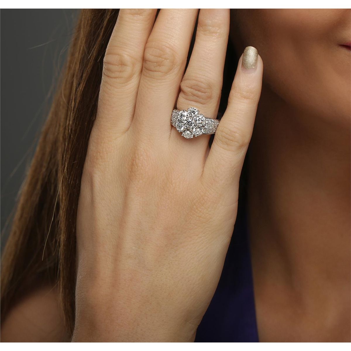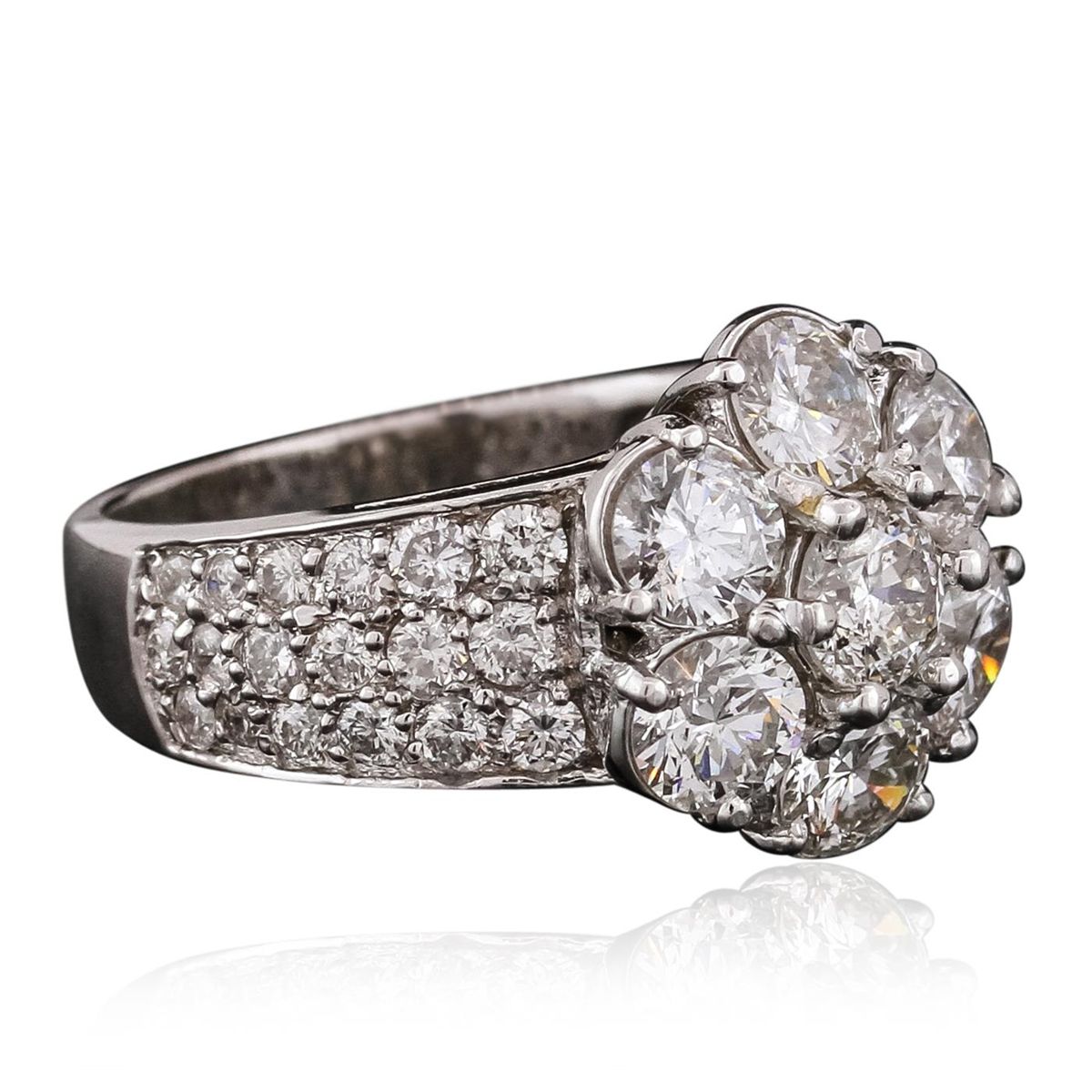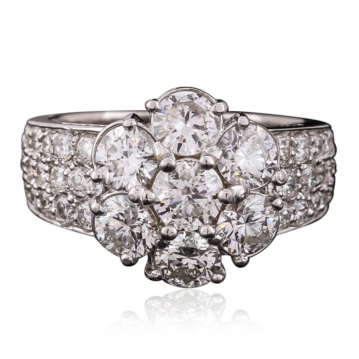 One electronically tested 14KT white gold ladies combination cast & assembled ring with a bright polish finish. Identified with markings of "K14". Condition is new. Containing: Seven prong set round brilliant cut diamonds, measuring 4.50 - 4.50 x 2.70mm (depth est.) approximate total weight of 7 Stones = 2.34ct. Clarity: SI-1 to I-1. Color: J - K, Cut is Good. Thirty-Six prong set round brilliant cut diamonds, measuring 2.00 - 1.70 x 1.11mm (depth est.) approximate total weight of 36 Stones = 0.83ct. Clarity: SI-2 to I-1. Color: I - J, Cut is Good. All diamonds are graded in the mounting, unless otherwise stated. Total Weight of Diamonds 3.17ct. Total Weight of Ring 6.70 grams. GGL Appraised at $13,580.00.