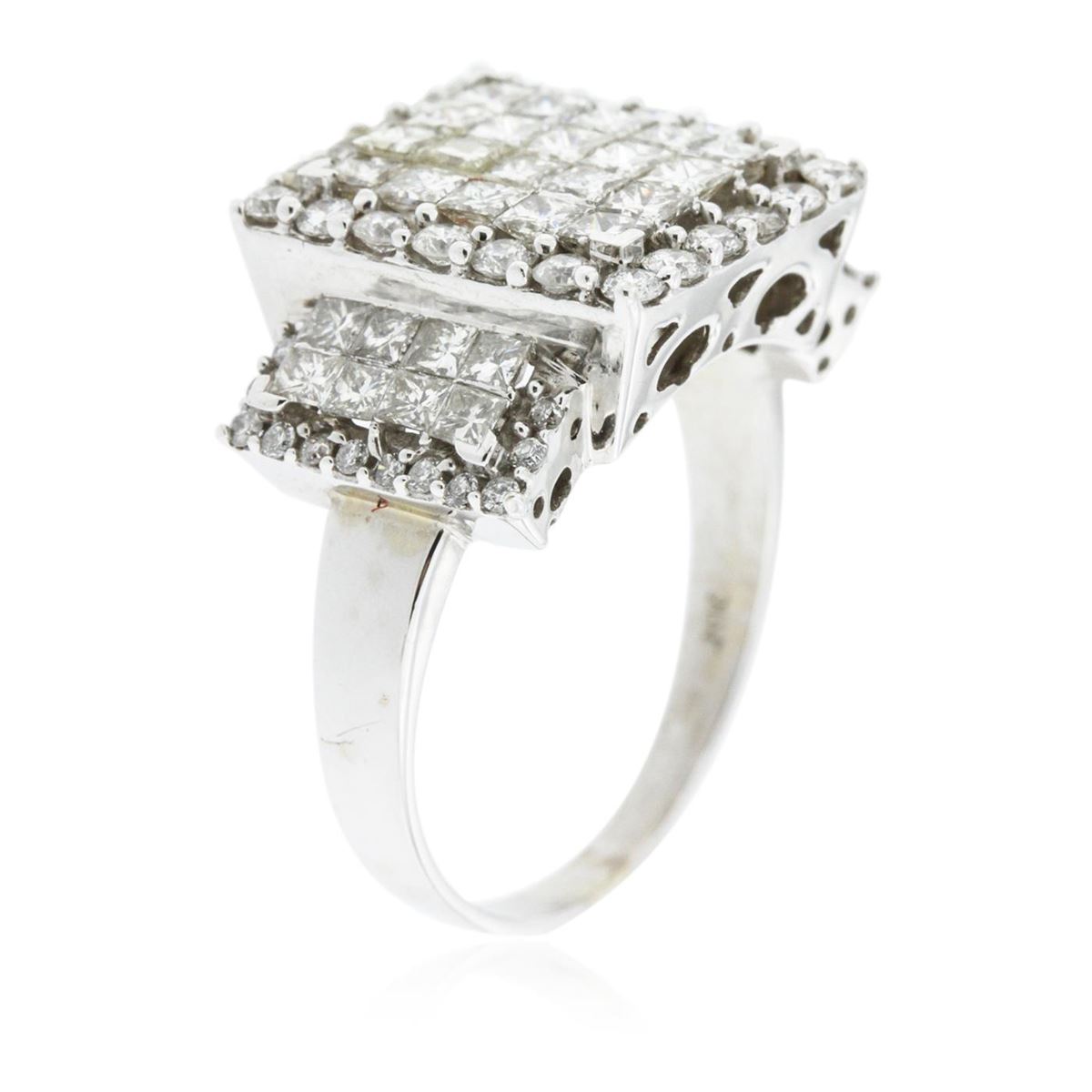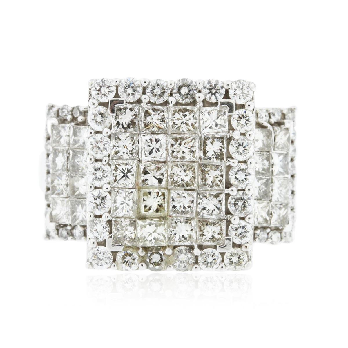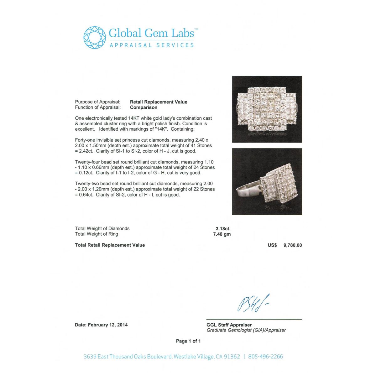 One electronically tested 14KT white gold Ladies combination cast & assembled cluster ring with a bright polish finish. Condition is excellent. Identified with markings of "14K". Containing: Forty-One invisible set princess cut diamonds, measuring 2.40 x 2.00 x 1.50mm (depth est.) approximate total weight of 41 Stones = 2.42ct. Clarity of SI-1 to SI-2, Color of H - J, Cut is Good. Twenty-Four bead set round brilliant cut diamonds, measuring 1.10 - 1.10 x 0.66mm (depth est.) approximate total weight of 24 Stones = 0.12ct. Clarity of I-1 to I-2, Color of G - H, Cut is Very Good. Twenty-Two bead set round brilliant cut diamonds, measuring 2.00 - 2.00 x 1.20mm (depth est.) approximate total weight of 22 Stones = 0.64ct. Clarity of SI-2, Color of H - I, Cut is Good. Total Weight of Diamonds 3.18ct. Total Weight of Ring 7.40gm. GGL Appraised at $9,780.00.