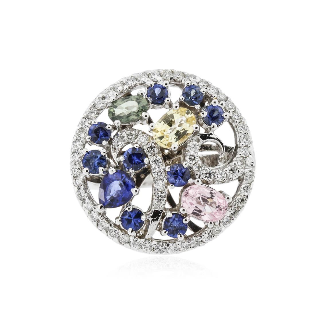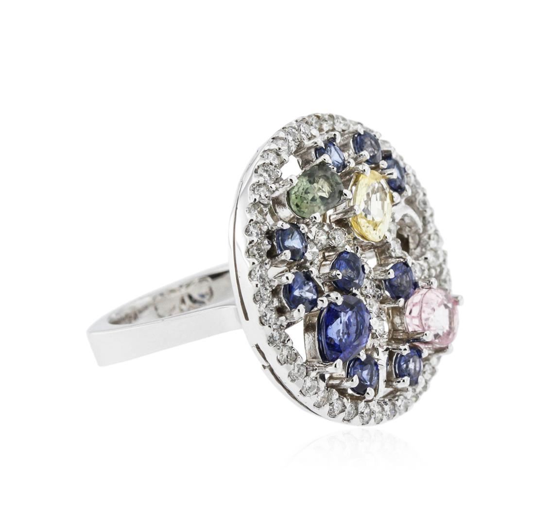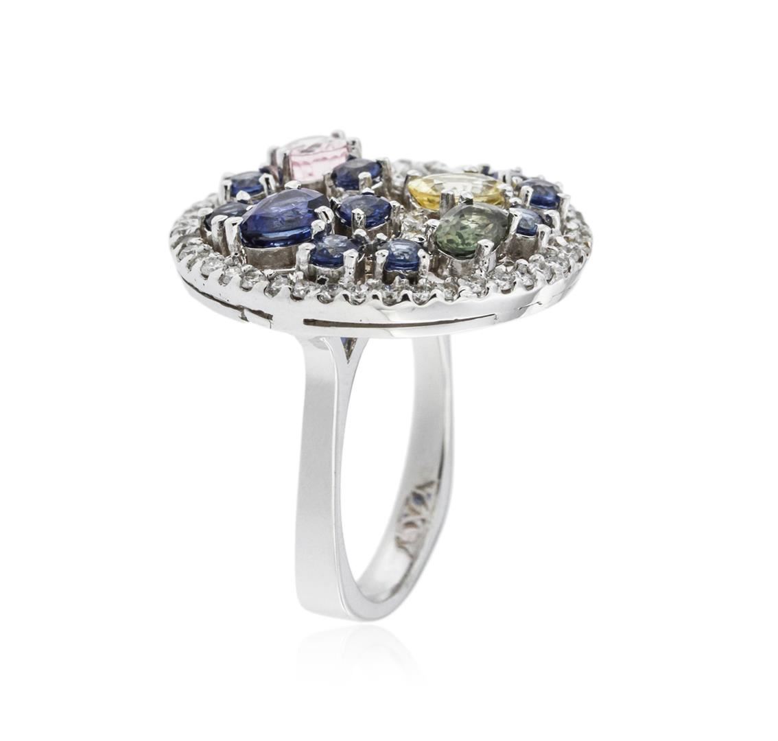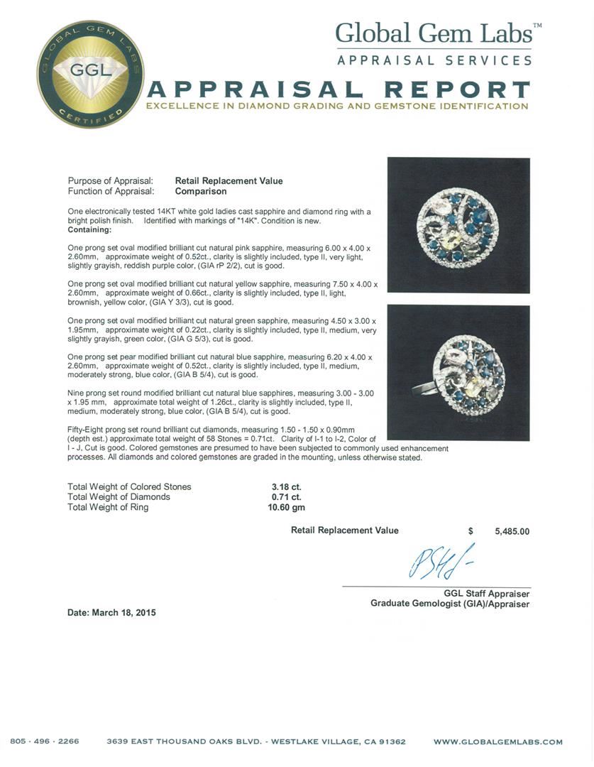 One electronically tested 14KT white gold ladies cast sapphire and diamond ring with a bright polish finish. Identified with markings of "14K". Condition is new. Containing: One prong set oval modified brilliant cut natural pink sapphire, measuring 6.00 x 4.00 x 2.60mm, approximate weight of 0.52ct., clarity is slightly included, type II, very light, slightly grayish, reddish purple color, (GIA rP 2/2), cut is good. One prong set oval modified brilliant cut natural yellow sapphire, measuring 7.50 x 4.00 x 2.60mm, approximate weight of 0.66ct., clarity is slightly included, type II, light, brownish, yellow color, (GIA Y 3/3), cut is good. One prong set oval modified brilliant cut natural green sapphire, measuring 4.50 x 3.00 x 1.95mm, approximate weight of 0.22ct., clarity is slightly included, type II, medium, very slightly grayish, green color, (GIA G 5/3), cut is good. One prong set pear modified brilliant cut natural blue sapphire, measuring 6.20 x 4.00 x 2.60mm, approximate weight of 0.52ct., clarity is slightly included, type II, medium, moderately strong, blue color, (GIA B 5/4), cut is good. Nine prong set round modified brilliant cut natural blue sapphires, measuring 3.00 - 3.00 x 1.95 mm, approximate total weight of 1.26ct., clarity is slightly included, type II, medium, moderately strong, blue color, (GIA B 5/4), cut is good. Fifty-Eight prong set round brilliant cut diamonds, measuring 1.50 - 1.50 x 0.90mm (depth est.) approximate total weight of 58 Stones = 0.71ct. Clarity of I-1 to I-2, Color of I - J, Cut is Good. Colored gemstones are presumed to have been subjected to commonly used enhancement processes. All diamonds and colored gemstones are graded in the mounting, unless otherwise stated. Total Weight of Colored Stones 3.18ct. Total Weight of Diamonds 0.71ct. Total Weight of Ring 10.60 grams. GGL Appraised at $5,485.00.