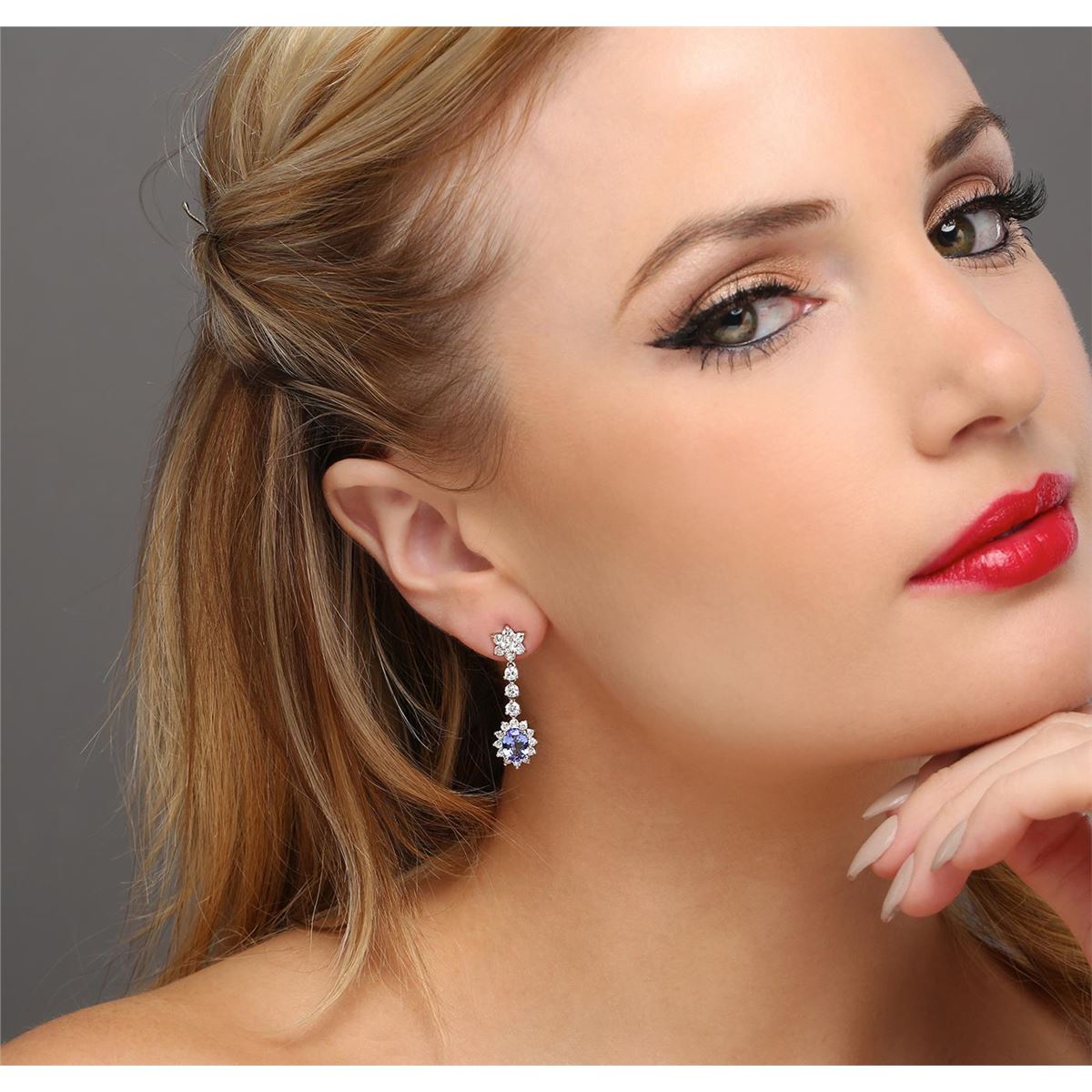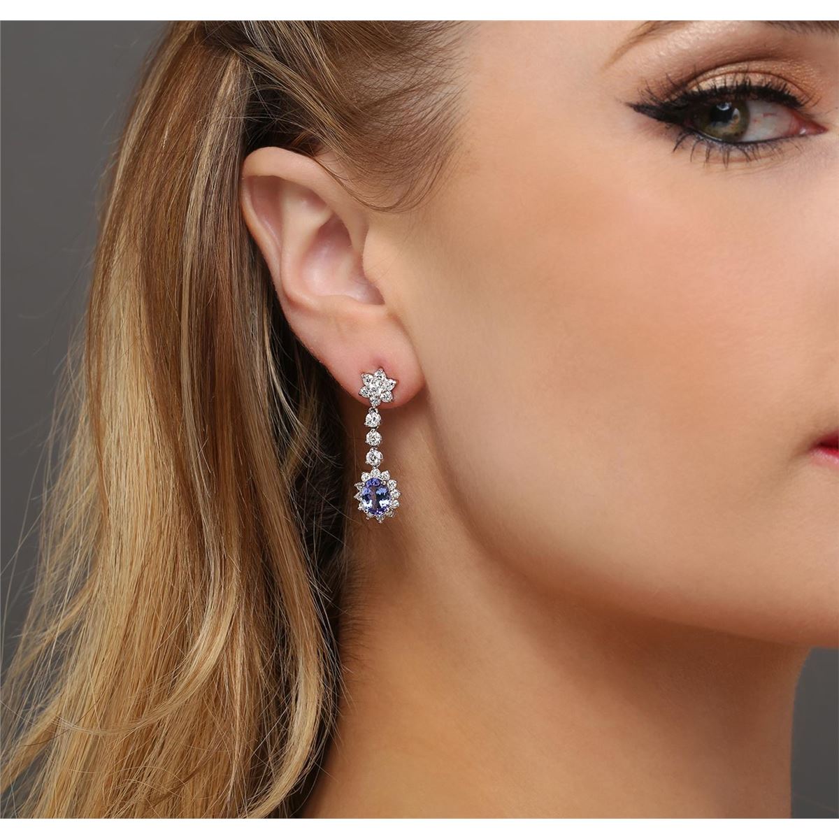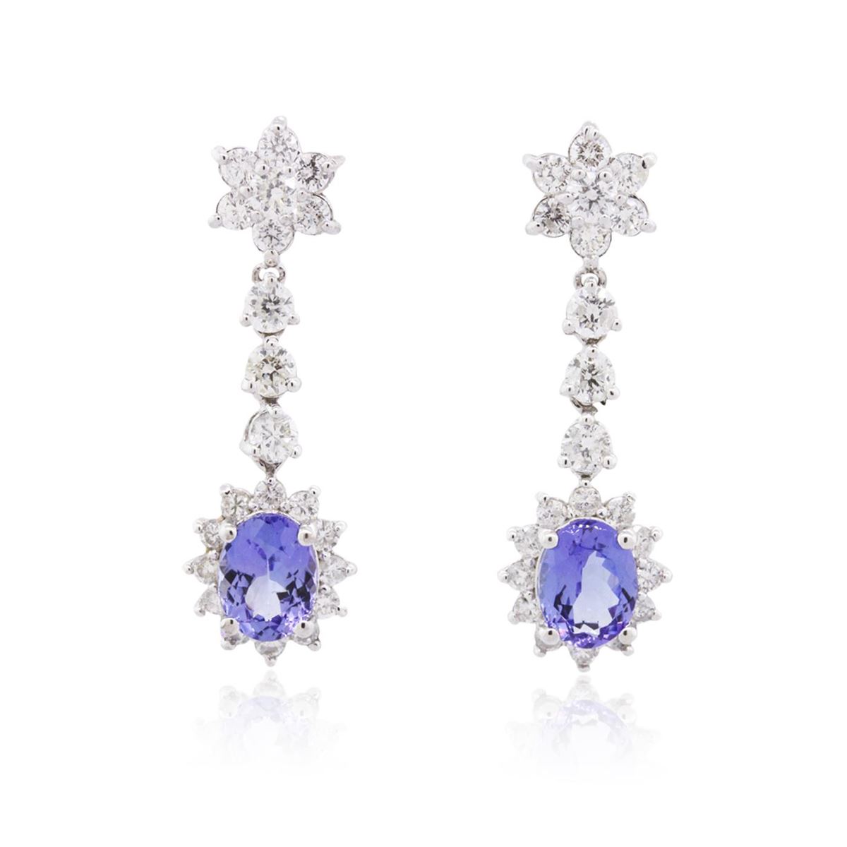 One pair electronically tested 14KT white gold ladies combination cast & assembled tanzanite and diamond earrings with friction posts with a bright polish finish. Identified with markings of "14K". Condition is new. Containing: Two prong set oval modified brilliant cut natural tanzanites, measuring 8.00 x 6.00 x 3.90mm, approximate total weight of 3.18ct., clarity is eye clean, medium, very slightly grayish, violet color, (GIA V 5/3), cut is good. Forty-Two prong set round brilliant cut diamonds, measuring 3.00 - 2.00 x 1.50mm (depth est.) approximate total weight of 42 Stones = 2.40ct. Clarity: SI-2 to I-1. Color: H - I, Cut is Good. Colored gemstones are presumed to have been subjected to commonly used enhancement processes. All diamonds and colored gemstones are graded in the mounting, unless otherwise stated. Total Weight of Colored Stones 3.18ct. Total Weight of Diamonds 2.40ct. Total Weight of Earrings 5.00 grams. GGL Appraised at $8,920.00.