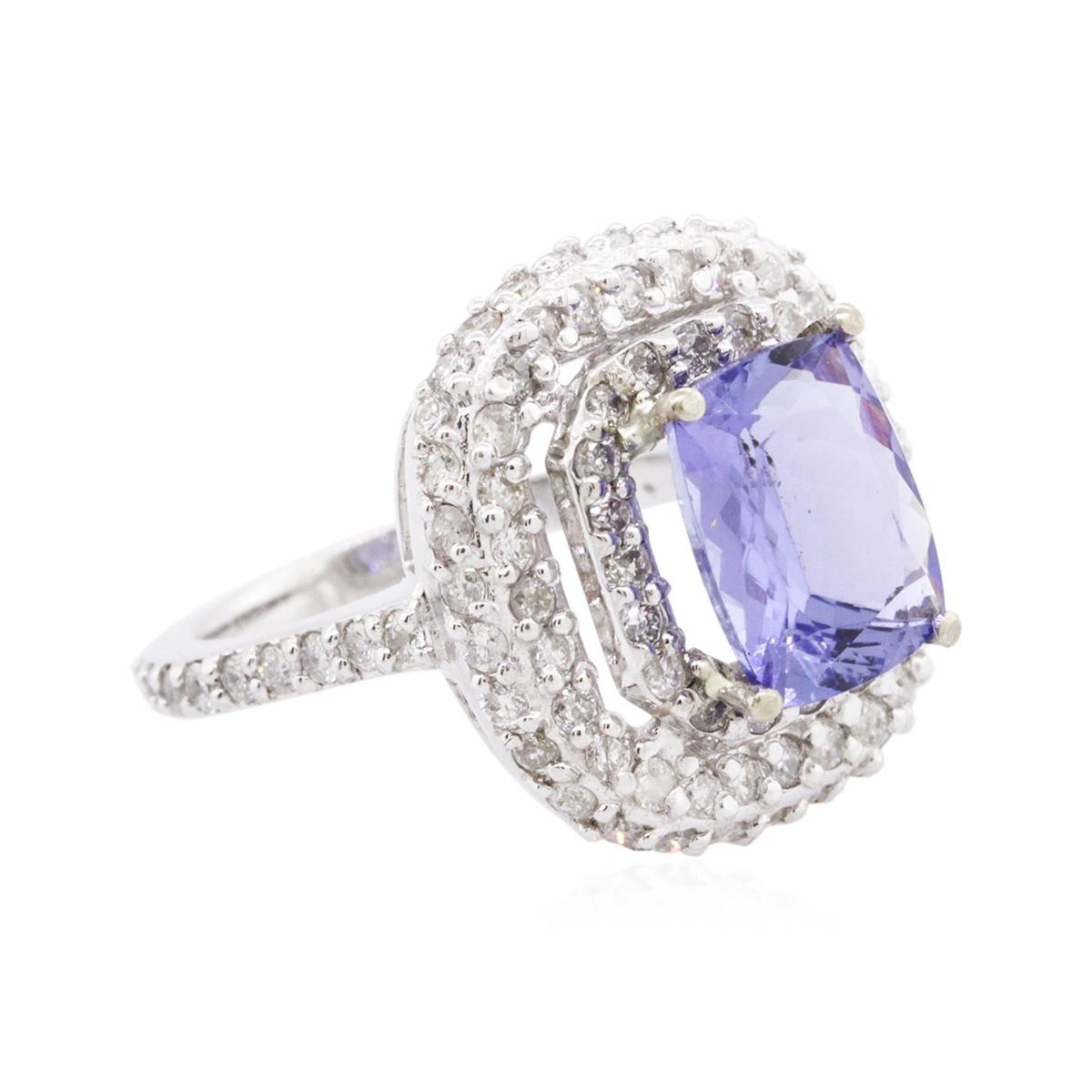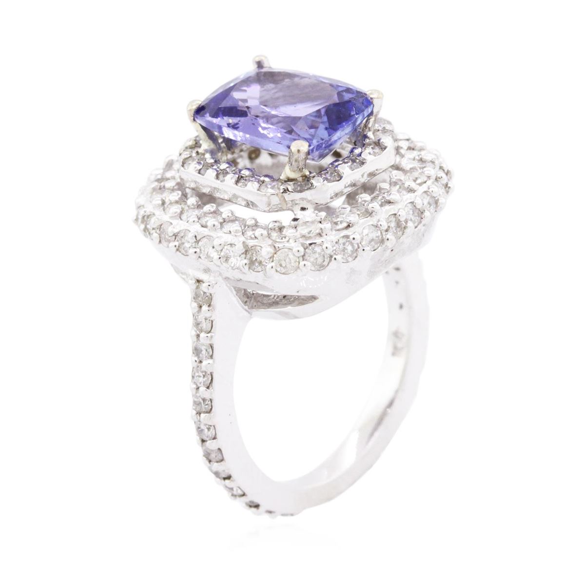 One electronically tested 14KT white gold ladies combination cast & assembled tanzanite and diamond ring with a flat shank with a bright polish finish. Identified with markings of "14K". Condition is new. Containing: One prong set rectangular cushion modified brilliant cut natural tanzanite, measuring 10.40 x 8.16 x 4.76mm, approximate weight of 3.18ct., clarity is eye clean, type I, medium light, very slightly grayish, violet color, (GIA V 4/3), cut is good. One Hundred Three prong set round brilliant cut diamonds, measuring 1.70 - 1.20 x 0.87mm (depth est.) approximate total weight of 103 Stones = 1.14ct. Clarity: I-1 to I-2. Color: I - J, Cut is Good. Colored gemstones are presumed to have been subjected to commonly used enhancement processes. All diamonds and colored gemstones are graded in the mounting, unless otherwise stated. Total Weight of Colored Stones 3.18ct. Total Weight of Diamonds 1.14ct. Total Weight of Ring 9.60 grams. GGL Appraised at $9,565.00.
