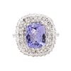 One electronically tested 14KT white gold ladies combination cast & assembled tanzanite and diamond ring with a flat shank with a bright polish finish. Identified with markings of "14K". Condition is new. Containing: One prong set rectangular cushion modified brilliant cut natural tanzanite, measuring 10.40 x 8.16 x 4.76mm, approximate weight of 3.18ct., clarity is eye clean, type I, medium light, very slightly grayish, violet color, (GIA V 4/3), cut is good. One Hundred Three prong set round brilliant cut diamonds, measuring 1.70 - 1.20 x 0.87mm (depth est.) approximate total weight of 103 Stones = 1.14ct. Clarity: I-1 to I-2. Color: I - J, Cut is Good. Colored gemstones are presumed to have been subjected to commonly used enhancement processes. All diamonds and colored gemstones are graded in the mounting, unless otherwise stated. Total Weight of Colored Stones 3.18ct. Total Weight of Diamonds 1.14ct. Total Weight of Ring 9.60 grams. GGL Appraised at $9,565.00.