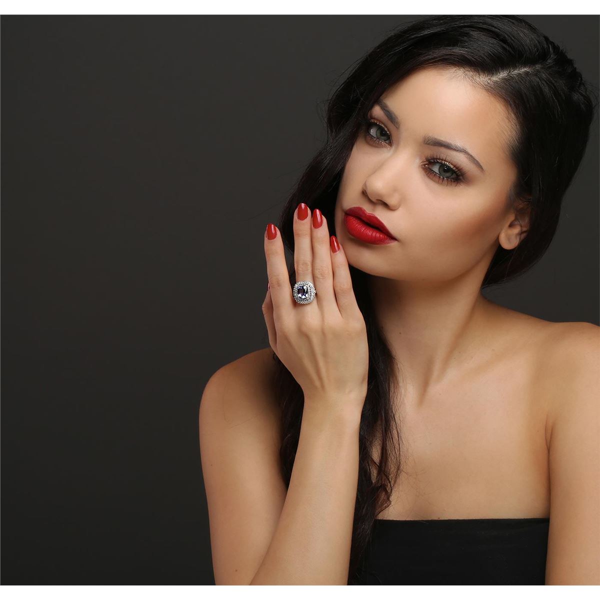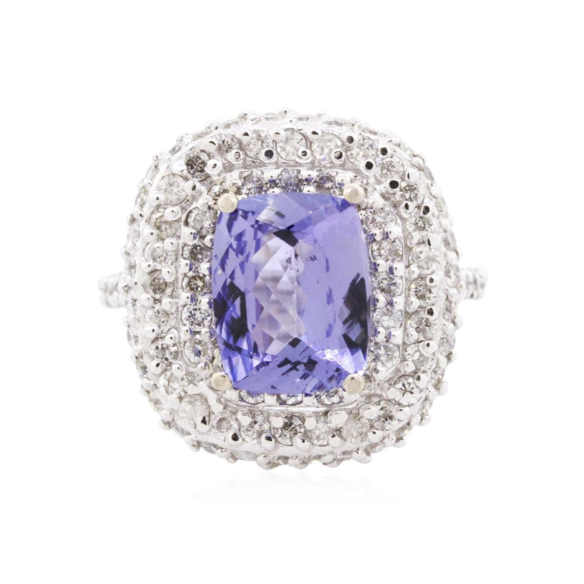 One electronically tested 14KT white gold ladies combination cast & assembled tanzanite and diamond ring with a flat shank with a bright polish finish. Identified with markings of "14K". Condition is new. Containing: One prong set rectangular cushion modified brilliant cut natural tanzanite, measuring 10.40 x 8.16 x 4.76mm, approximate weight of 3.18ct., clarity is eye clean, type I, medium light, very slightly grayish, violet color, (GIA V 4/3), cut is good. One Hundred Three prong set round brilliant cut diamonds, measuring 1.70 - 1.20 x 0.87mm (depth est.) approximate total weight of 103 Stones = 1.14ct. Clarity: I-1 to I-2. Color: I - J, Cut is Good. Colored gemstones are presumed to have been subjected to commonly used enhancement processes. All diamonds and colored gemstones are graded in the mounting, unless otherwise stated. Total Weight of Colored Stones 3.18ct. Total Weight of Diamonds 1.14ct. Total Weight of Ring 9.60 grams. GGL Appraised at $9,565.00.