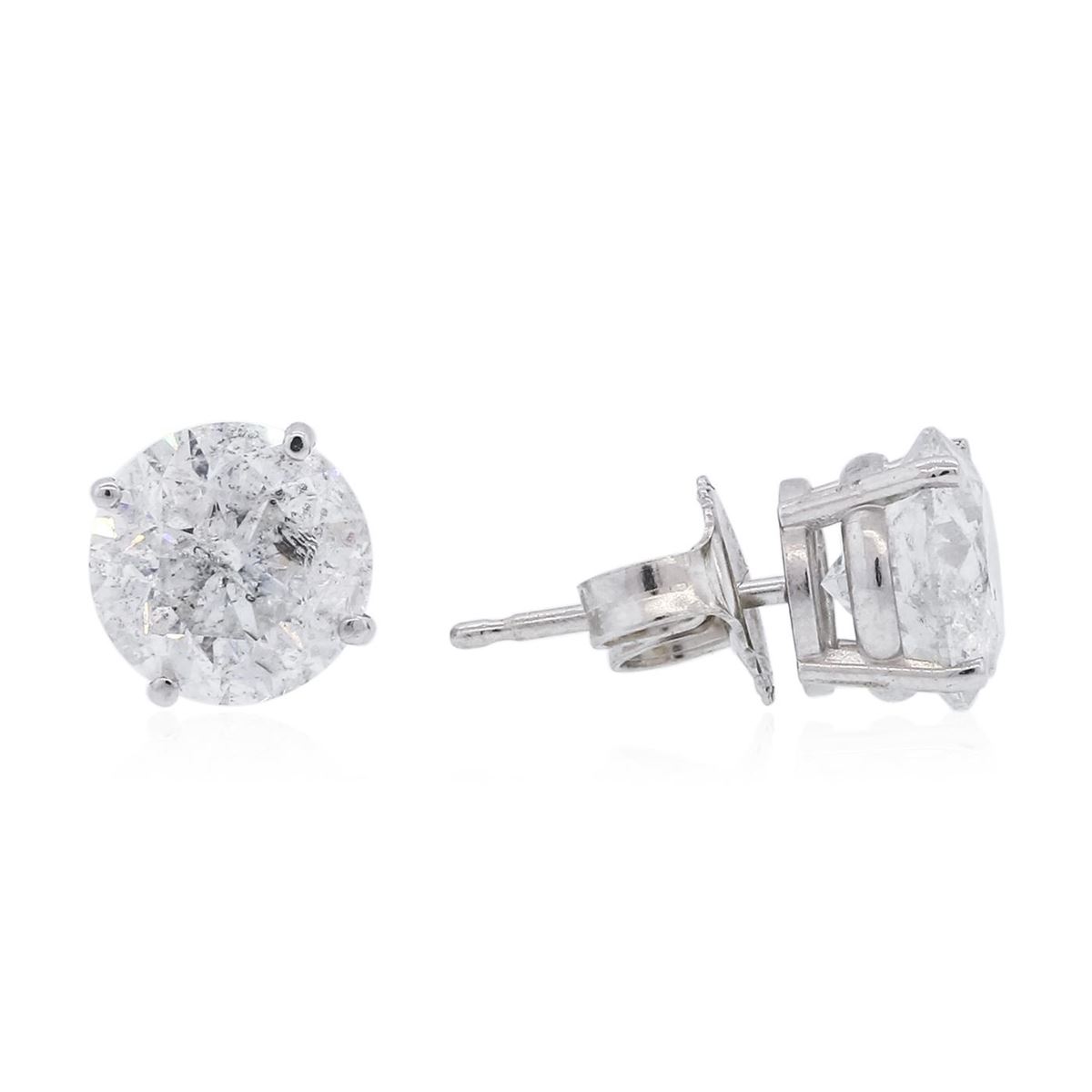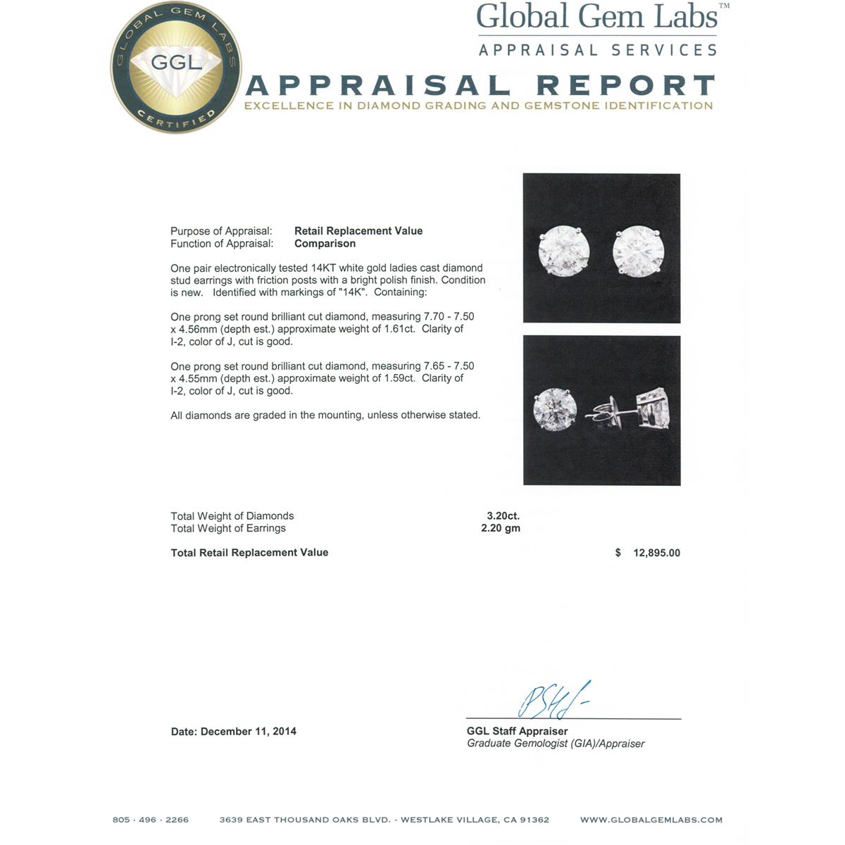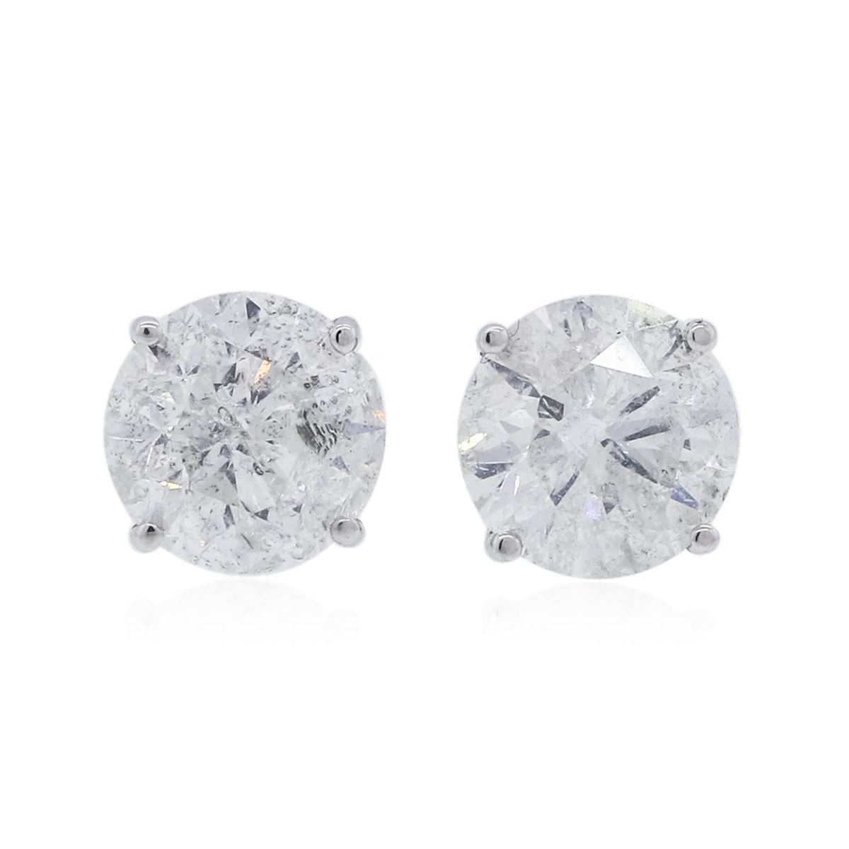 One pair electronically tested 14KT white gold ladies cast diamond stud earrings with friction posts with a bright polish finish. Identified with markings of "14K". Condition is new. Containing: One prong set round brilliant cut diamond, measuring 7.70 - 7.50 x 4.56mm (depth est.) approximate weight of 1.61ct. Clarity: I-2. Color: J, Cut is Good. One prong set round brilliant cut diamond, measuring 7.65 - 7.50 x 4.55mm (depth est.) approximate weight of 1.59ct. Clarity: I-2. Color: J, Cut is Good. All diamonds are graded in the mounting, unless otherwise stated. Total Weight of Diamonds 3.20ct. Total Weight of Earrings 2.20 grams. GGL Appraised at $12,895.00.