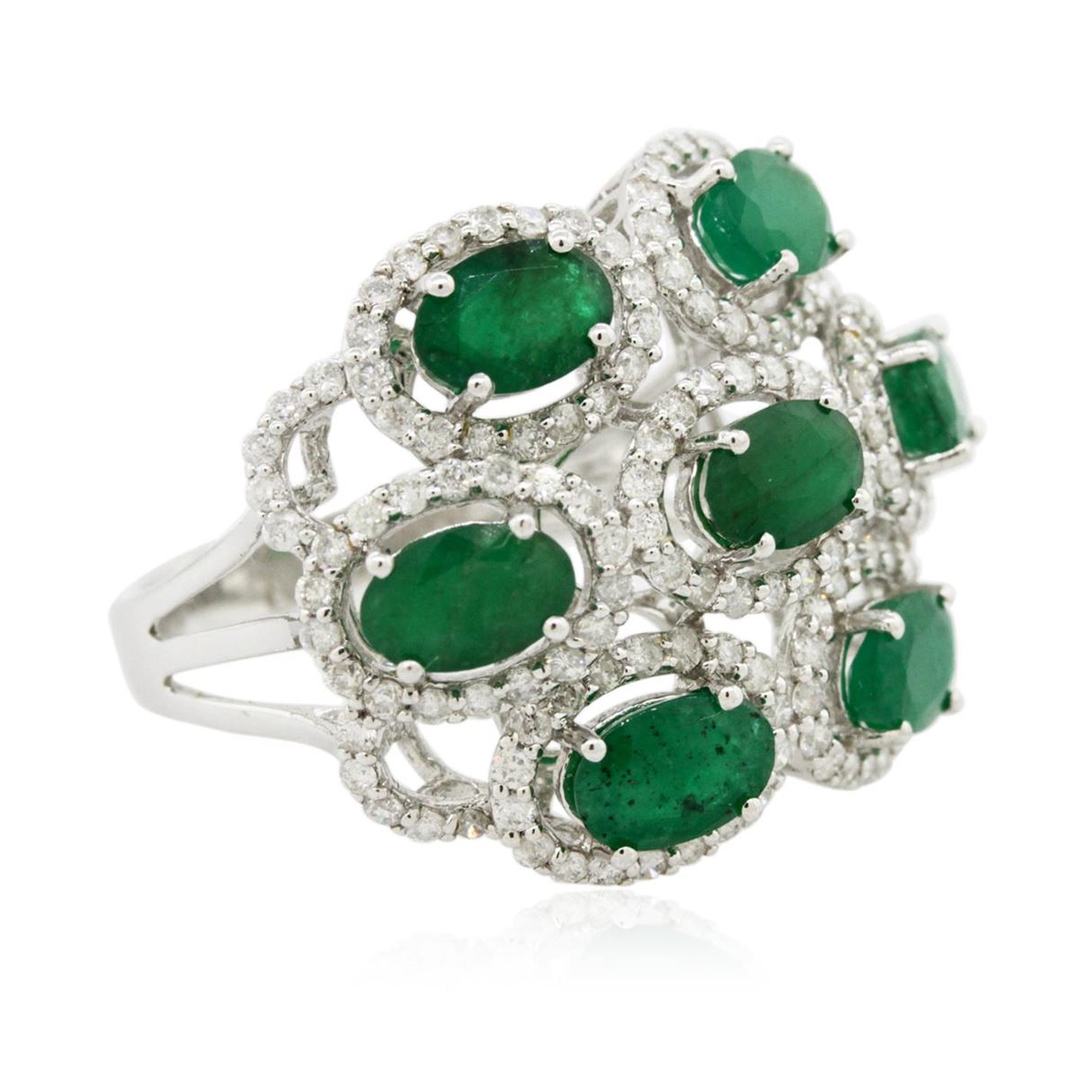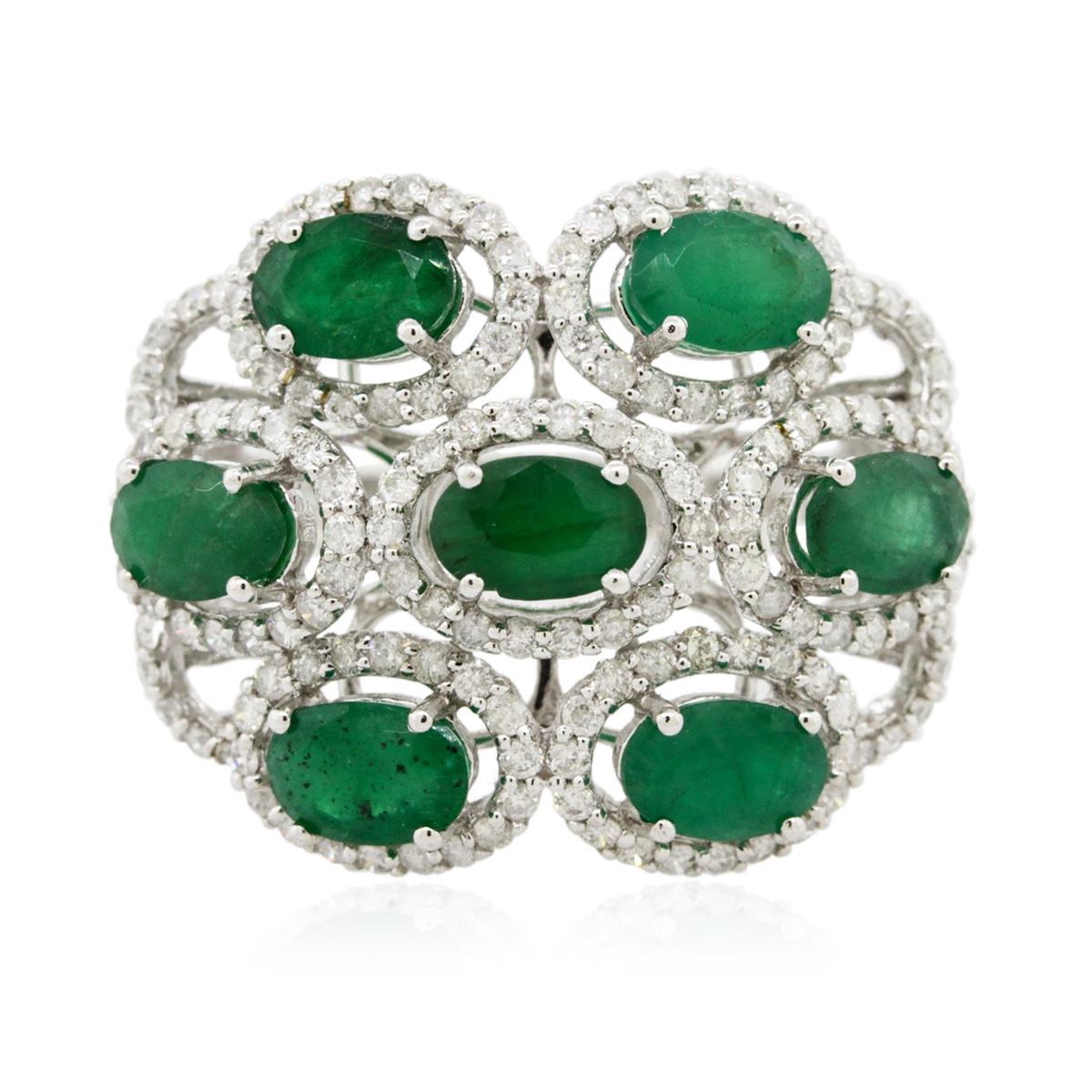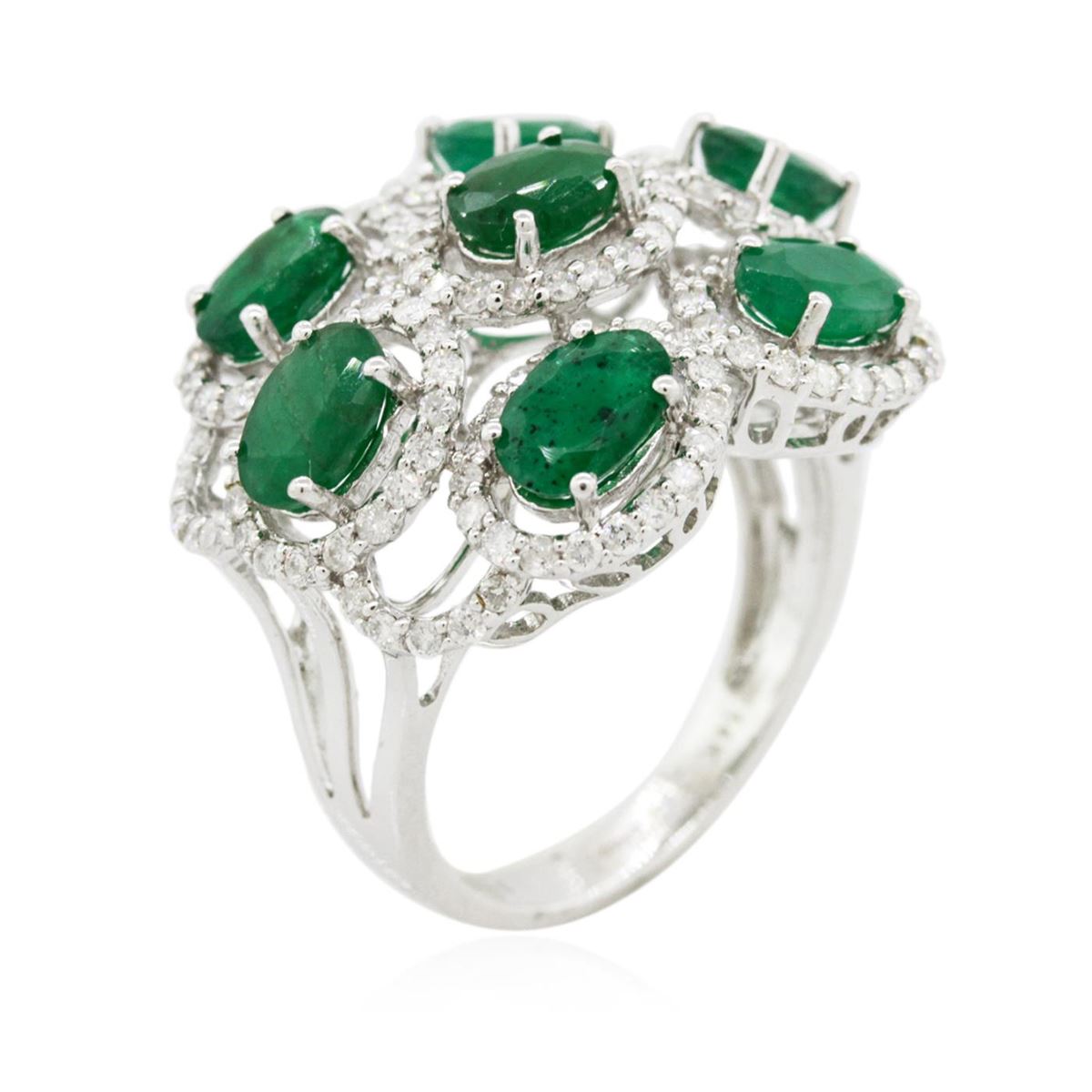 One ring featuring: 14KT white gold weighing 5.60 grams containing seven emeralds with a total weight of 3.20ct and round diamonds with a total weight of 1.06ct.