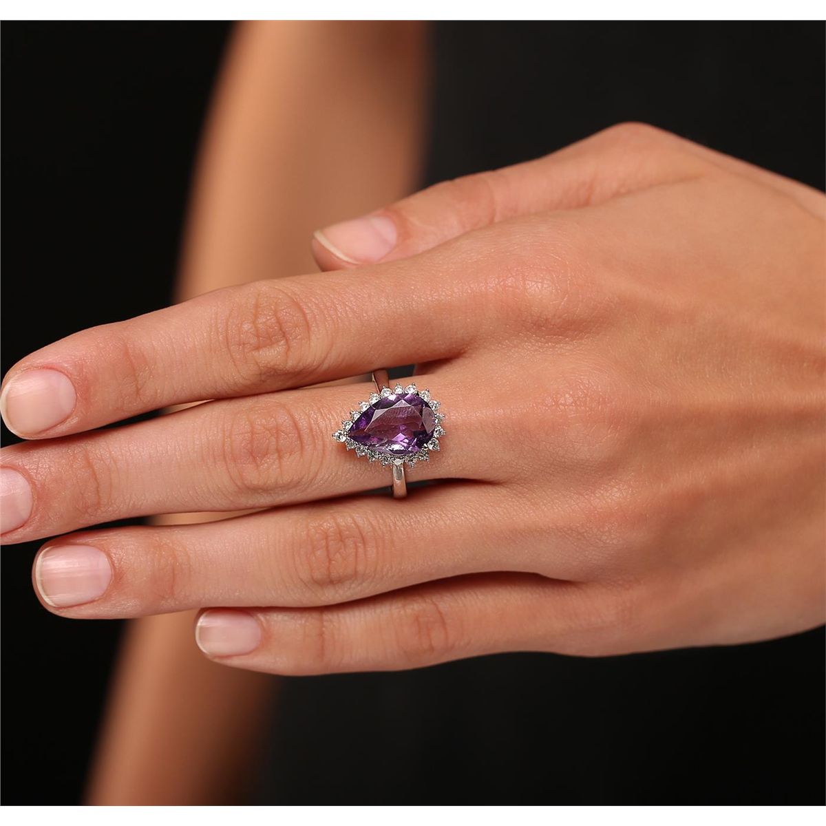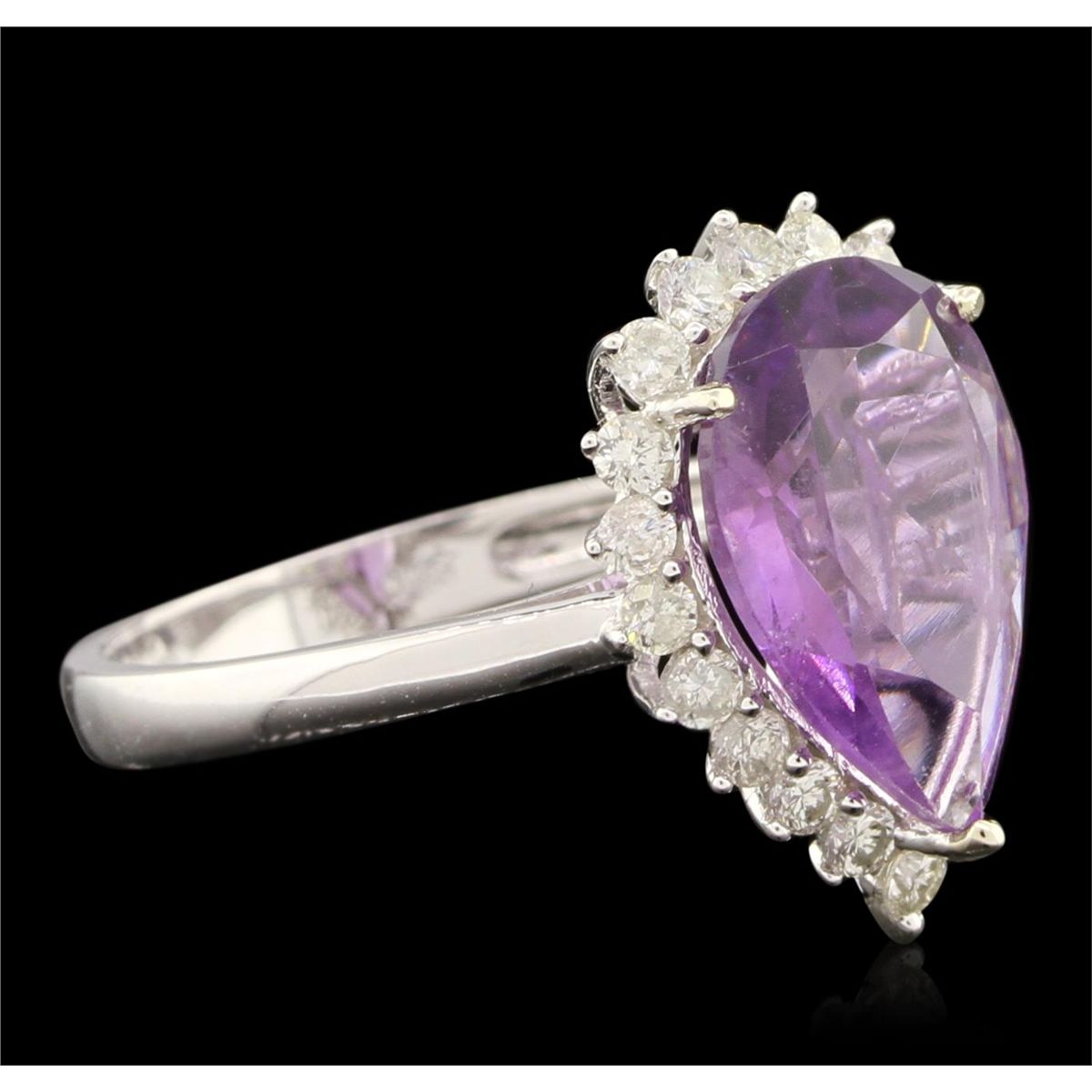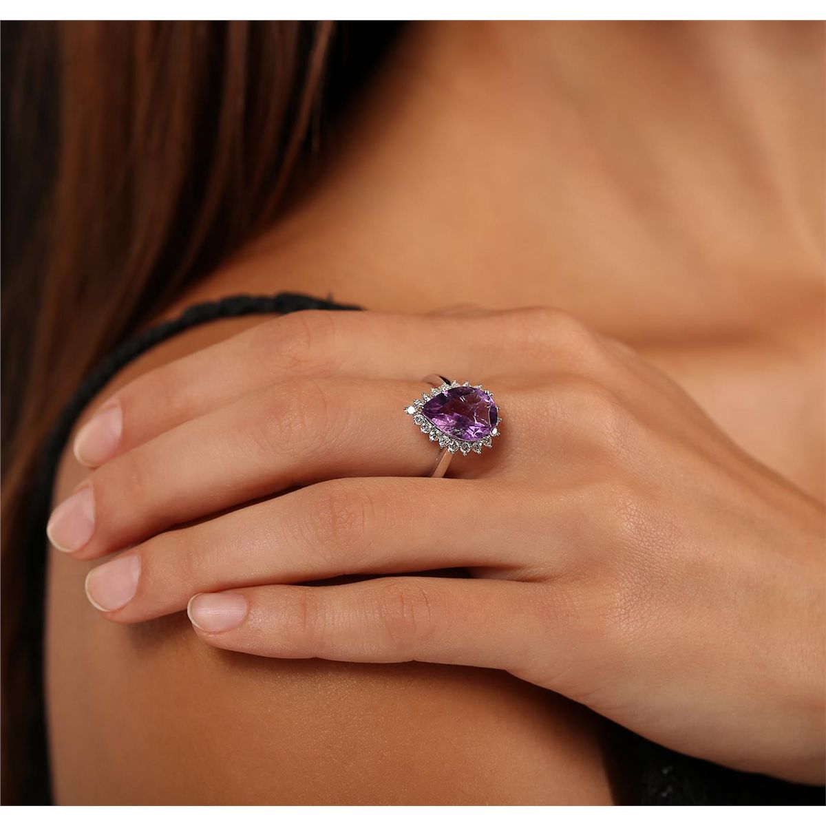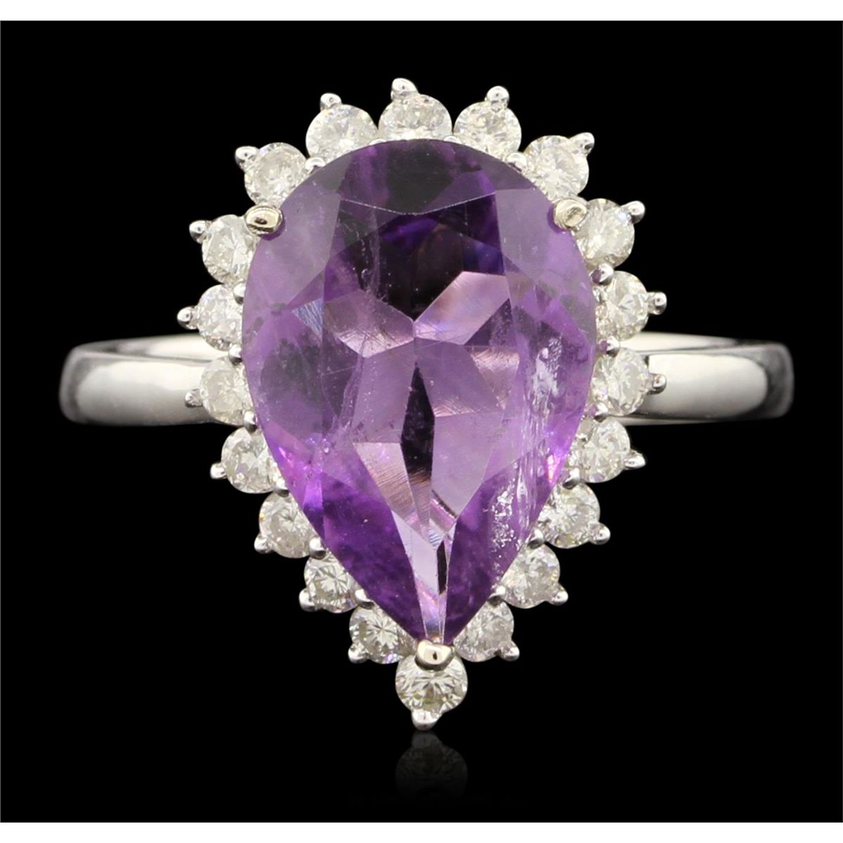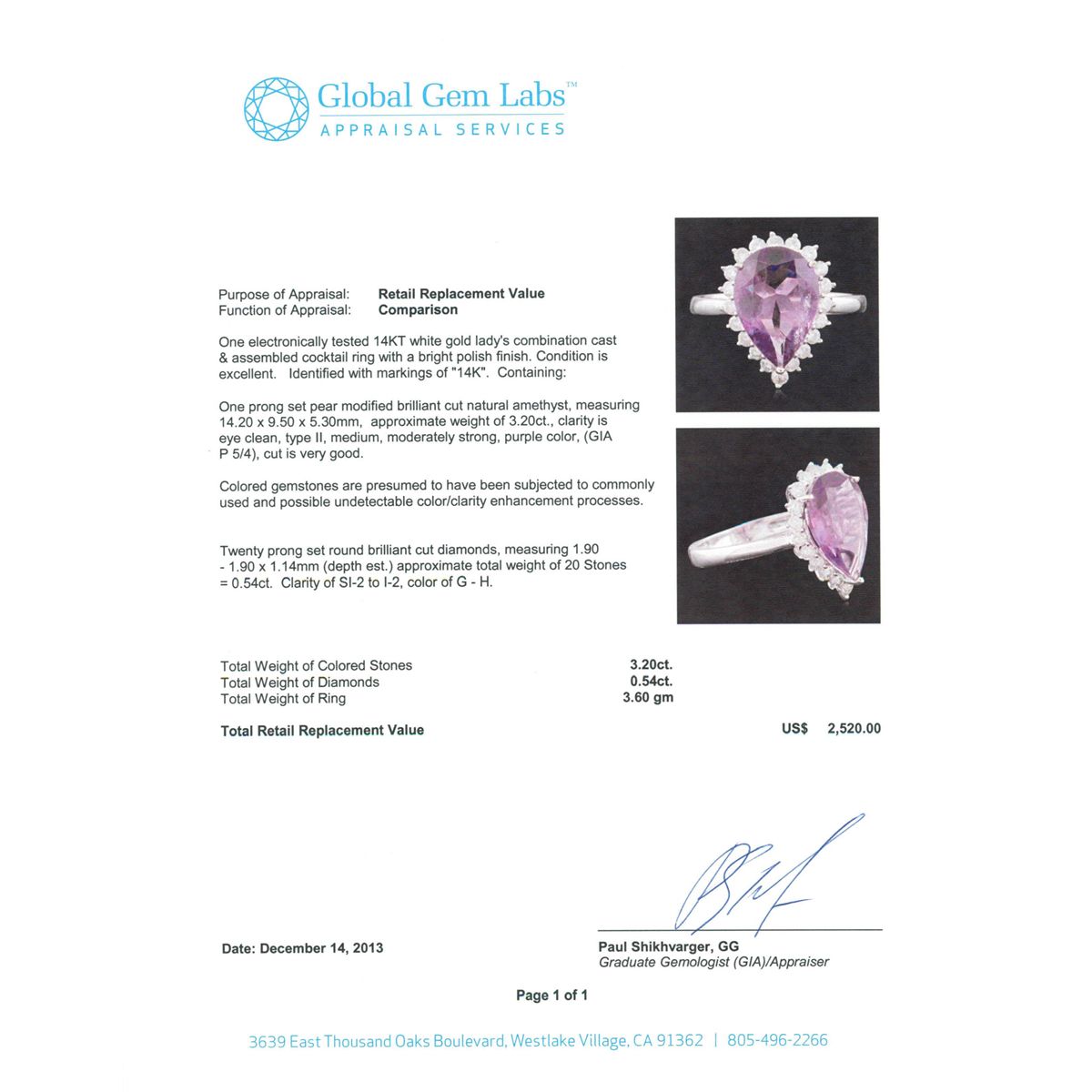 One electronically tested 14KT white gold Ladies combination cast & assembled cocktail ring with a bright polish finish. Identified with markings of "14K". Condition is excellent. Containing: One prong set pear modified brilliant cut natural amethyst, measuring 14.20 x 9.50 x 5.30mm, approximate weight of 3.20ct., clarity is eye clean, type II, medium, moderately strong, purple color, (GIA P 5/4), cut is very good. Colored gemstones are presumed to have been subjected to commonly used and possible undetectable color/clarity enhancement processes. Twenty prong set round brilliant cut diamonds, measuring 1.90 - 1.90 x 1.14mm (depth est.) approximate total weight of 20 Stones = 0.54ct. Clarity of SI-2 to I-2, Color of G - H. Total Weight of Colored Stones 3.20ct. Total Weight of Diamonds 0.54ct. Total Weight of Ring 3.60gm. GGL Appraised at $2,520.00.