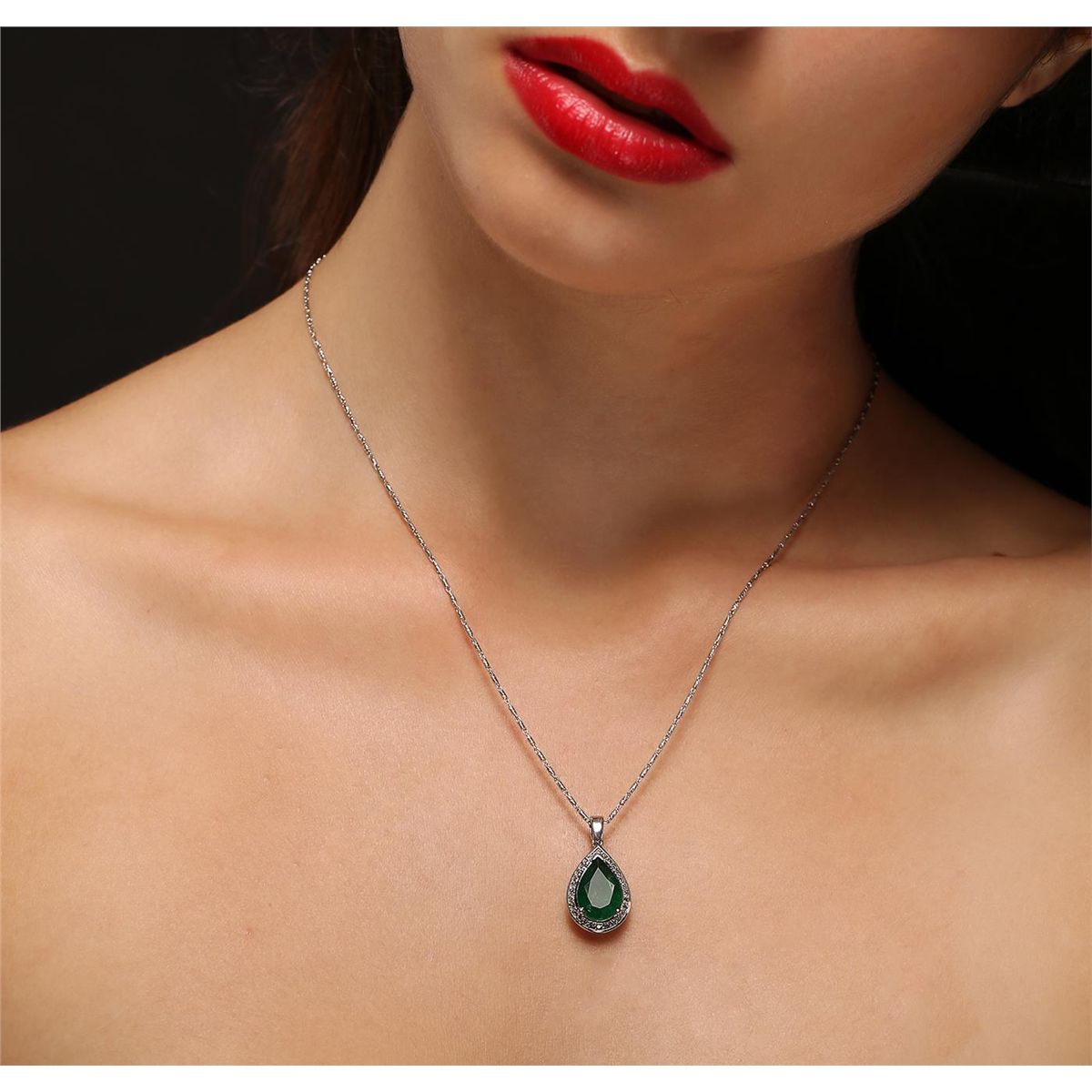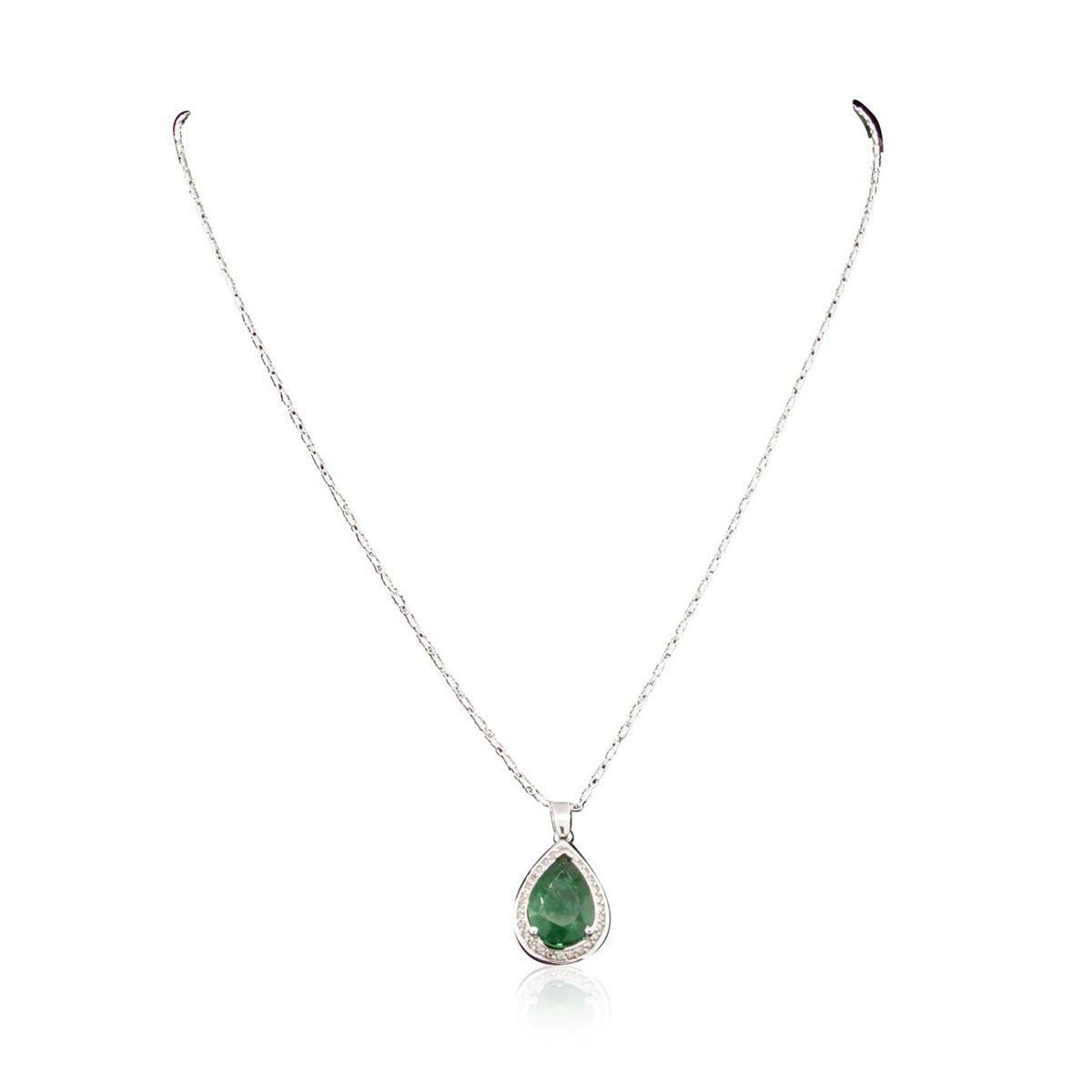 One electronically tested 14KT white gold ladies cast & assembled emerald and diamond pendant with chain. The pendant features an emerald set within a diamond bezel, completed by a white gold bail. The pendant is supported by an eighteen inch length 14KT white gold designer style chain terminating in a lobster claw clasp. Bright polish finish. Identified with markings of "14K". Condition is new, good workmanship. Containing: One prong set pear mixed cut natural emerald, measuring 12.50 x 9.20 x 4.50mm, 8%. bulge factor, approximate weight of 3.20ct., clarity is heavily included, type III, medium dark, moderately strong, very slightly bluish green color, (GIA vslbG 6/4), cut is good. Transmitting light with a minimum of distortion, transparent to translucent. Naturally occurring internal & external characteristics are present. Indications of oil residue. Graded in the setting. Twenty-Eight bead set round brilliant cut diamonds, measuring 1.30 - 1.20 x 0.75mm (depth est.) approximate. Total Weight of 28 Stones = 0.24ct. Graded in the setting. Clarity: VS-2 to SI-2 . Color: F - H. Total Weight of Colored Stones 3.20ct.. Total Weight of Diamonds 0.24ct. AIG Appraised at $8,500.00.