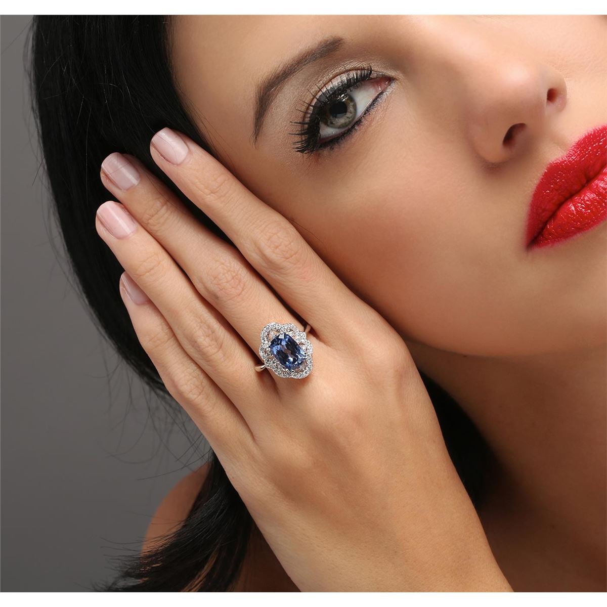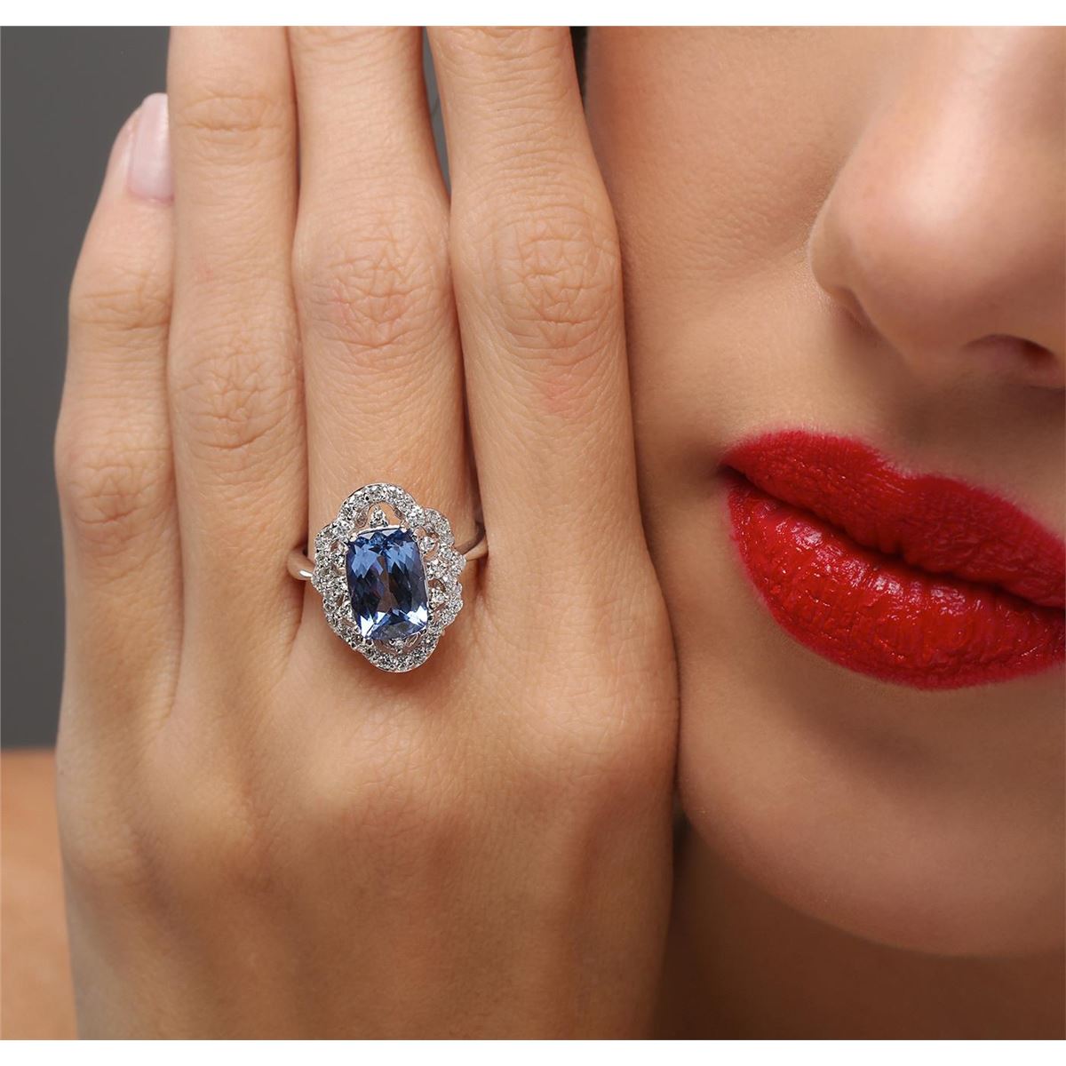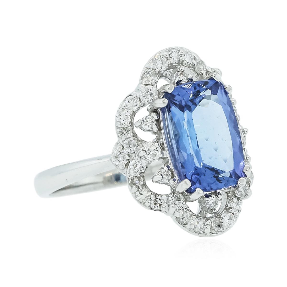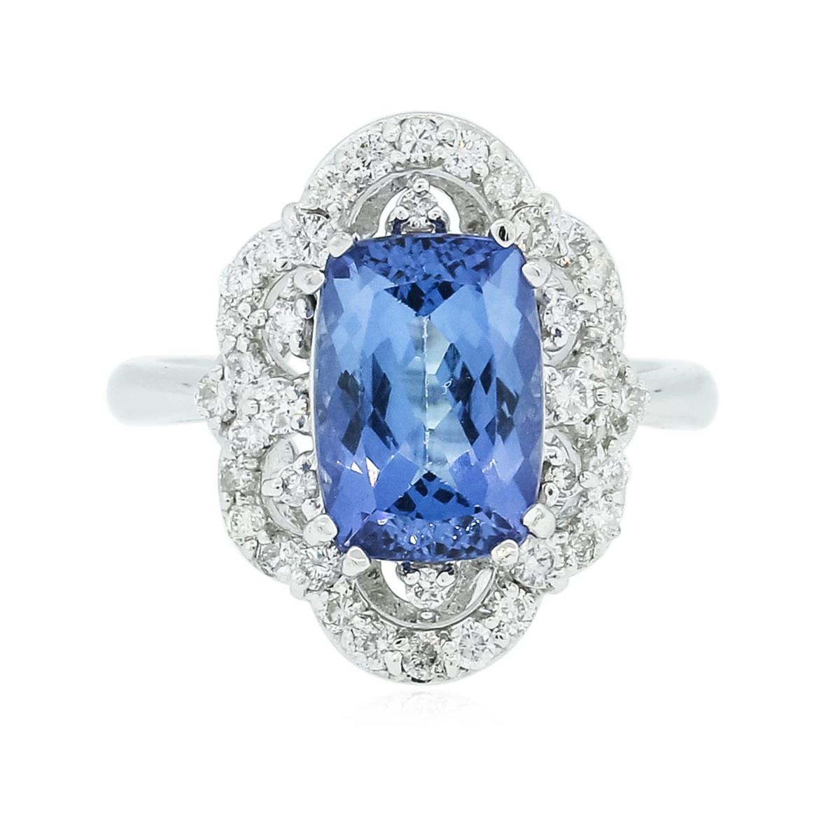 One electronically tested 14KT white gold ladies cast tanzanite and diamond ring with a bright polish finish. Identified with markings of "K14". Condition is new. Containing: One prong set rectangular cushion modified brilliant cut natural tanzanite, measuring 11.10 x 7.50 x 4.88mm, approximate weight of 3.20ct., clarity is eye clean, type I, medium light, very slightly grayish, violet color, (GIA V 4/3), cut is good. Forty prong set round brilliant cut diamonds, measuring 1.30 - 1.30 x 0.78mm (depth est.) approximate total weight of 40 Stones = 0.32ct. Clarity: SI-2 to I-1. Color: H - I, Cut is Good. Colored gemstones are presumed to have been subjected to commonly used enhancement processes. All diamonds and colored gemstones are graded in the mounting, unless otherwise stated. Total Weight of Colored Stones 3.20ct. Total Weight of Diamonds 0.32ct. Total Weight of Ring 5.40 grams. GGL Appraised at $4,475.00.
