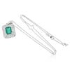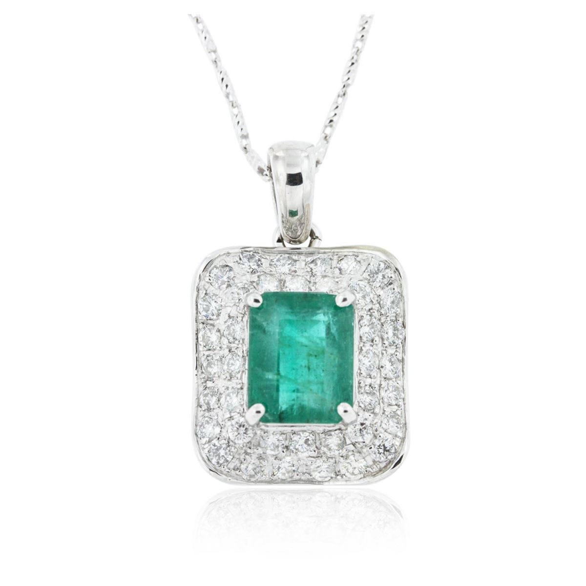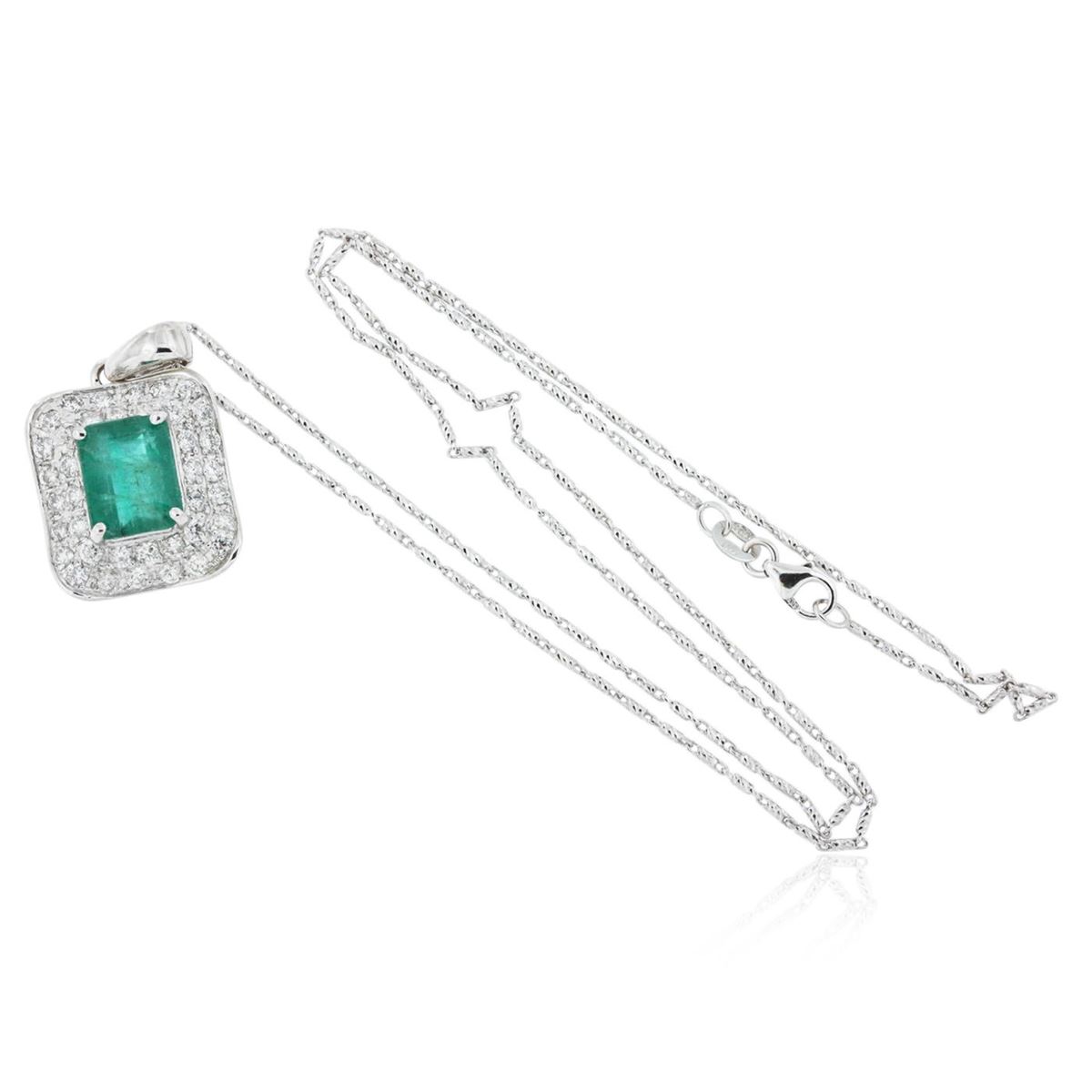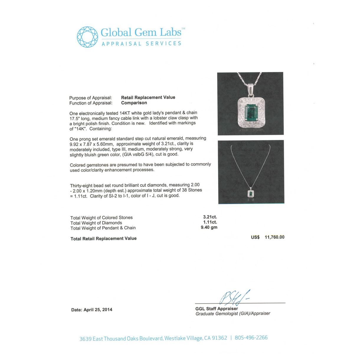One electronically tested 14KT white gold Ladies pendant & chain 17.5" long, medium fancy cable link with a lobster claw clasp with a bright polish finish. Condition is new. Identified with markings of "14K". Containing: One prong set emerald standard step cut natural emerald, measuring 9.92 x 7.87 x 5.60mm, approximate weight of 3.21ct., clarity is moderately included, type III, medium, moderately strong, very slightly bluish green color, (GIA vslbG 5/4), cut is good. Colored gemstones are presumed to have been subjected to commonly used color/clarity enhancement processes. Thirty-Eight bead set round brilliant cut diamonds, measuring 2.00 - 2.00 x 1.20mm (depth est.) approximate. Total Weight of 38 Stones = 1.11ct. Clarity: SI-2 to I-1. Color: I - J, Cut is Good. Total Weight of Colored Stones 3.21ct. Total Weight of Diamonds 1.11ct. Total Weight of Pendant & Chain 9.40 grams. GGL Appraised at $11,760.00.