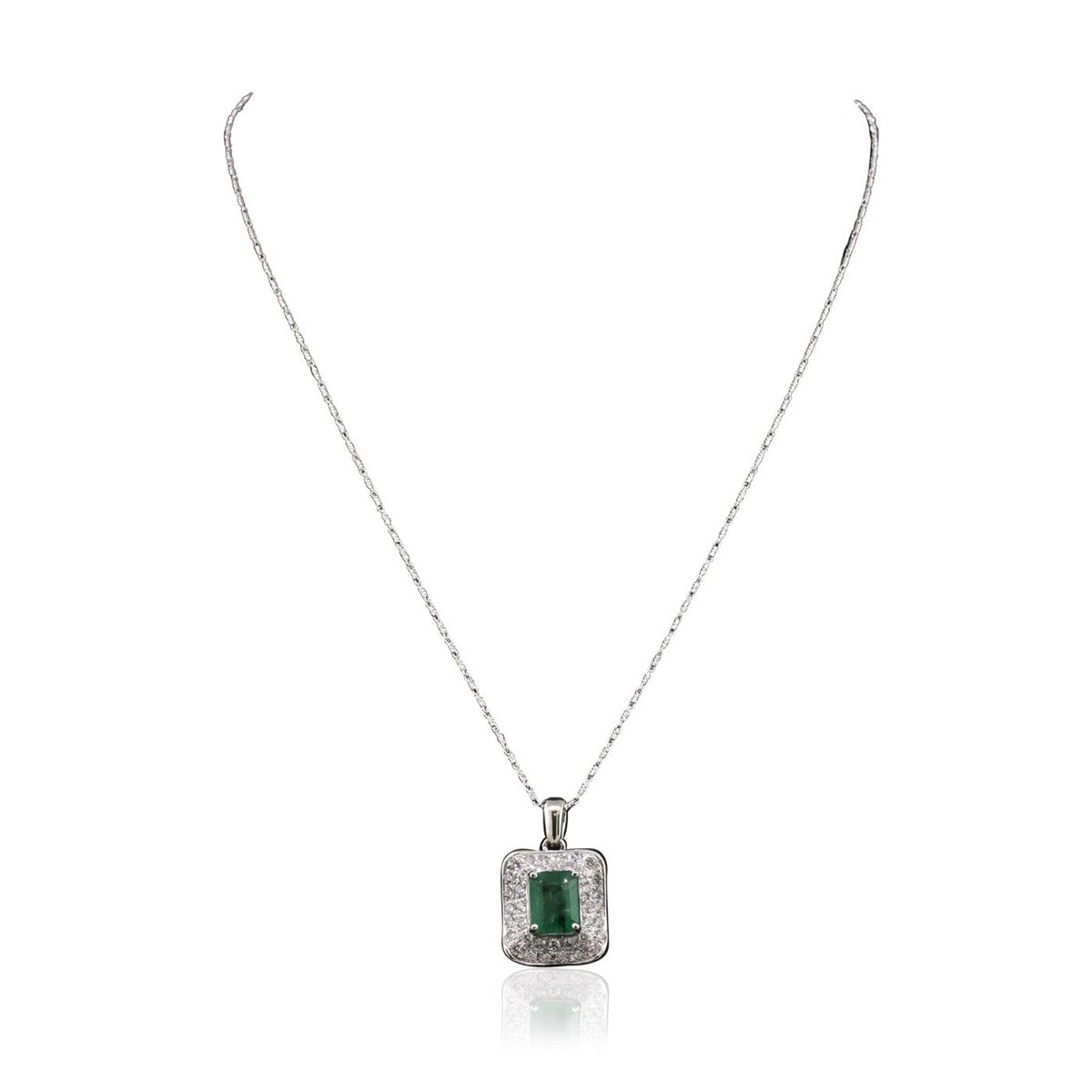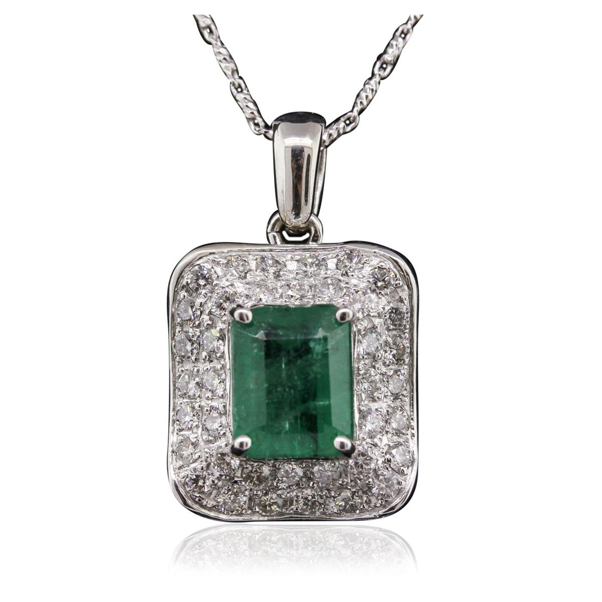 One electronically tested 14KT white gold Ladies pendant & chain 17.5" long, medium fancy cable link with a lobster claw clasp with a bright polish finish. Condition is new. Identified with markings of "14K". Containing: One prong set emerald standard step cut natural emerald, measuring 9.92 x 7.87 x 5.60mm, approximate weight of 3.21ct., clarity is moderately included, type III, medium, moderately strong, very slightly bluish green color, (GIA vslbG 5/4), cut is good. Colored gemstones are presumed to have been subjected to commonly used color/clarity enhancement processes. Thirty-Eight bead set round brilliant cut diamonds, measuring 2.00 - 2.00 x 1.20mm (depth est.) approximate. Total Weight of 38 Stones = 1.11ct. Clarity: SI-2 to I-1. Color: I - J, Cut is Good. Total Weight of Colored Stones 3.21ct. Total Weight of Diamonds 1.11ct. Total Weight of Pendant & Chain 9.40 grams. GGL Appraised at $11,760.00.
