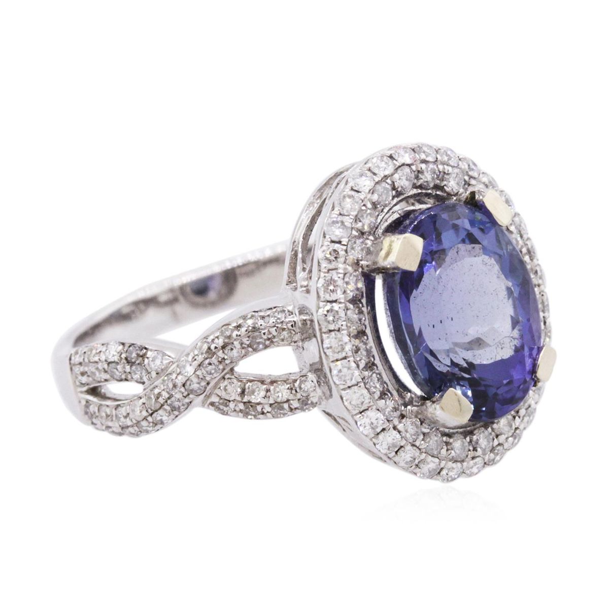 One electronically tested 14KT white gold ladies cast tanzanite & diamond ring with a bright finish. The featured tanzanite is set within a diamond bezel, supported by intertwined diamond set ribbons, complete by a two millimeter wide band. Trademark is UCG. Identified with markings of "14K". Condition is new, good workmanship. Containing: One prong set oval mixed cut natural tanzanite, measuring 10.00 x 8.00 x 5.38mm, 10% bulge factor, approximate weight of 3.21ct., clarity is slightly included, type I, medium dark, grayish, bluish violet color, (GIA bV 6/1), cut is good. Transmitting light with no distortion, transparent. Graded in the setting. Tanzanite is a very rare gemstone that is only found in the country of Tanzania. Originally discovered in 1967. Tiffany & Company, named the stone Tanzanite. It is found in the Usumburu Mountains that border the Umba Valley of northern Tanzania. Tanzanite occurs in gray, brown, violet, blue, reddish-purple, & green. The gem is interesting because of its exceptional pleochroism. Rotated in different directions a tanzanite will exhibit multiple changes of color. Tanzanite has a low tolerance to ultrasonic cleaning, and should not be cleaned using this method. One Hundred Thirty-Four prong set round brilliant cut diamonds, measuring 1.20 - 1.00 x 0.66mm (depth est.) approximate total weight of 134 Stones = 0.67ct. Graded in the setting. Clarity: SI-2 to I-2. Color: H - J. Total Weight of Colored Stones 3.21ct. Total Weight of Diamonds 0.67ct. Total Weight of Ring 4.98 grams. AIG Appraised at $8,740.00.