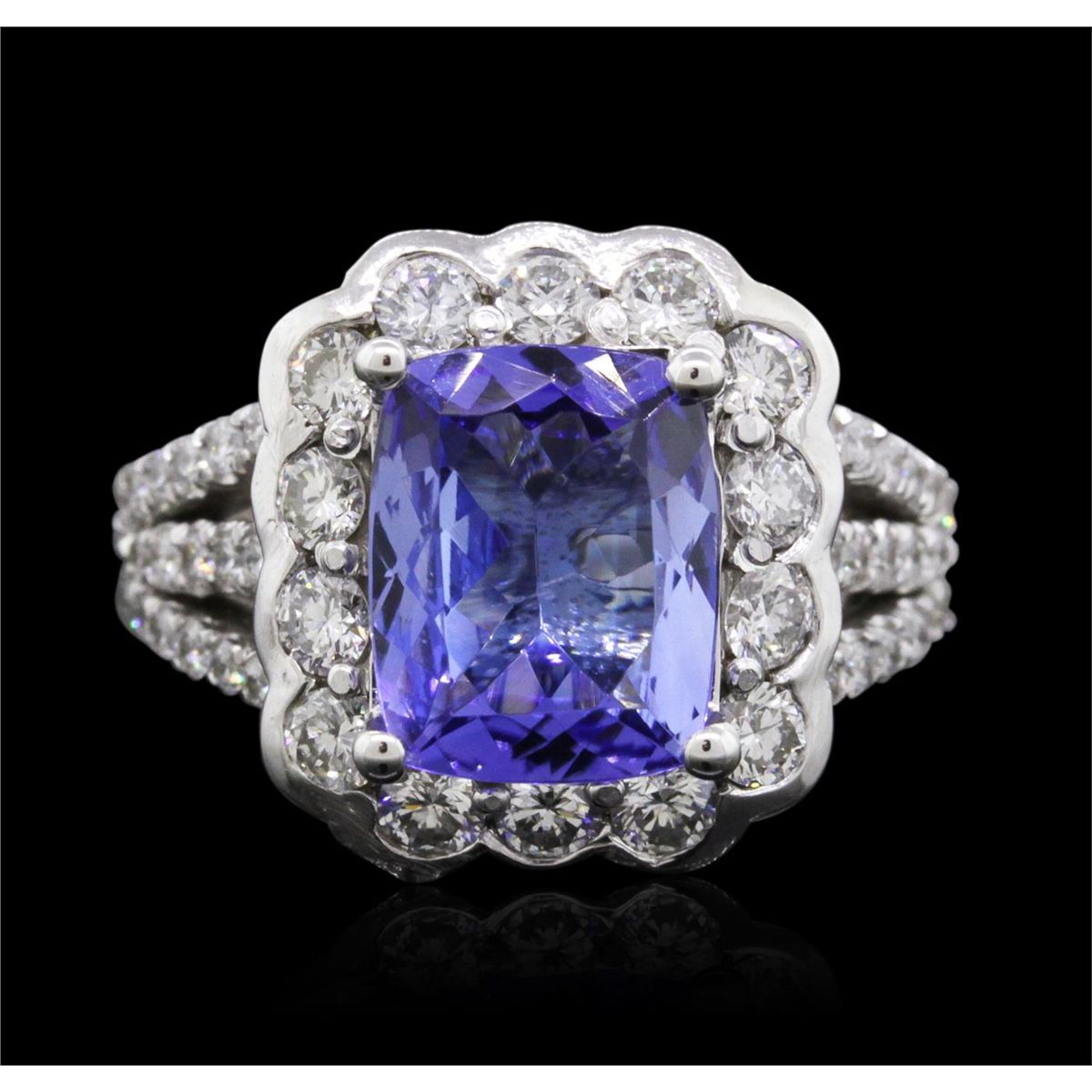 One electronically tested 14KT white gold ladies combination cast & assembled tanzanite and diamond ring with a bright polish finish. Identified with markings of "14K". Condition is new. Containing: One prong set rectangular cushion modified brilliant cut natural tanzanite, measuring 9.93 x 7.95 x 5.17mm, approximate weight of 3.21ct., clarity is eye clean, type I, medium light, very slightly grayish, violet color, (GIA V 4/3), cut is good. Forty-Eight prong set round brilliant cut diamonds, measuring 1.50 - 1.50 x 0.90mm (depth est.) approximate total weight of 48 Stones = 0.59ct. Clarity: SI-2 to I-1. Color: I - J, Cut is Good. Fourteen prong set round brilliant cut diamonds, measuring 2.50 - 2.50 x 1.50mm (depth est.) approximate total weight of 14 Stones = 0.80ct. Clarity: SI-2 to I-1. Color: I - J, Cut is Good. Colored gemstones are presumed to have been subjected to commonly used enhancement processes. All diamonds and colored gemstones are graded in the mounting, unless otherwise stated. Total Weight of Colored Stones 3.21ct. Total Weight of Diamonds 1.39ct. Total Weight of Ring 7.20 grams. GGL Appraised at $7,135.00.