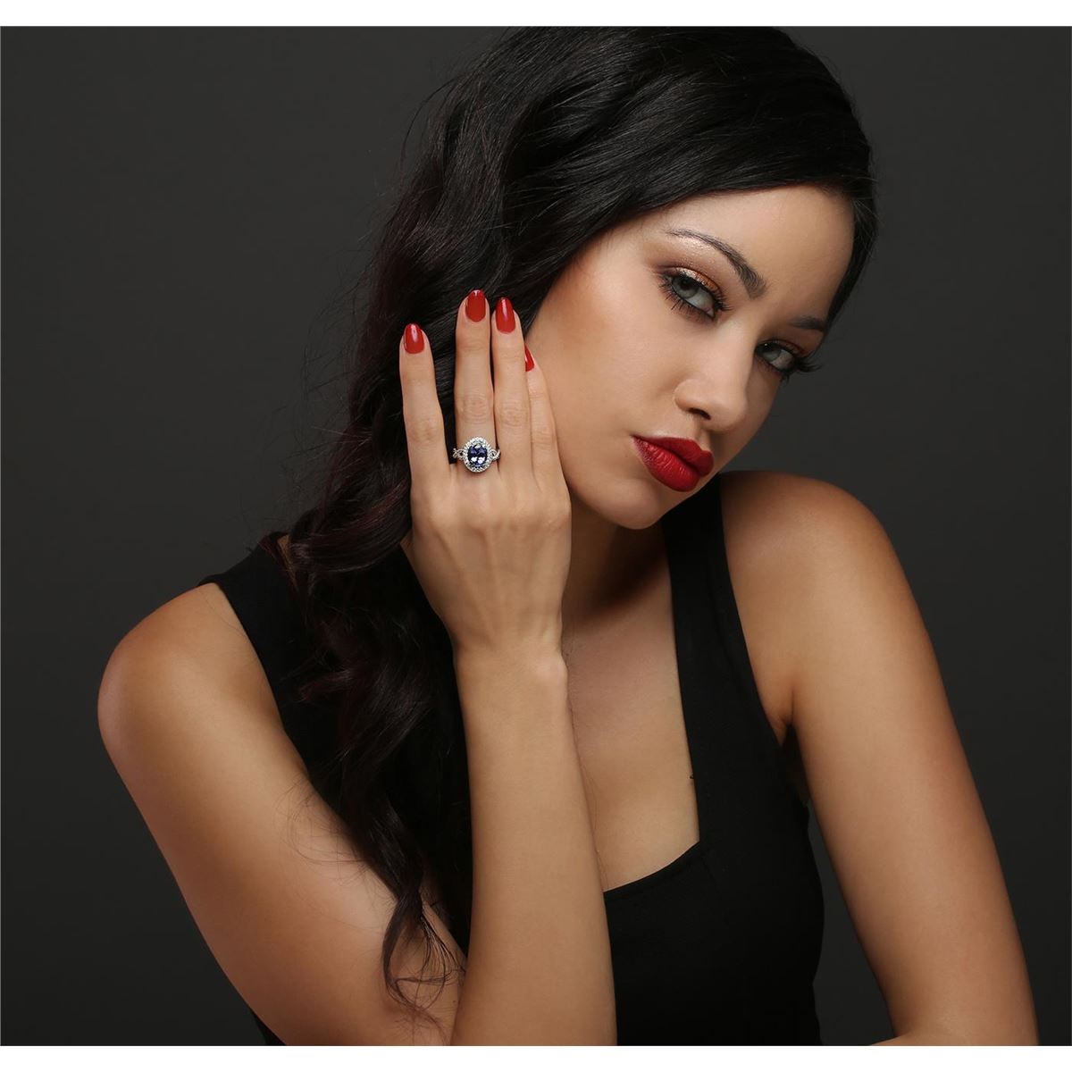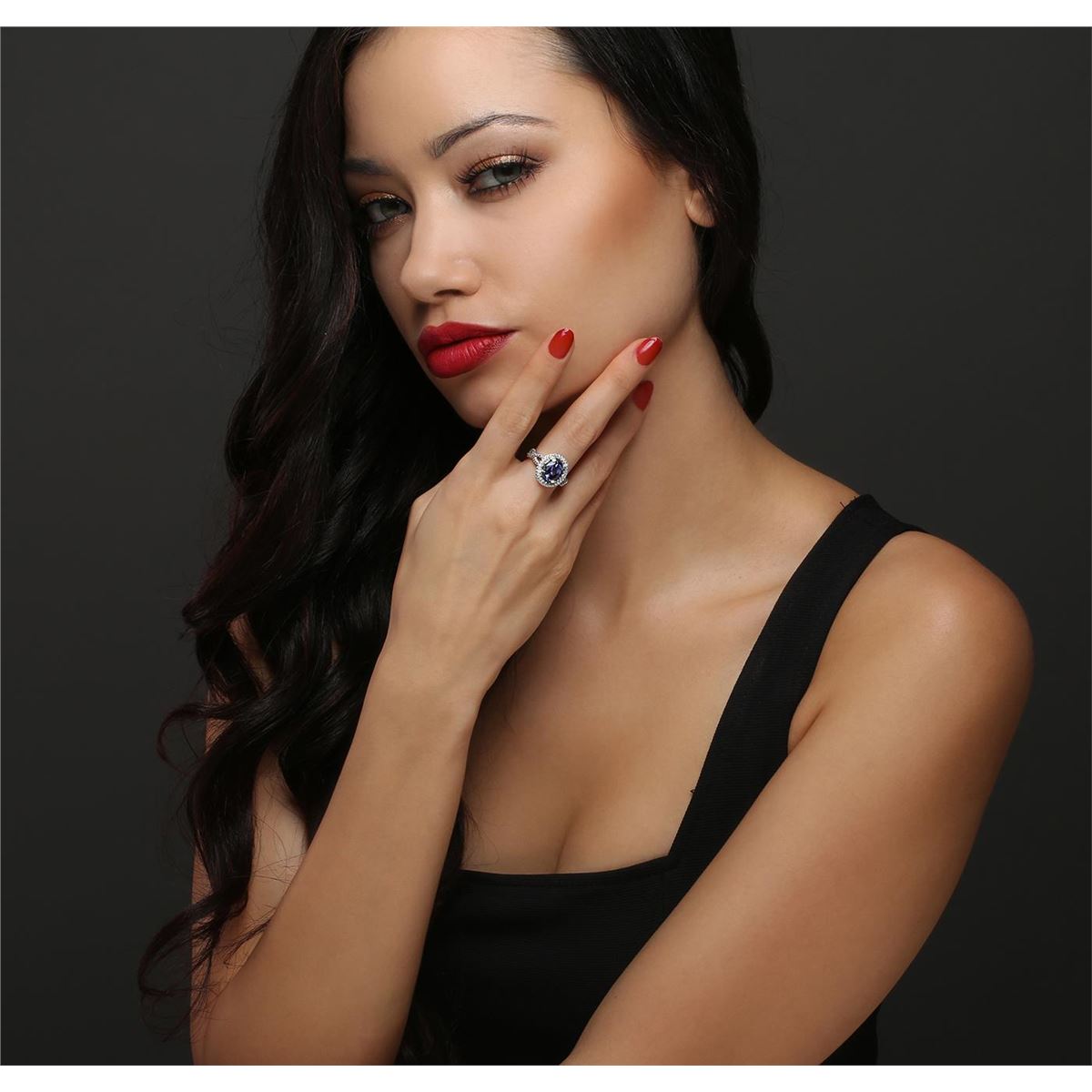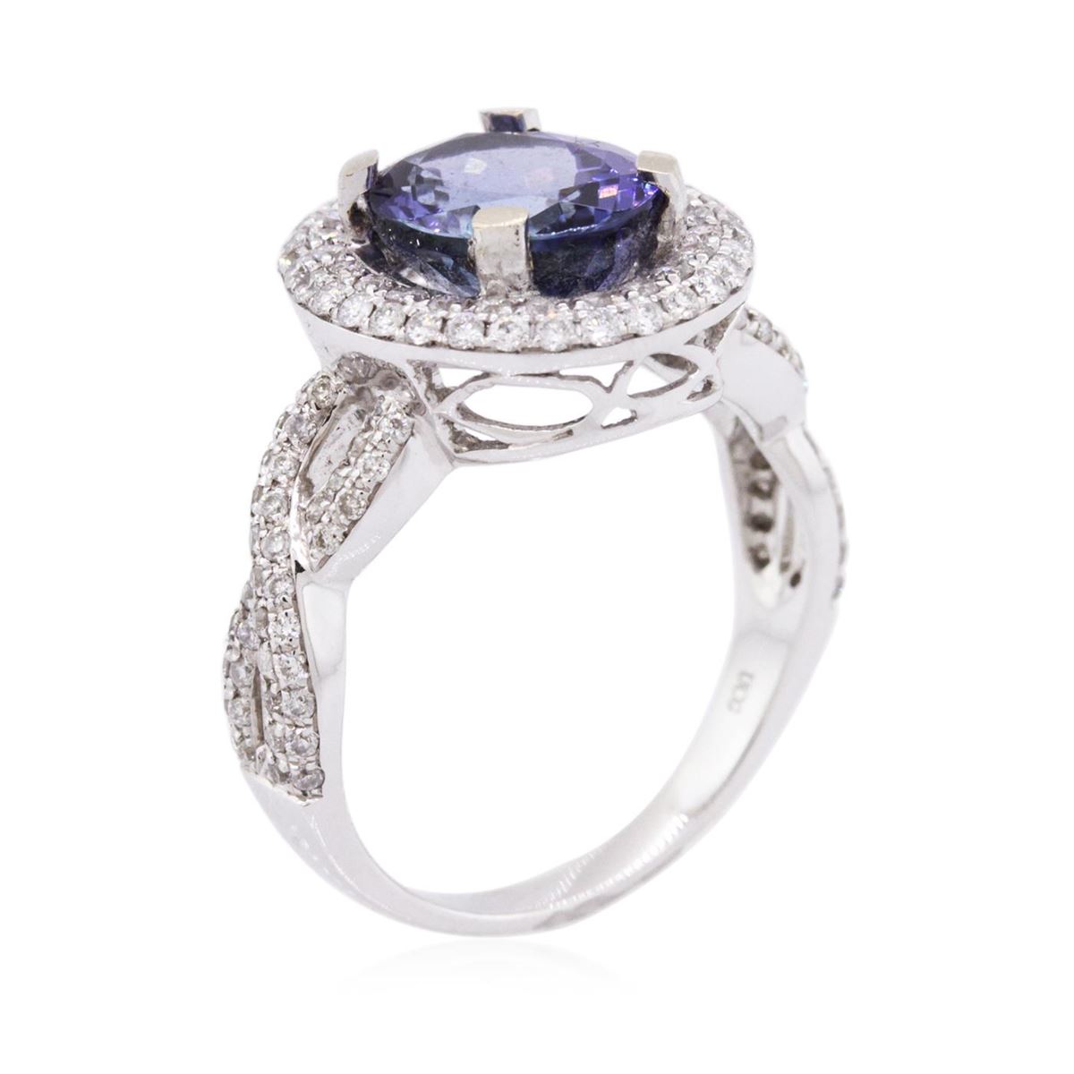 One electronically tested 14KT white gold ladies cast tanzanite & diamond ring with a bright finish. The featured tanzanite is set within a diamond bezel, supported by intertwined diamond set ribbons, complete by a two millimeter wide band. Trademark is UCG. Identified with markings of "14K". Condition is new, good workmanship. Containing: One prong set oval mixed cut natural tanzanite, measuring 10.00 x 8.00 x 5.38mm, 10% bulge factor, approximate weight of 3.21ct., clarity is slightly included, type I, medium dark, grayish, bluish violet color, (GIA bV 6/1), cut is good. Transmitting light with no distortion, transparent. Graded in the setting. Tanzanite is a very rare gemstone that is only found in the country of Tanzania. Originally discovered in 1967. Tiffany & Company, named the stone Tanzanite. It is found in the Usumburu Mountains that border the Umba Valley of northern Tanzania. Tanzanite occurs in gray, brown, violet, blue, reddish-purple, & green. The gem is interesting because of its exceptional pleochroism. Rotated in different directions a tanzanite will exhibit multiple changes of color. Tanzanite has a low tolerance to ultrasonic cleaning, and should not be cleaned using this method. One Hundred Thirty-Four prong set round brilliant cut diamonds, measuring 1.20 - 1.00 x 0.66mm (depth est.) approximate total weight of 134 Stones = 0.67ct. Graded in the setting. Clarity: SI-2 to I-2. Color: H - J. Total Weight of Colored Stones 3.21ct. Total Weight of Diamonds 0.67ct. Total Weight of Ring 4.98 grams. AIG Appraised at $8,740.00.