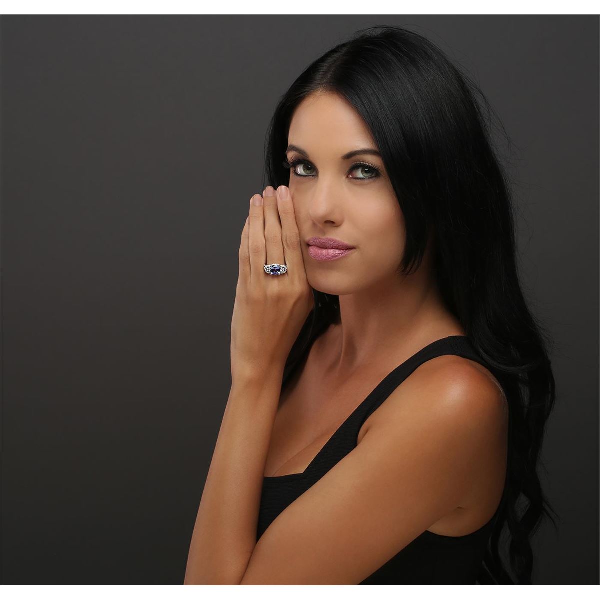 One electronically tested 14KT white gold ladies combination cast & assembled tanzanite and diamond ring with a split shank with a bright polish finish. Identified with markings of "14K". Condition is new. Containing: One prong set square cushion modified brilliant cut natural tanzanite, measuring 8.86 x 8.74 x 5.27mm, approximate weight of 3.21ct., clarity is eye clean, type I, medium, very slightly grayish, violet color, (GIA V 5/3), cut is good. Two bezel set round brilliant cut diamonds, measuring 3.40 - 3.40 x 2.04mm (depth est.) approximate total weight of 2 Stones = 0.29ct. Clarity: SI-1. Color: J, Cut is Good. Fifty-Nine prong set round brilliant cut diamonds, measuring 1.10 - 1.10 x 0.66mm (depth est.) approximate total weight of 59 Stones = 0.28ct. Clarity: I-1 to I-2. Color: I - J, Cut is Good. Colored gemstones are presumed to have been subjected to commonly used enhancement processes. All diamonds and colored gemstones are graded in the mounting, unless otherwise stated. Total Weight of Colored Stones 3.21ct. Total Weight of Diamonds 0.57ct. Total Weight of Ring 4.70 grams. GGL Appraised at $7,420.00.