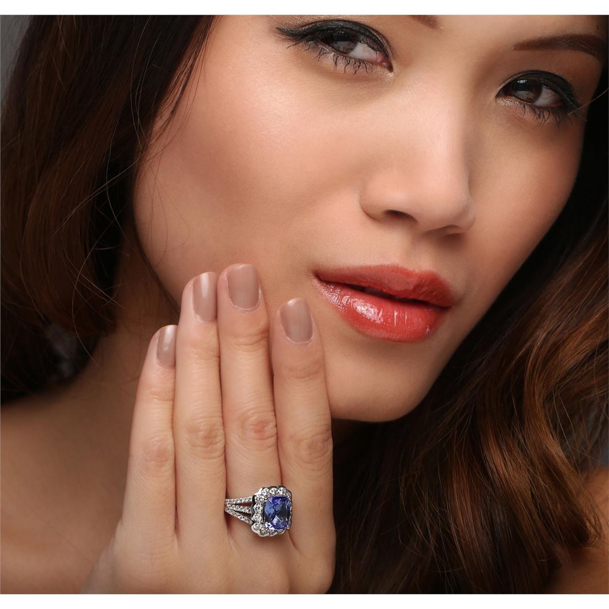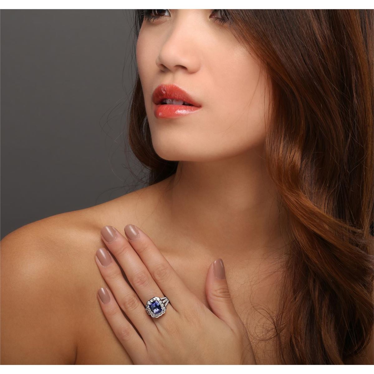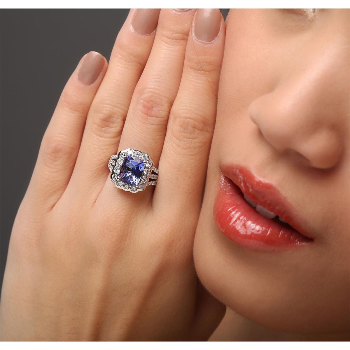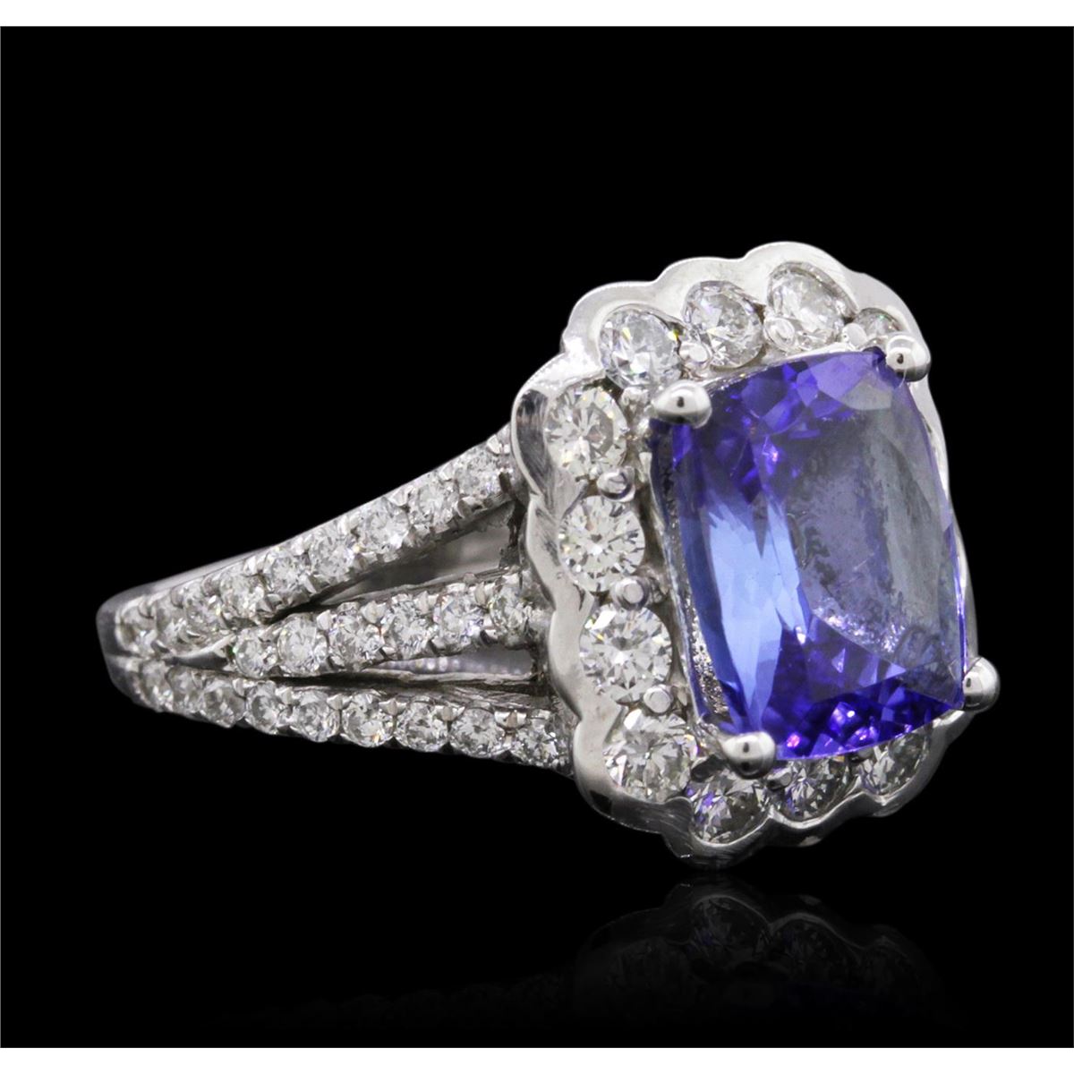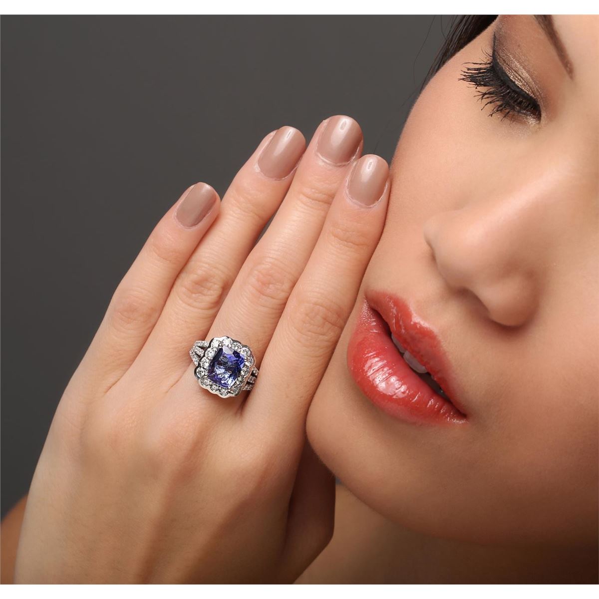One electronically tested 14KT white gold ladies combination cast & assembled tanzanite and diamond ring with a bright polish finish. Identified with markings of "14K". Condition is new. Containing: One prong set rectangular cushion modified brilliant cut natural tanzanite, measuring 9.93 x 7.95 x 5.17mm, approximate weight of 3.21ct., clarity is eye clean, type I, medium light, very slightly grayish, violet color, (GIA V 4/3), cut is good. Forty-Eight prong set round brilliant cut diamonds, measuring 1.50 - 1.50 x 0.90mm (depth est.) approximate total weight of 48 Stones = 0.59ct. Clarity: SI-2 to I-1. Color: I - J, Cut is Good. Fourteen prong set round brilliant cut diamonds, measuring 2.50 - 2.50 x 1.50mm (depth est.) approximate total weight of 14 Stones = 0.80ct. Clarity: SI-2 to I-1. Color: I - J, Cut is Good. Colored gemstones are presumed to have been subjected to commonly used enhancement processes. All diamonds and colored gemstones are graded in the mounting, unless otherwise stated. Total Weight of Colored Stones 3.21ct. Total Weight of Diamonds 1.39ct. Total Weight of Ring 7.20 grams. GGL Appraised at $7,135.00.