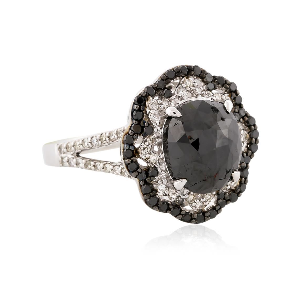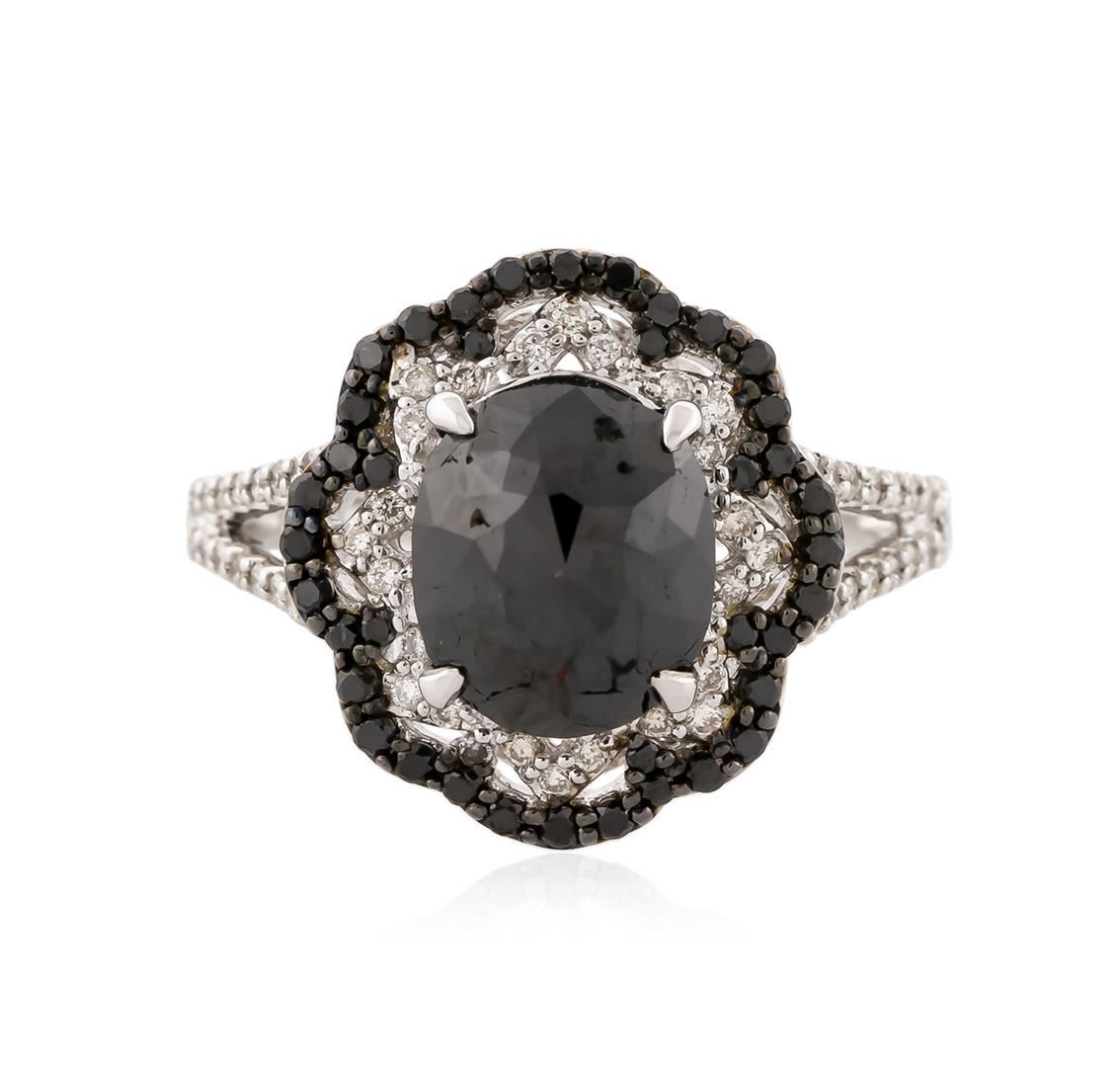 One 14KT white gold black and white diamond ring. An oval cut black diamond is prong mounted in the center of the ring with a total weight of 2.69ct. Black and white round brilliant cut diamonds accent the ring around the center diamond and on both sides with a total weight of 0.53ct. The ring is cast stamped "14K" and has a gross weight of 4.61 Grams. GGA Appraised at $7,140.00.