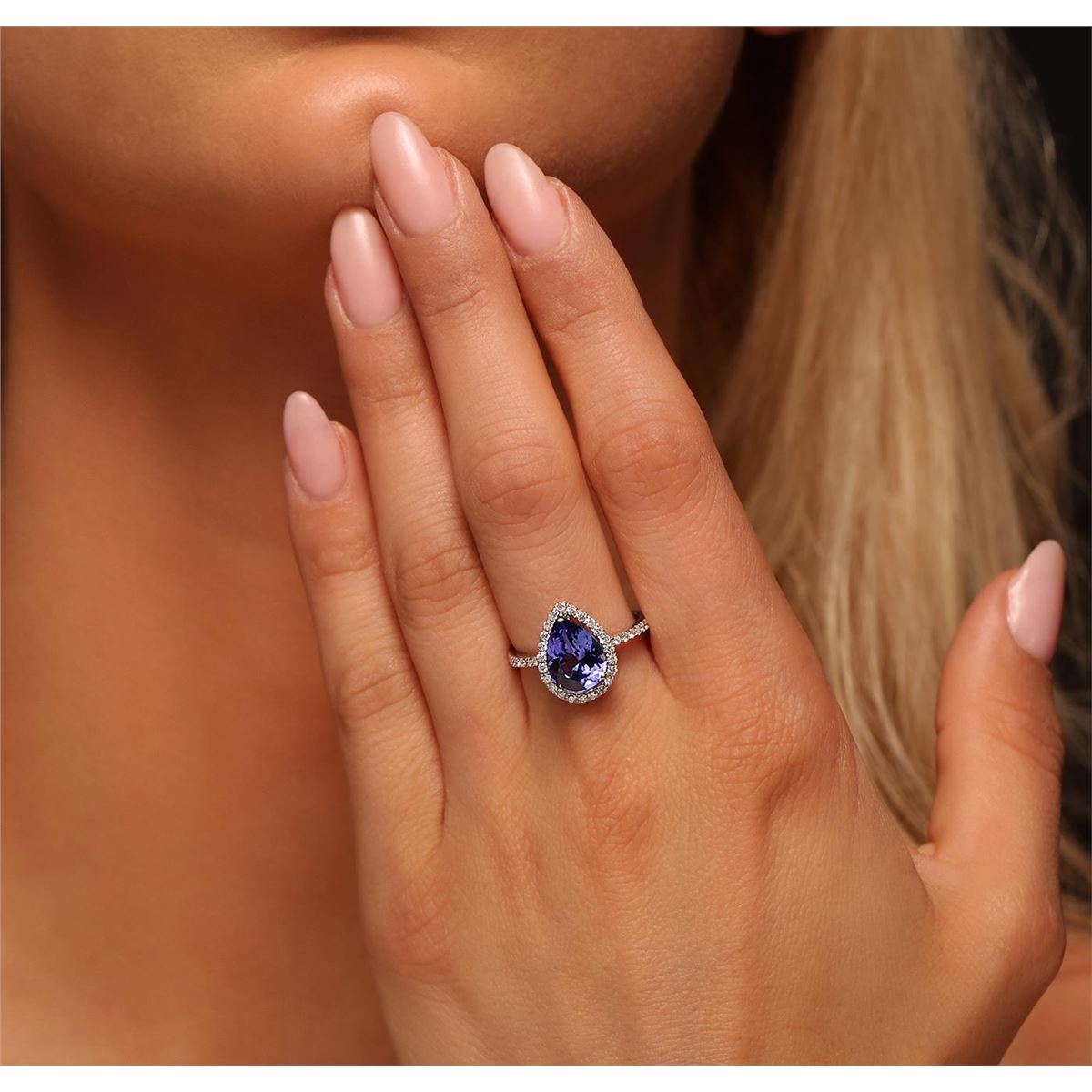 One electronically tested 14KT white gold Ladies combination cast & assembled ring with a bright polish finish. Condition is new. Identified with markings of "14K". Containing: One prong set pear modified brilliant cut natural tanzanite, measuring 11.00 x 8.20 x 5.33mm, approximate weight of 3.22ct., clarity is eye clean, type I, medium, moderately strong, bluish violet color, (GIA bV 5/4), cut is very good. Colored gemstones are presumed to have been subjected to commonly used color/clarity enhancement processes. Thirty-Nine prong set round brilliant cut diamonds, measuring 1.30 - 1.30 x 0.78mm (depth est.) approximate. Total Weight of 39 Stones = 0.31ct. . Clarity: I-1 to I-2. Color: I - J, Cut is Good. Total Weight of Colored Stones 3.22ct. Total Weight of Diamonds 0.31ct. Total Weight of Ring 3.50 grams. GGL Appraised at $6,905.00.