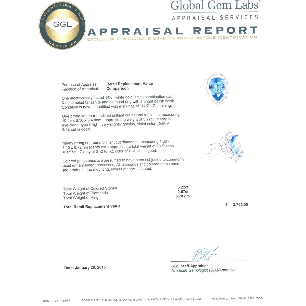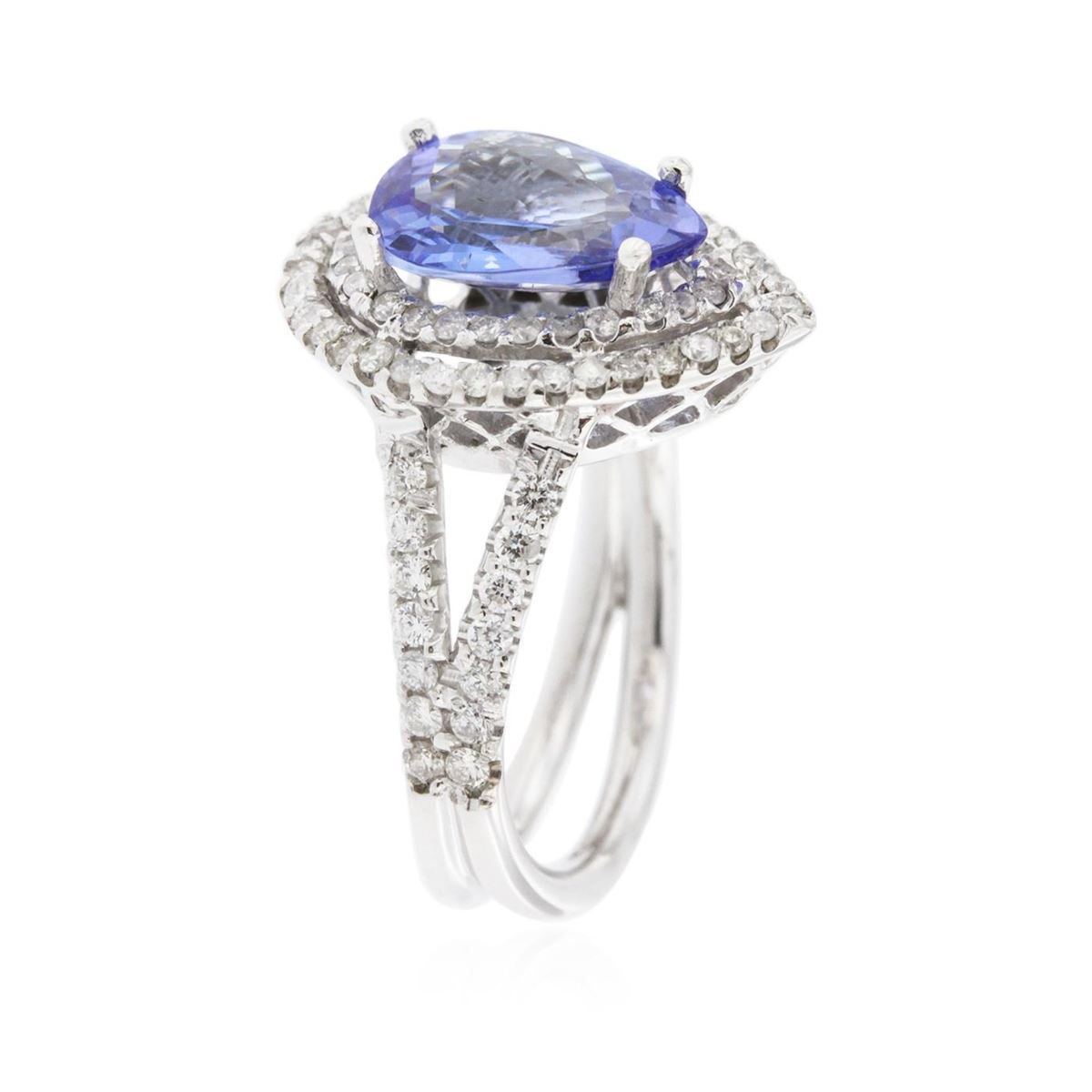 One electronically tested 14KT white gold ladies combination cast & assembled tanzanite and diamond ring with a bright polish finish. Identified with markings of "14K". Condition is new. Containing: One prong set pear modified brilliant cut natural tanzanite, measuring 10.59 x 8.36 x 5.43mm, approximate weight of 3.22ct., clarity is eye clean, type I, light, very slightly grayish, violet color, (GIA V 3/3), cut is good. Ninety prong set round brilliant cut diamonds, measuring 1.30 - 1.10 x 0.72mm (depth est.) approximate total weight of 90 Stones = 0.57ct. Clarity: SI-2 to I-2. Color: I - J, Cut is Good. Colored gemstones are presumed to have been subjected to commonly used enhancement processes. All diamonds and colored gemstones are graded in the mounting, unless otherwise stated. Total Weight of Colored Stones 3.22ct. Total Weight of Diamonds 0.57ct. Total Weight of Ring 5.70 grams. GGL Appraised at $3,765.00.