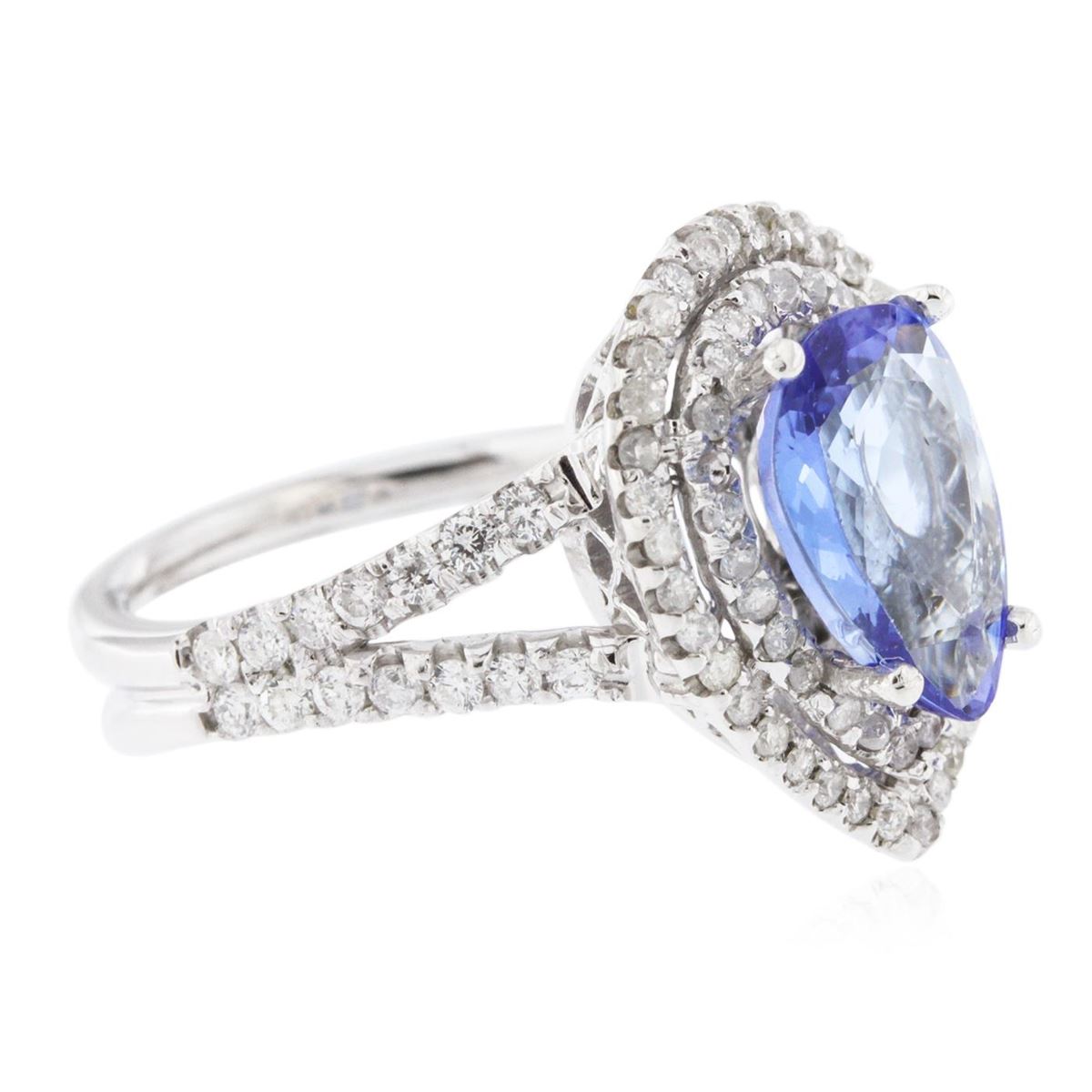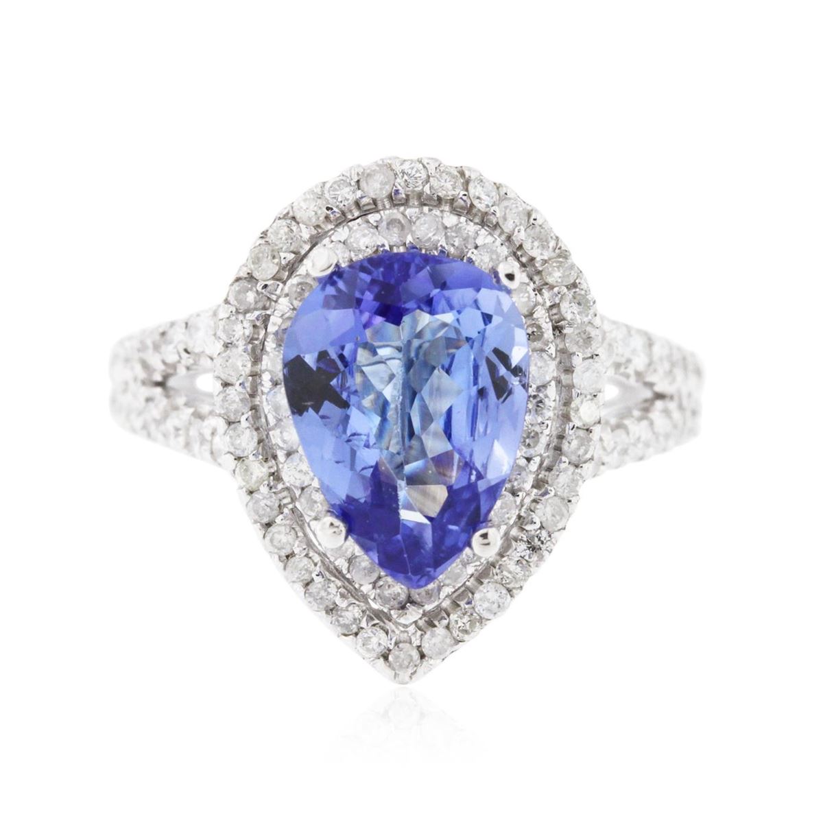 One electronically tested 14KT white gold ladies combination cast & assembled tanzanite and diamond ring with a bright polish finish. Identified with markings of "14K". Condition is new. Containing: One prong set pear modified brilliant cut natural tanzanite, measuring 10.59 x 8.36 x 5.43mm, approximate weight of 3.22ct., clarity is eye clean, type I, light, very slightly grayish, violet color, (GIA V 3/3), cut is good. Ninety prong set round brilliant cut diamonds, measuring 1.30 - 1.10 x 0.72mm (depth est.) approximate total weight of 90 Stones = 0.57ct. Clarity: SI-2 to I-2. Color: I - J, Cut is Good. Colored gemstones are presumed to have been subjected to commonly used enhancement processes. All diamonds and colored gemstones are graded in the mounting, unless otherwise stated. Total Weight of Colored Stones 3.22ct. Total Weight of Diamonds 0.57ct. Total Weight of Ring 5.70 grams. GGL Appraised at $3,765.00.