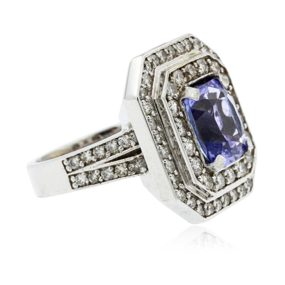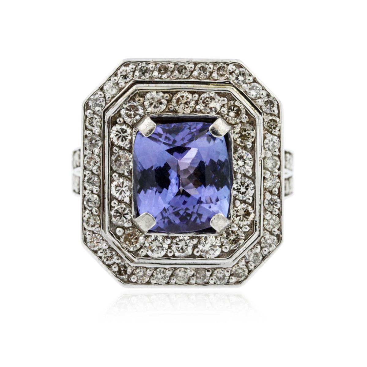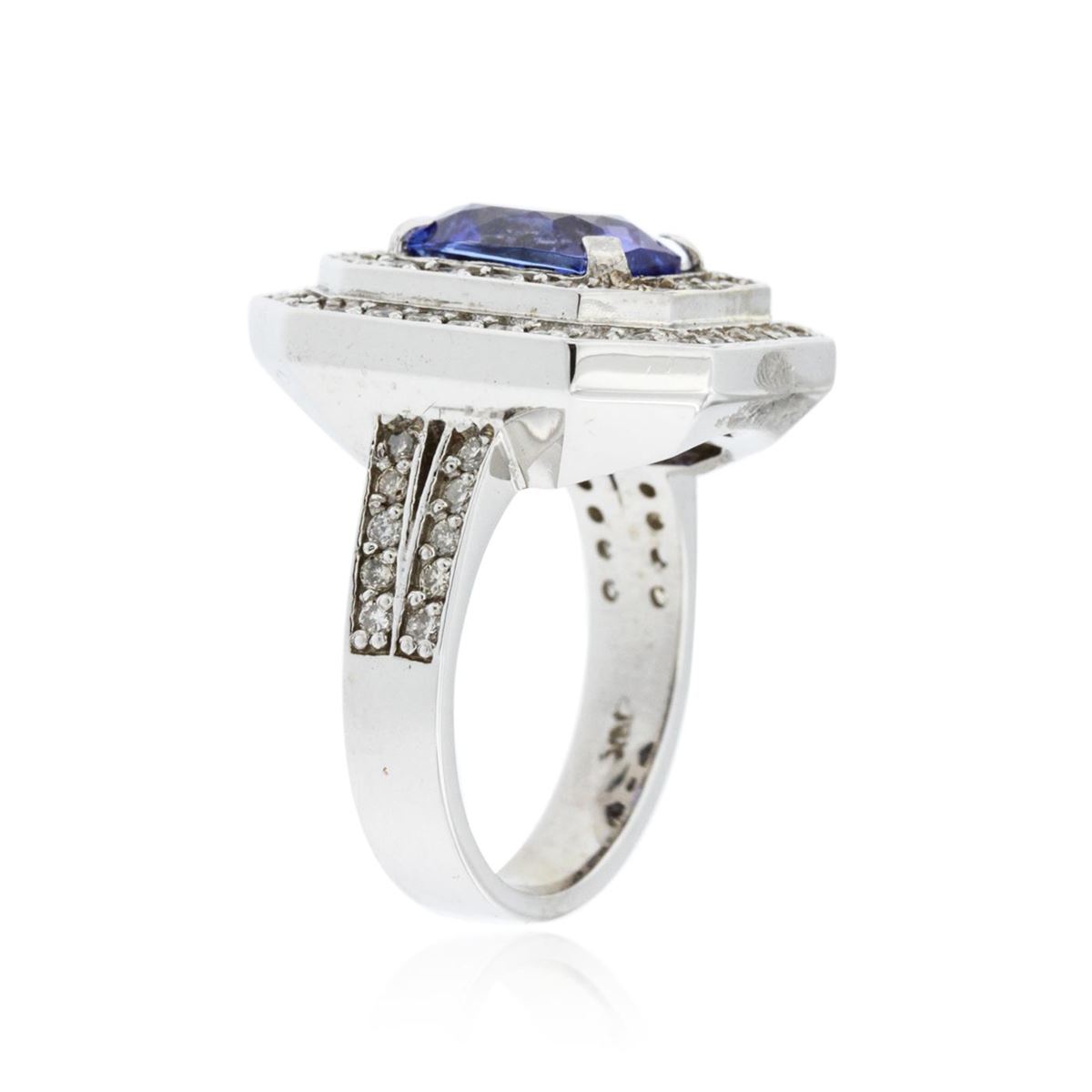 One electronically tested 14KT white gold Ladies combination cast & assembled ring with a bright polish finish. Condition is new. Identified with markings of "K14". Containing: One prong set rectangular cushion modified brilliant cut natural tanzanite, measuring 9.10 x 8.19 x 5.50mm, approximate weight of 3.23ct., clarity is eye clean, type I, medium, very slightly grayish, violet color, (GIA V 5/3), cut is very good. Colored gemstones are presumed to have been subjected to commonly used color/clarity enhancement processes. Seventy-Four prong set round brilliant cut diamonds, measuring 1.50 - 1.40 x 0.48mm (depth est.) approximate. Total Weight of 74 Stones = 0.45ct. Clarity: I-1 to I-2. Color: I - J, Cut is Good. Total Weight of Colored Stones 3.23ct. Total Weight of Diamonds 0.45ct. Total Weight of Ring 11.70 grams. GGL Appraised at $9,090.00.