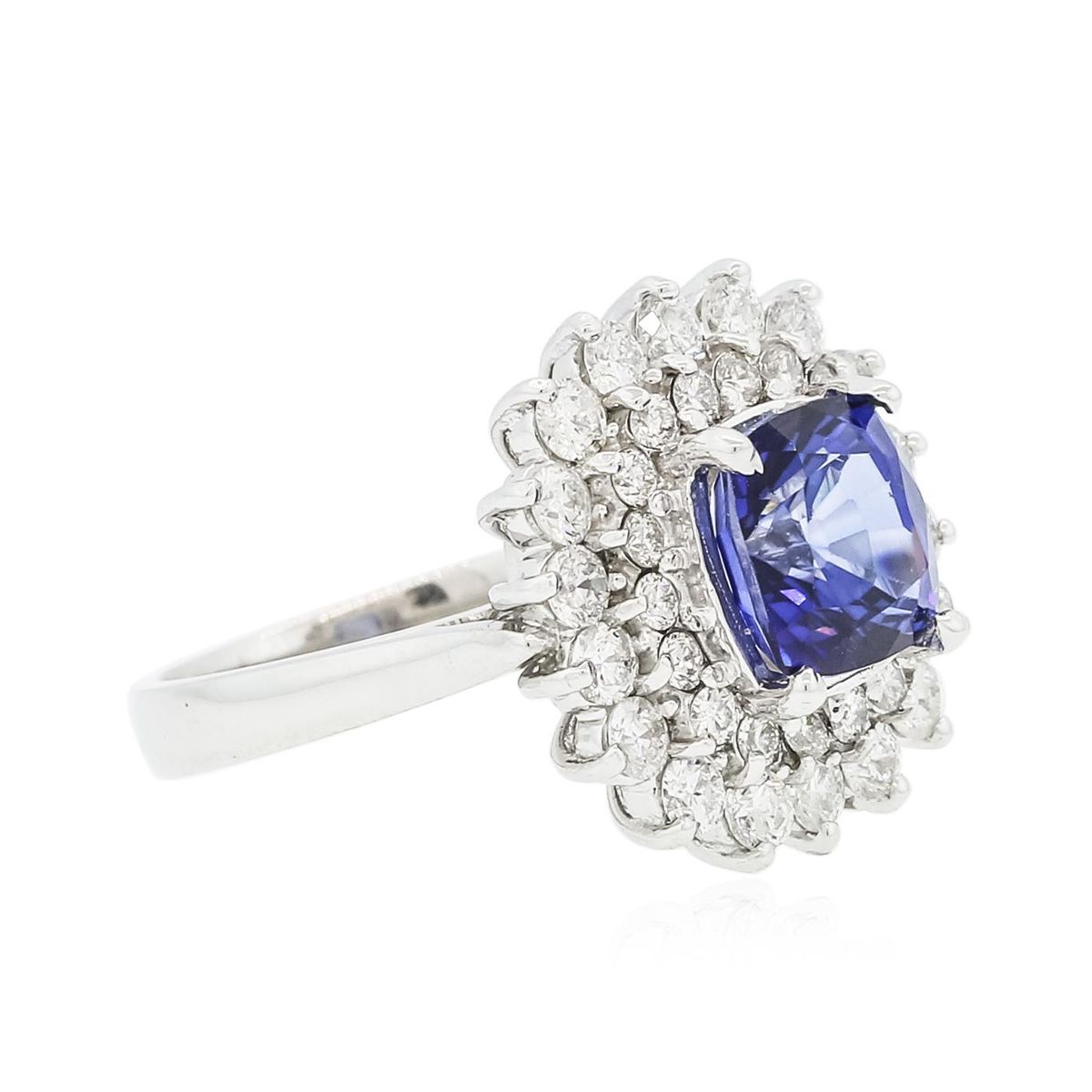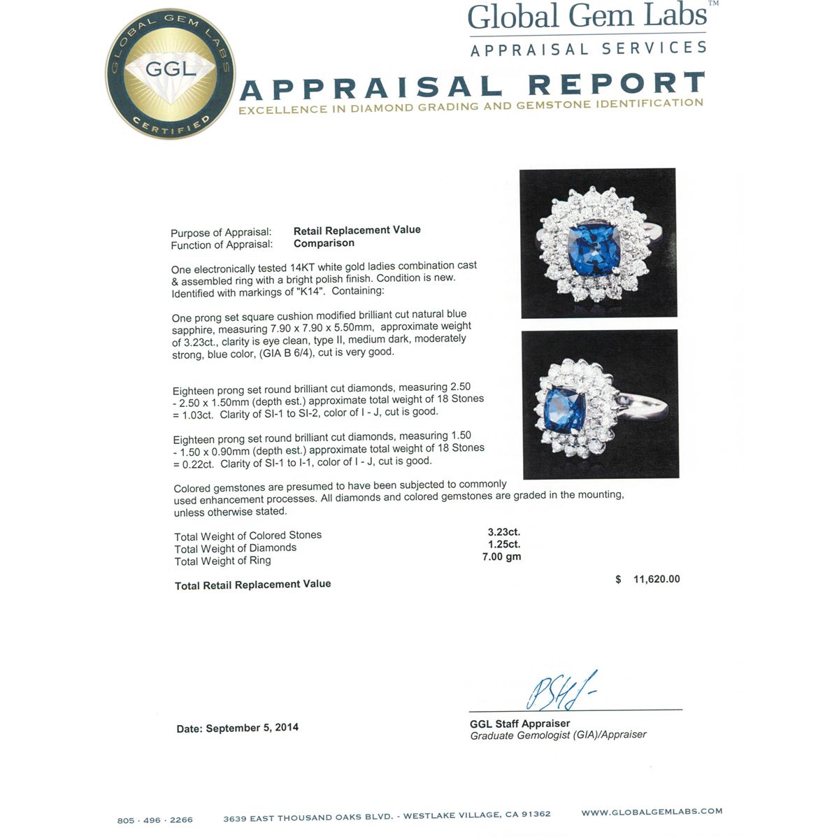 One electronically tested 14KT white gold ladies combination cast & assembled ring with a bright polish finish. Identified with markings of "K14". Condition is new. Containing: One prong set square cushion modified brilliant cut natural blue sapphire, measuring 7.90 x 7.90 x 5.50mm, approximate weight of 3.23ct., clarity is eye clean, type II, medium dark, moderately strong, blue color, (GIA B 6/4), cut is very good. Eighteen prong set round brilliant cut diamonds, measuring 2.50 - 2.50 x 1.50mm (depth est.) approximate total weight of 18 Stones = 1.03ct. Clarity: SI-1 to SI-2. Color: I - J, Cut is Good. Eighteen prong set round brilliant cut diamonds, measuring 1.50 - 1.50 x 0.90mm (depth est.) approximate total weight of 18 Stones = 0.22ct. Clarity: SI-1 to I-1. Color: I - J, Cut is Good. Colored gemstones are presumed to have been subjected to commonly used enhancement processes. All diamonds and colored gemstones are graded in the mounting, unless otherwise stated. Total Weight of Colored Stones 3.23ct. Total Weight of Diamonds 1.25ct. Total Weight of Ring 7.00 grams. GGL Appraised at $11,620.00.