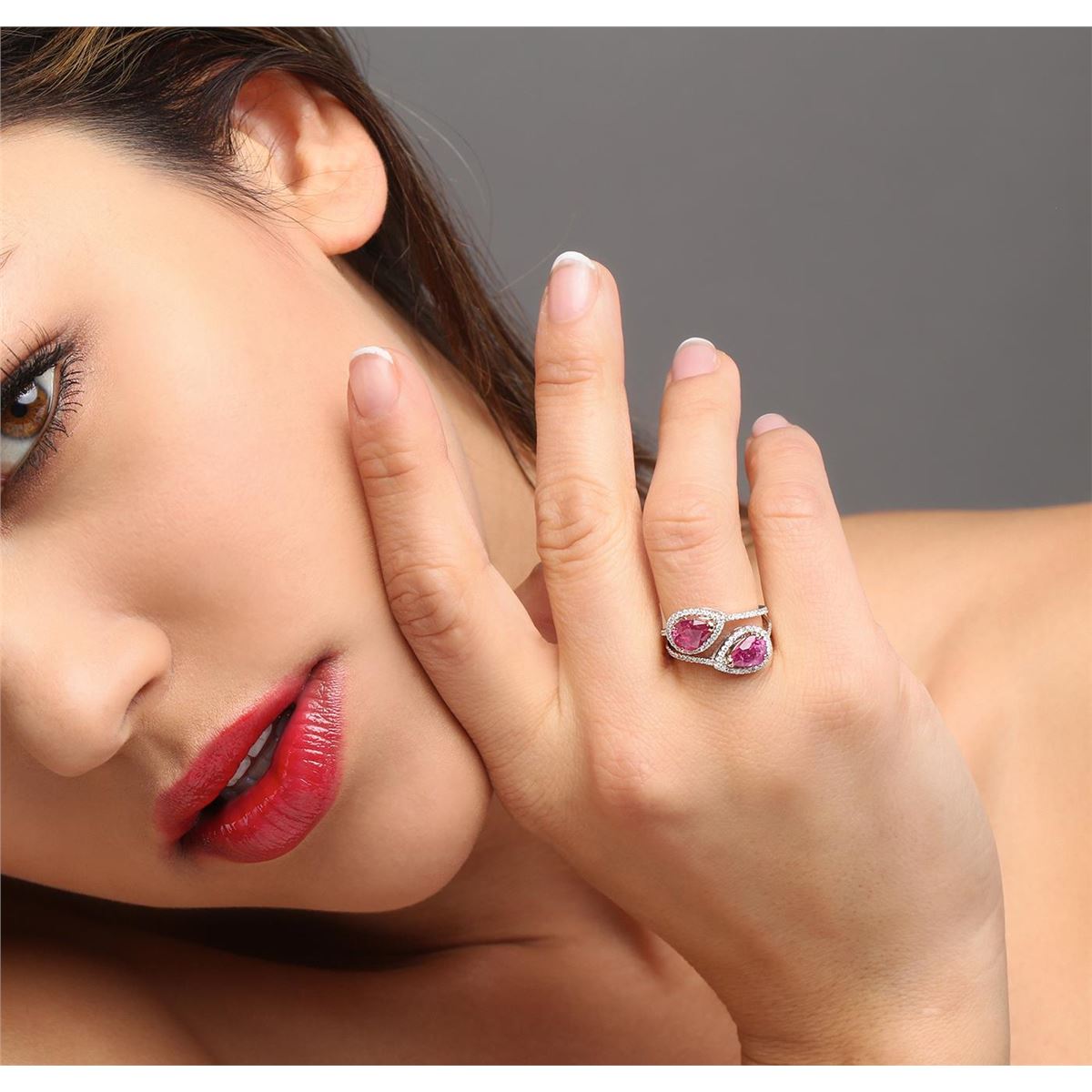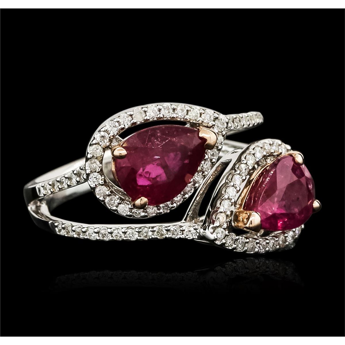 One polished, stamped, and tested 14KT white gold ring mounted with: 2 genuine ruby center stones weighing 3.24ctw, and 82 genuine round diamonds weighing 0.32ctw. This item weighs 5.20 grams, condition is new, excellent workmanship. AIGL Appraised at $9,000.00.