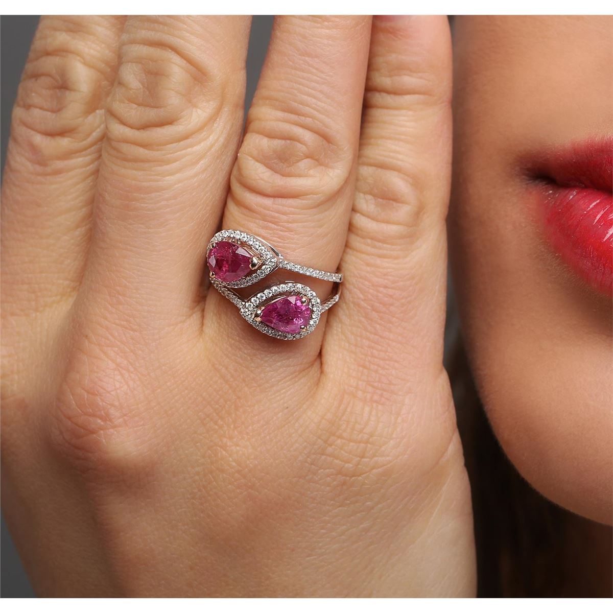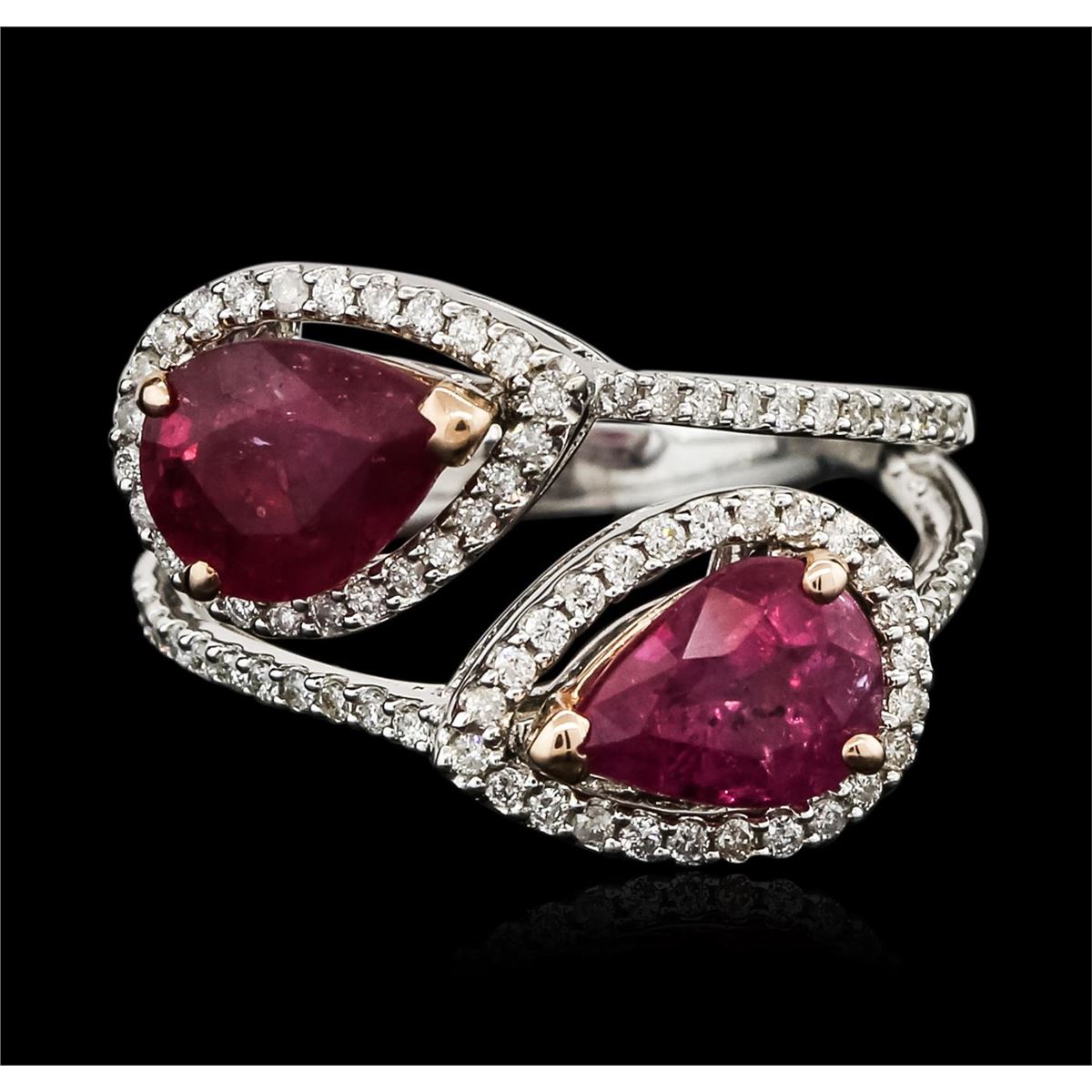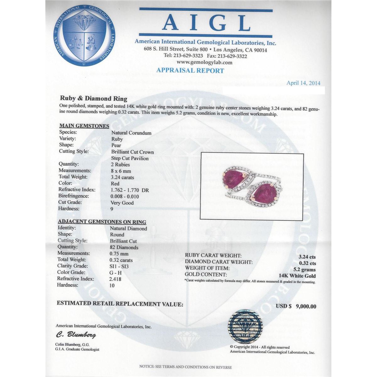 One polished, stamped, and tested 14KT white gold ring mounted with: 2 genuine ruby center stones weighing 3.24ctw, and 82 genuine round diamonds weighing 0.32ctw. This item weighs 5.20 grams, condition is new, excellent workmanship. AIGL Appraised at $9,000.00.