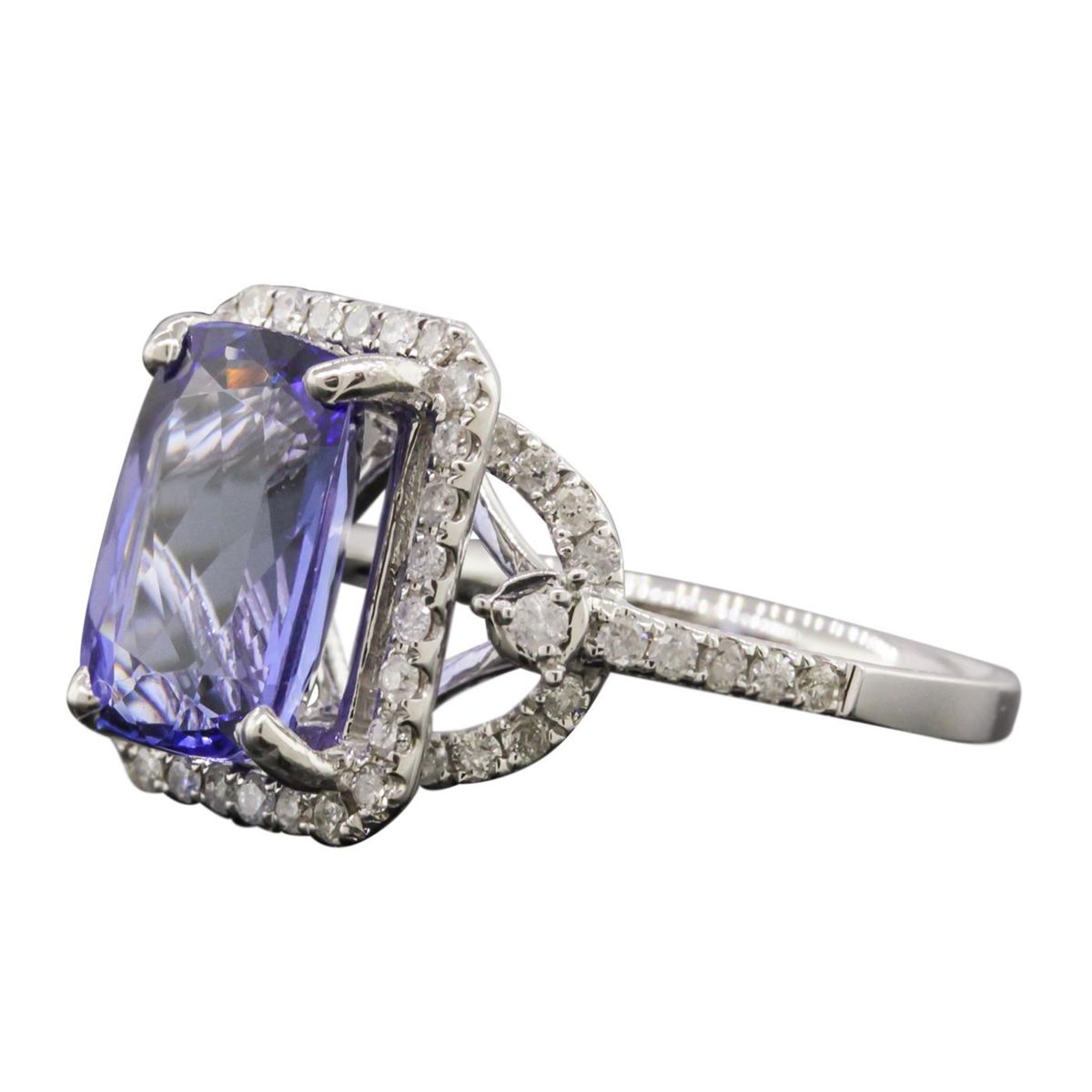 One electronically tested 14KT white gold Ladies combination cast & assembled ring with a bright polish finish. Condition is new. Identified with markings of "14K". Containing: One prong set rectangular cushion modified brilliant cut natural tanzanite, measuring 10.70 x 7.70 x 5.00mm, approximate. Total Weight of 3.24ct., clarity is eye clean, type I, medium, moderately strong, bluish violet color, (GIA bV 5/4), cut is good. Fifty-Six prong set round brilliant cut diamonds, measuring 1.30 - 1.10 x 0.72mm (depth est.) approximate. Total Weight of 56 Stones = 0.30ct. Clarity: I-1 to I-2. Color: I - J, Cut is Good. Colored gemstones are presumed to have been subjected to commonly used enhancement processes. All diamonds and colored gemstones are graded in the mounting, unless otherwise stated. Total Weight of Colored Stones 3.24ct. Total Weight of Diamonds 0.30ct. Total Weight of Ring 4.30 grams. GGL Appraised at $6,490.00.