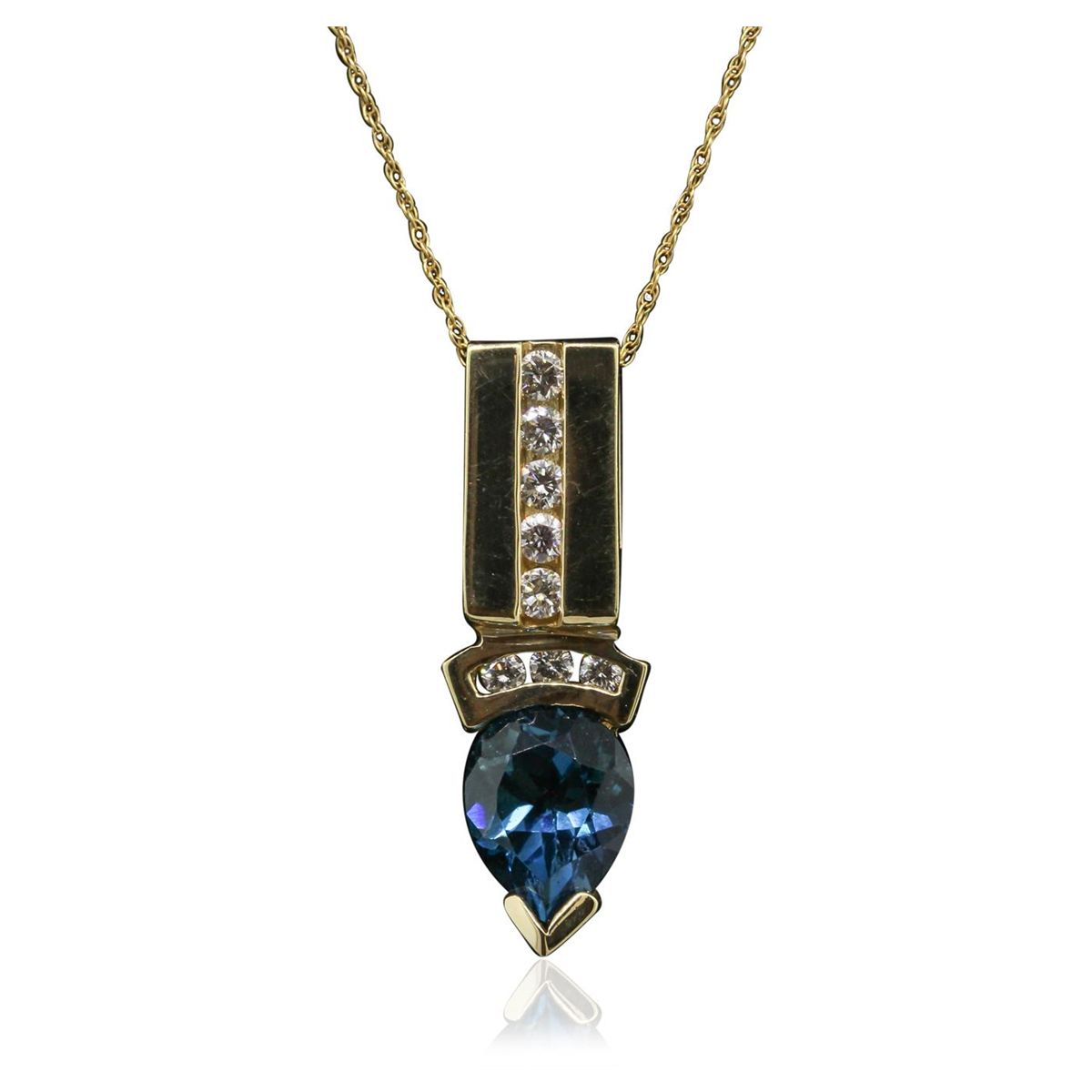 One Pendant featuring: 8.60 grams of 14KT White Gold, Blue Topaz with a total weight of 3.25ct, and Diamonds with a total weight of 0.39ctw.