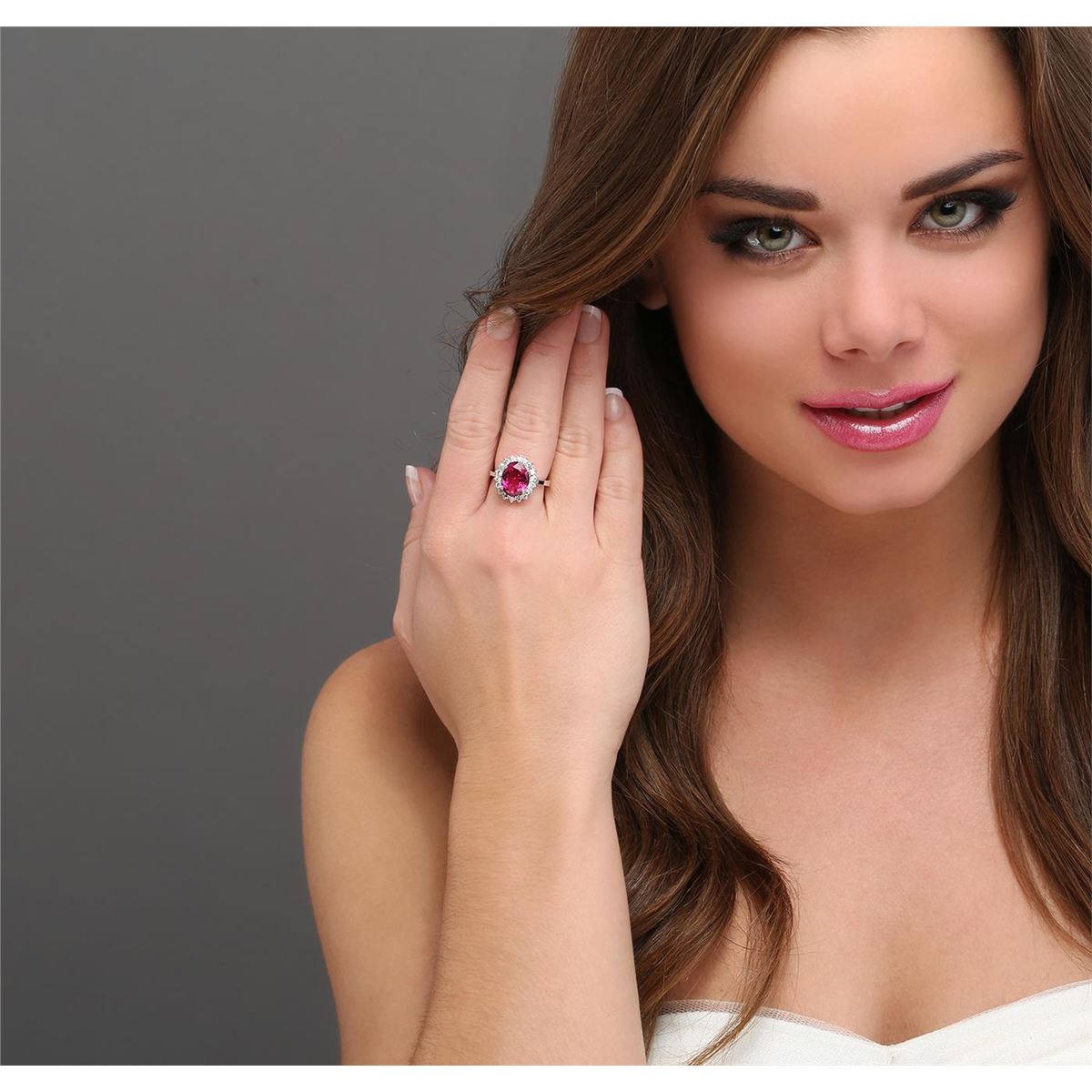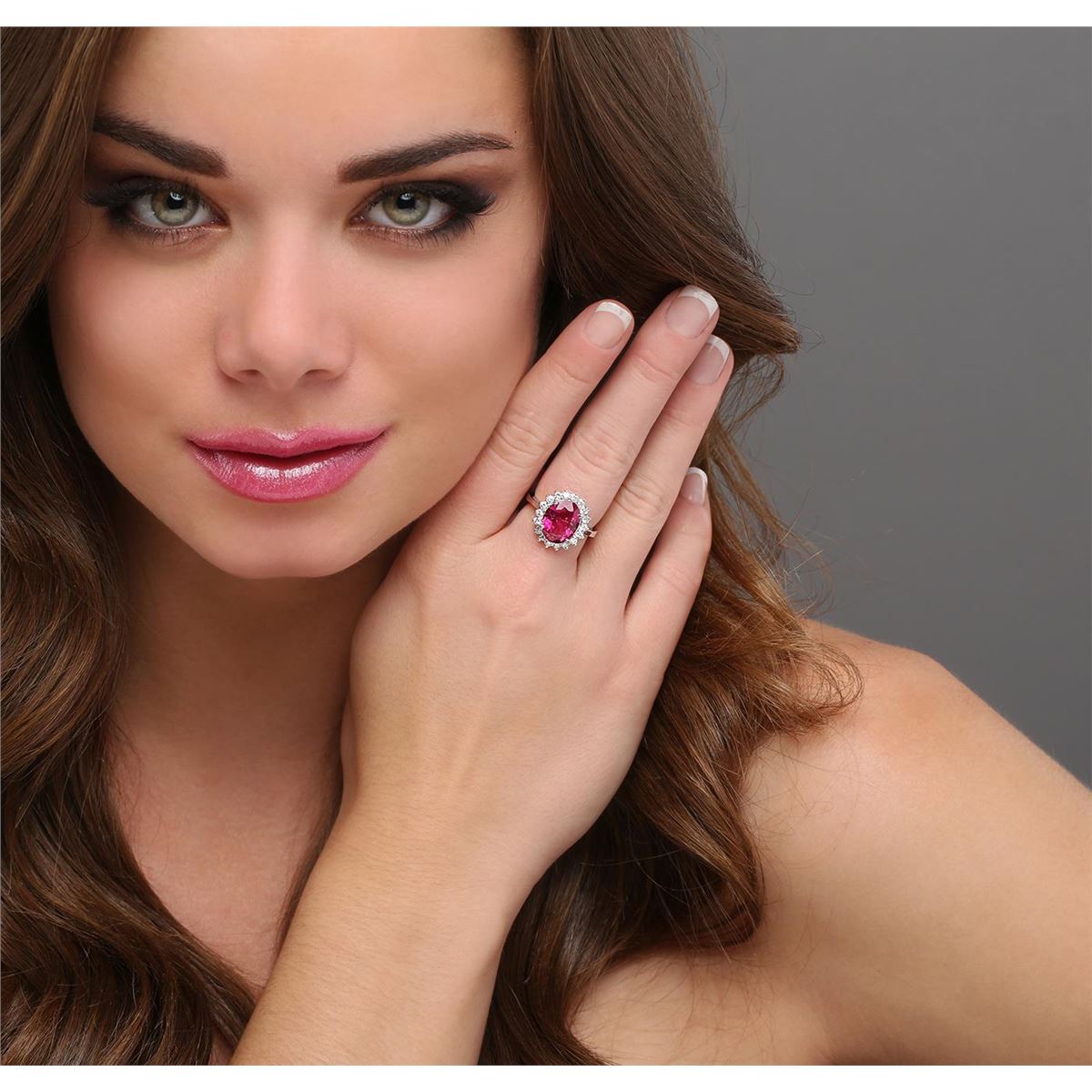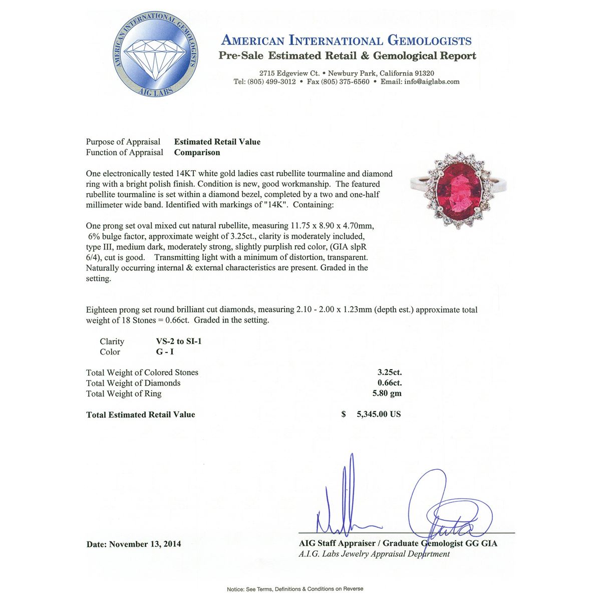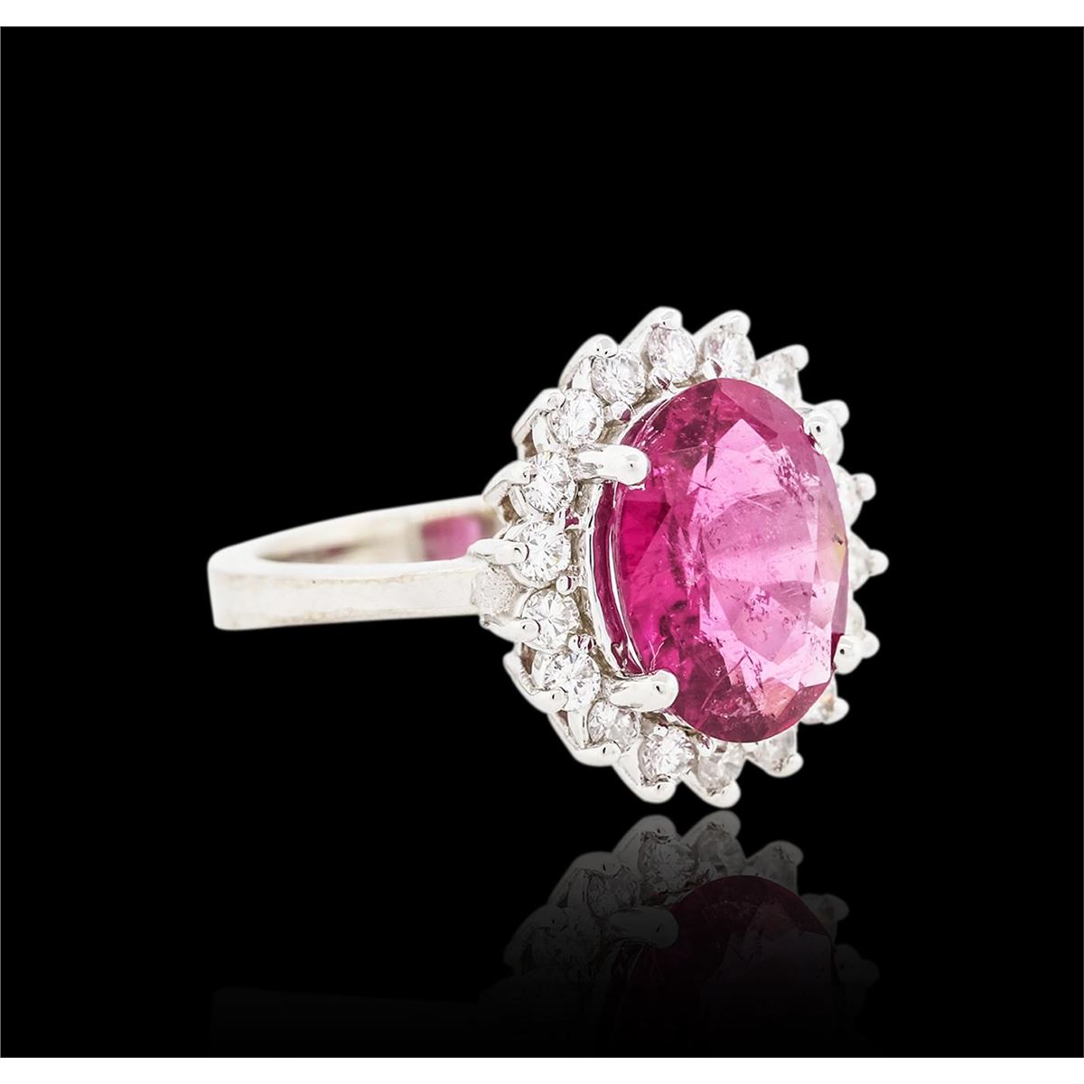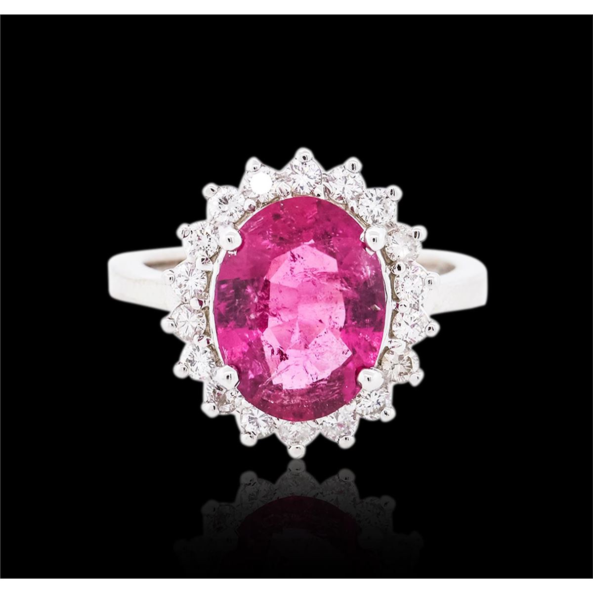 One electronically tested 14KT white gold ladies cast rubellite tourmaline and diamond ring with a bright polish finish. The featured rubellite tourmaline is set within a diamond bezel, completed by a two and one-half millimeter wide band. Identified with markings of "14K". Condition is new, good workmanship. Containing: One prong set oval mixed cut natural rubellite, measuring 11.75 x 8.90 x 4.70mm, 6% bulge factor, approximate weight of 3.25ct., clarity is moderately included, type III, medium dark, moderately strong, slightly purplish red color, (GIA slpR 6/4), cut is good. Transmitting light with a minimum of distortion, transparent. Naturally occurring internal & external characteristics are present. Graded in the setting. Eighteen prong set round brilliant cut diamonds, measuring 2.10 - 2.00 x 1.23mm (depth est.) approximate total weight of 18 Stones = 0.66ct. Graded in the setting. Clarity VS-2 to SI-1. Color G - I. Total Weight of Colored Stones 3.25ct. Total Weight of Diamonds 0.66ct. Total Weight of Ring 5.80 grams. AIG Appraised at $5,345.00.