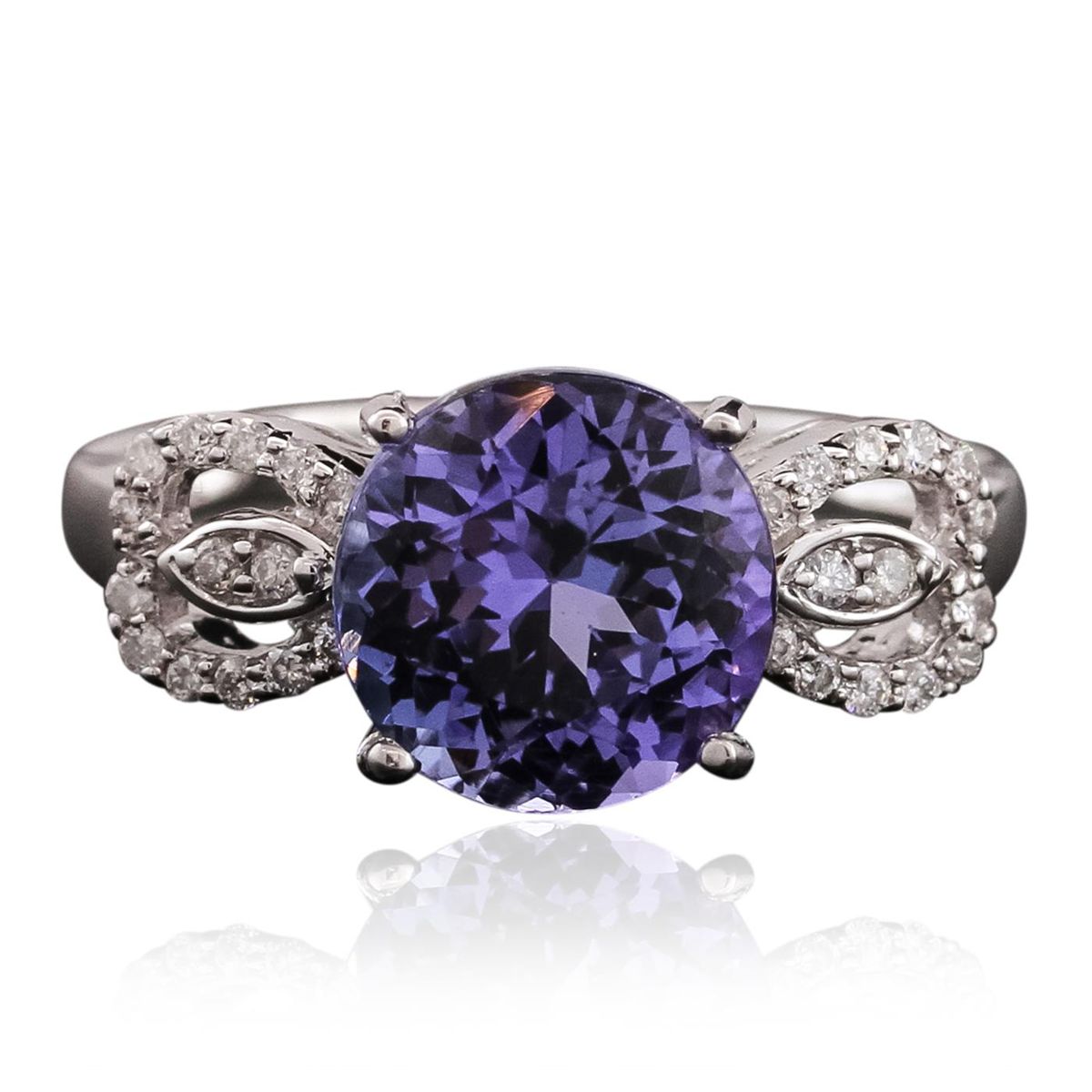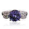 One electronically tested 14KT white gold ladies cast tanzanite & diamond ring with a bright finish. The featured tanzanite is basket set within diamond set tapering shoulders, completed by a two millimeter wide band. Trademark is Orianne. Identified with markings of "14K". Condition is new, good workmanship. Containing: One prong set round mixed cut natural tanzanite, measuring 9.00 - 8.80 x 5.75 mm, 4% bulge factor, approximate weight of 3.25ct., clarity is eye clean, type I, dark, slightly grayish, bluish violet color, (GIA bV 7/2), cut is good. Transmitting light with no distortion, transparent. Graded in the setting. Tanzanite is a very rare gemstone that is only found in the country of Tanzania. Originally discovered in 1967. Tiffany & Company, named the stone Tanzanite. It is found in the Usumburu Mountains that border the Umba Valley of northern Tanzania. Tanzanite occurs in gray, brown, violet, blue, reddish-purple, & green. The gem is interesting because of its exceptional pleochroism. Rotated in different directions a tanzanite will exhibit multiple changes of color. Tanzanite has a low tolerance to ultrasonic cleaning, and should not be cleaned using this method. Twenty-Eight prong set round brilliant cut diamonds, measuring 1.20 - 1.00 x 0.66mm (depth est.) approximate total weight of 28 Stones = 0.14ct. Graded in the setting. Clarity: I-1 to I-2. Color: G - I. Total Weight of Colored Stones 3.25ct. Total Weight of Diamonds 0.14ct. Total Weight of Ring 2.95 grams. AIG Appraised at $4,990.00.