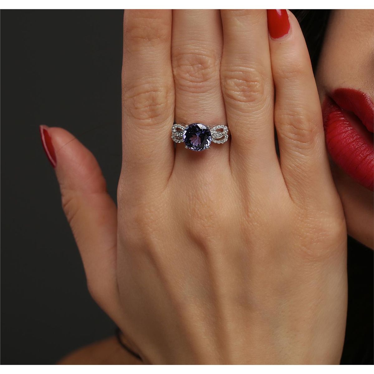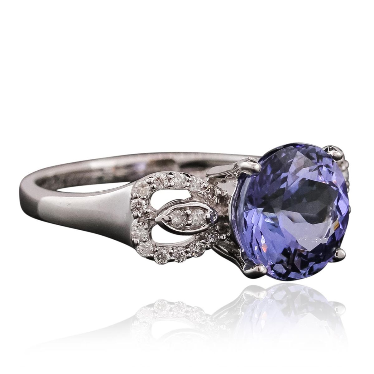 One electronically tested 14KT white gold ladies cast tanzanite & diamond ring with a bright finish. The featured tanzanite is basket set within diamond set tapering shoulders, completed by a two millimeter wide band. Trademark is Orianne. Identified with markings of "14K". Condition is new, good workmanship. Containing: One prong set round mixed cut natural tanzanite, measuring 9.00 - 8.80 x 5.75 mm, 4% bulge factor, approximate weight of 3.25ct., clarity is eye clean, type I, dark, slightly grayish, bluish violet color, (GIA bV 7/2), cut is good. Transmitting light with no distortion, transparent. Graded in the setting. Tanzanite is a very rare gemstone that is only found in the country of Tanzania. Originally discovered in 1967. Tiffany & Company, named the stone Tanzanite. It is found in the Usumburu Mountains that border the Umba Valley of northern Tanzania. Tanzanite occurs in gray, brown, violet, blue, reddish-purple, & green. The gem is interesting because of its exceptional pleochroism. Rotated in different directions a tanzanite will exhibit multiple changes of color. Tanzanite has a low tolerance to ultrasonic cleaning, and should not be cleaned using this method. Twenty-Eight prong set round brilliant cut diamonds, measuring 1.20 - 1.00 x 0.66mm (depth est.) approximate total weight of 28 Stones = 0.14ct. Graded in the setting. Clarity: I-1 to I-2. Color: G - I. Total Weight of Colored Stones 3.25ct. Total Weight of Diamonds 0.14ct. Total Weight of Ring 2.95 grams. AIG Appraised at $4,990.00.