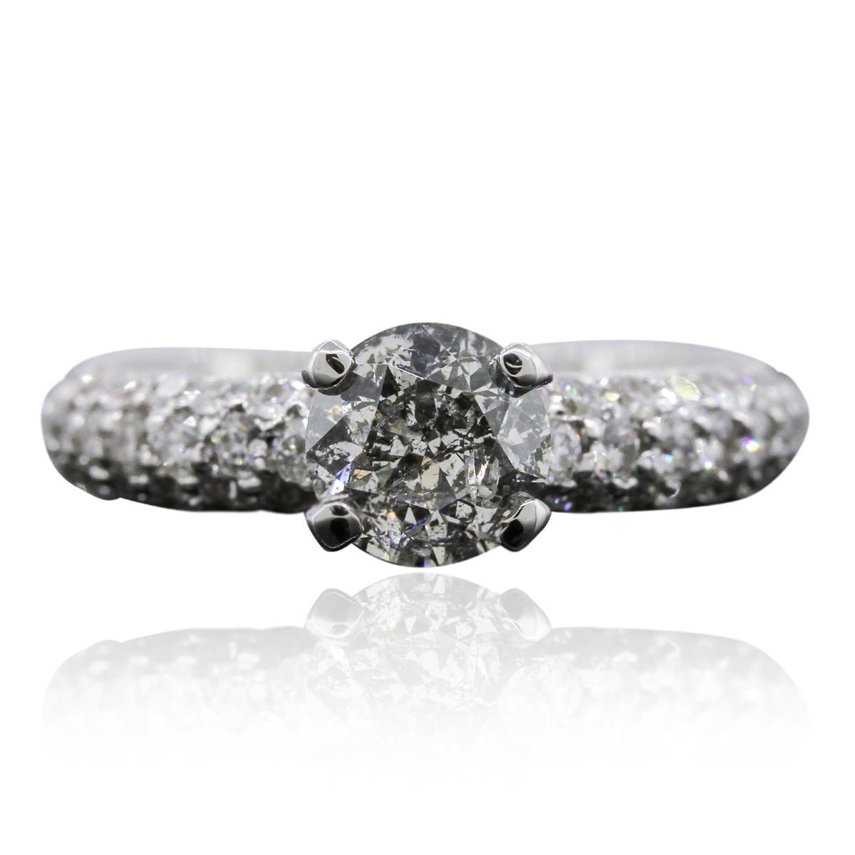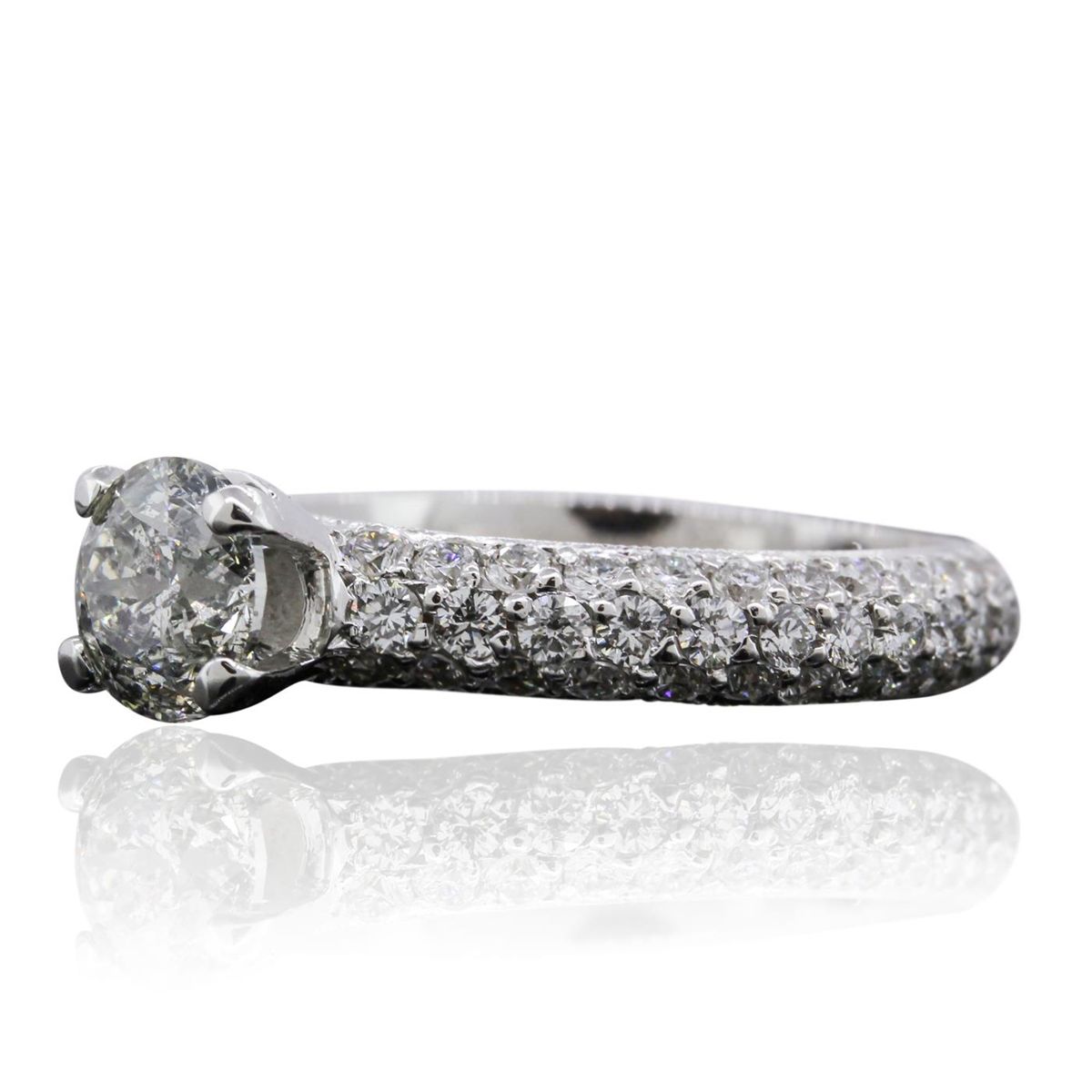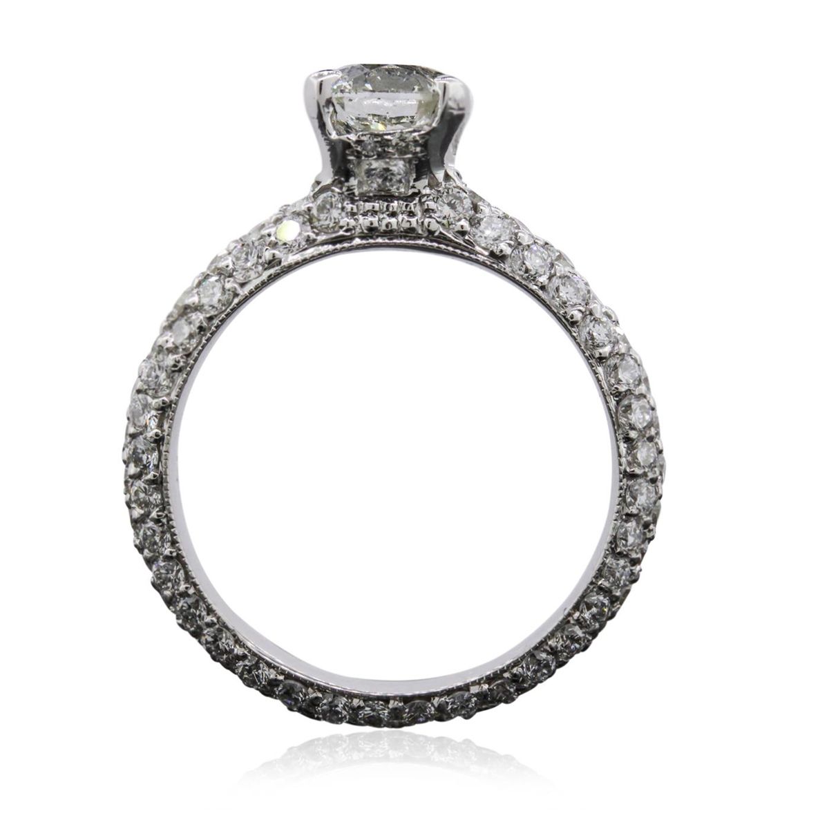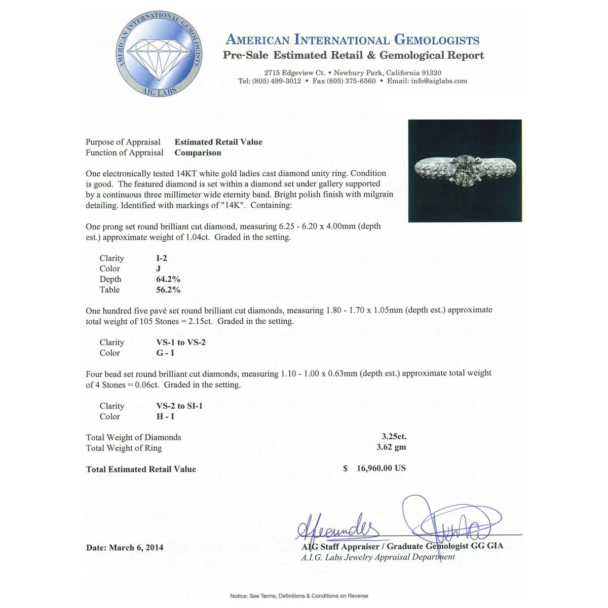 One electronically tested 14KT white gold ladies cast diamond unity ring. Condition is good. The featured diamond is set within a diamond set under gallery supported by a continuous three millimeter wide eternity band. Bright polish finish with milgrain detailing. Identified with markings of "14K". Containing: One prong set round brilliant cut diamond, measuring 6.25 - 6.20 x 4.00mm (depth est.) approximate weight of 1.04ct. Graded in the setting. Clarity: I-2. Color: J Depth 64.2%. Table 56.2%. One Hundred Five pave‚ set round brilliant cut diamonds, measuring 1.80 - 1.70 x 1.05mm (depth est.) approximate. Total Weight of 105 Stones = 2.15ct. Graded in the setting. Clarity: VS-1 to VS-2. Color: G - I Four bead set round brilliant cut diamonds, measuring 1.10 - 1.00 x 0.63mm (depth est.) approximate. Total Weight of 4 Stones = 0.06ct. Graded in the setting. Clarity: VS-2 to SI-1. Color: H - I. Total Weight of Diamonds 3.25ct. Total Weight of Ring 3.62 grams. AIG Appraised at $16,960.00.