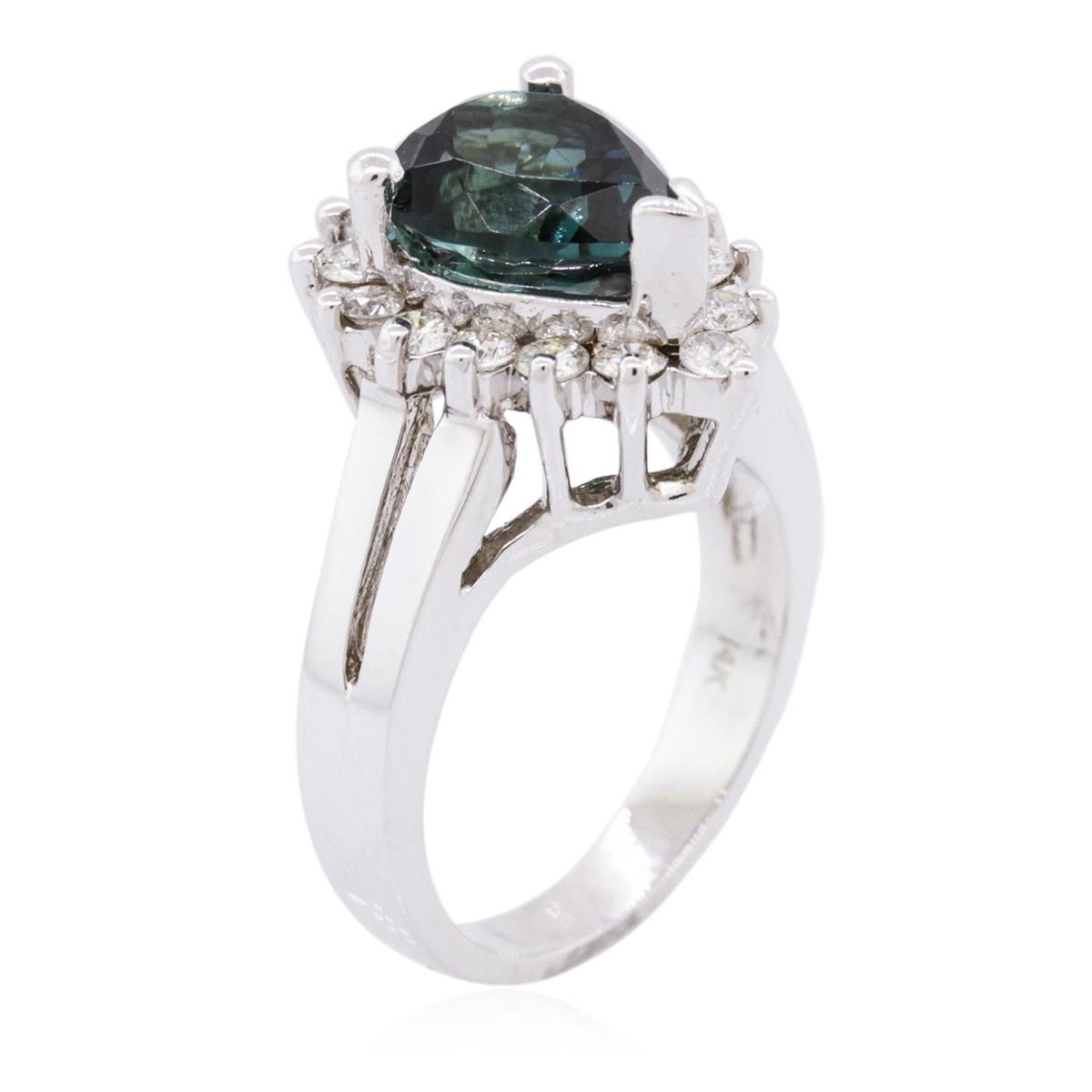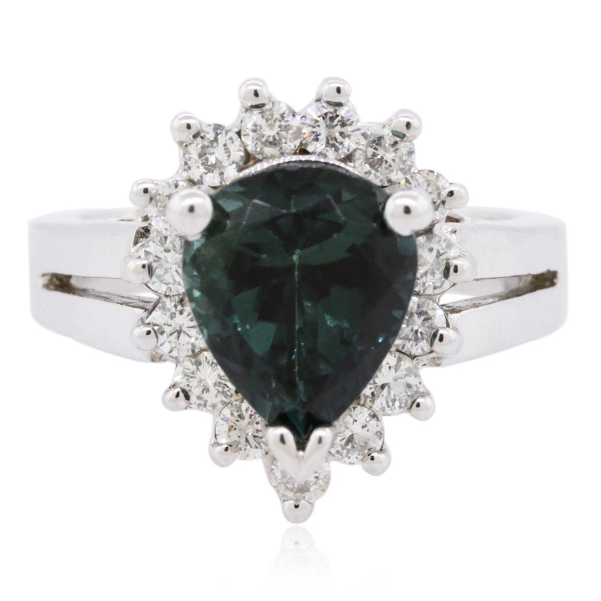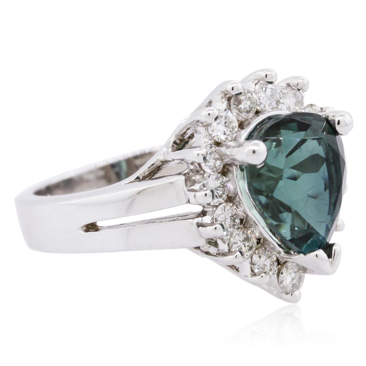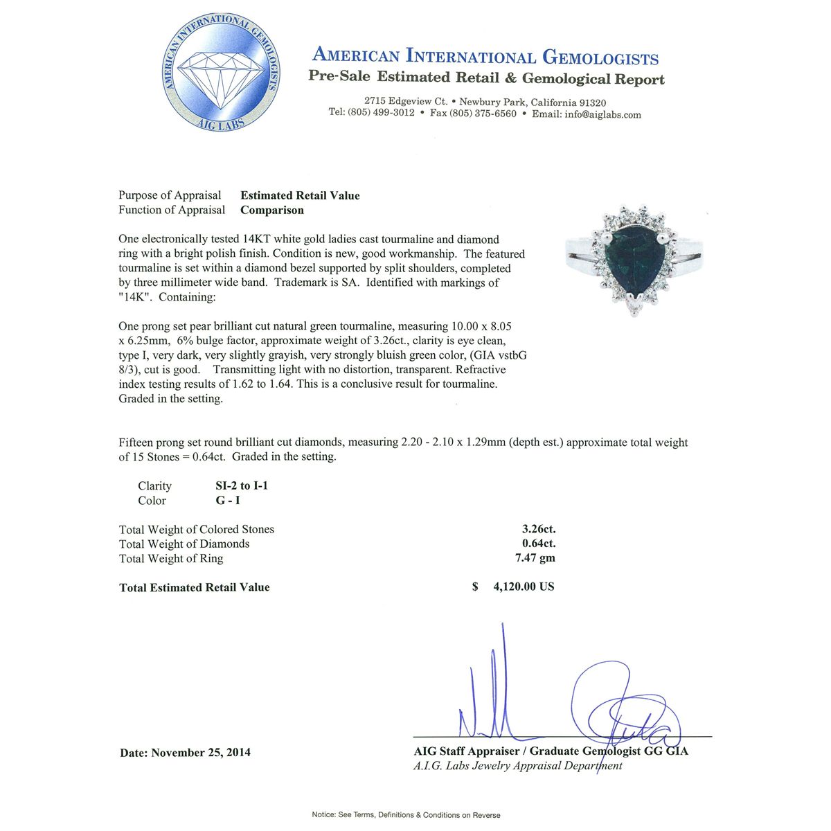 One electronically tested 14KT white gold ladies cast tourmaline and diamond ring with a bright polish finish. The featured tourmaline is set within a diamond bezel supported by split shoulders, completed by three millimeter wide band. Trademark is SA. Identified with markings of "14K". Condition is new, good workmanship. Containing: One prong set pear brilliant cut natural green tourmaline, measuring 10.00 x 8.05 x 6.25mm, 6%. bulge factor, approximate weight of 3.26ct., clarity is eye clean, type I, very dark, very slightly grayish, very strongly bluish green color, (GIA vstbG 8/3), cut is good. Transmitting light with no distortion, transparent. Refractive index testing results of 1.62 to 1.64. This is a conclusive result for tourmaline. Graded in the setting. Fifteen prong set round brilliant cut diamonds, measuring 2.20 - 2.10 x 1.29mm (depth est.) approximate total weight of 15 Stones = 0.64ct. Graded in the setting. Clarity: SI-2 to I-1. Color: G - I. Total Weight of Colored Stones 3.26ct. Total Weight of Diamonds 0.64ct. Total Weight of Ring 7.47 grams. AIG Appraised at $4,120.00.