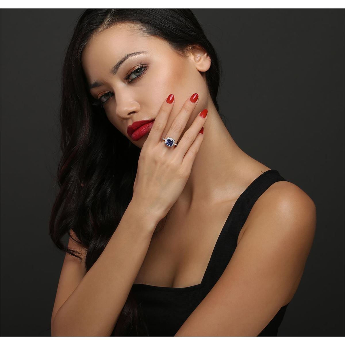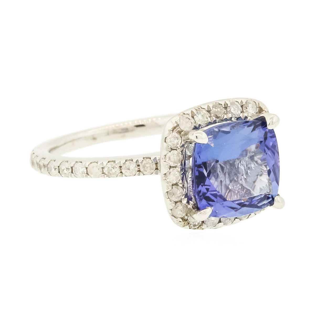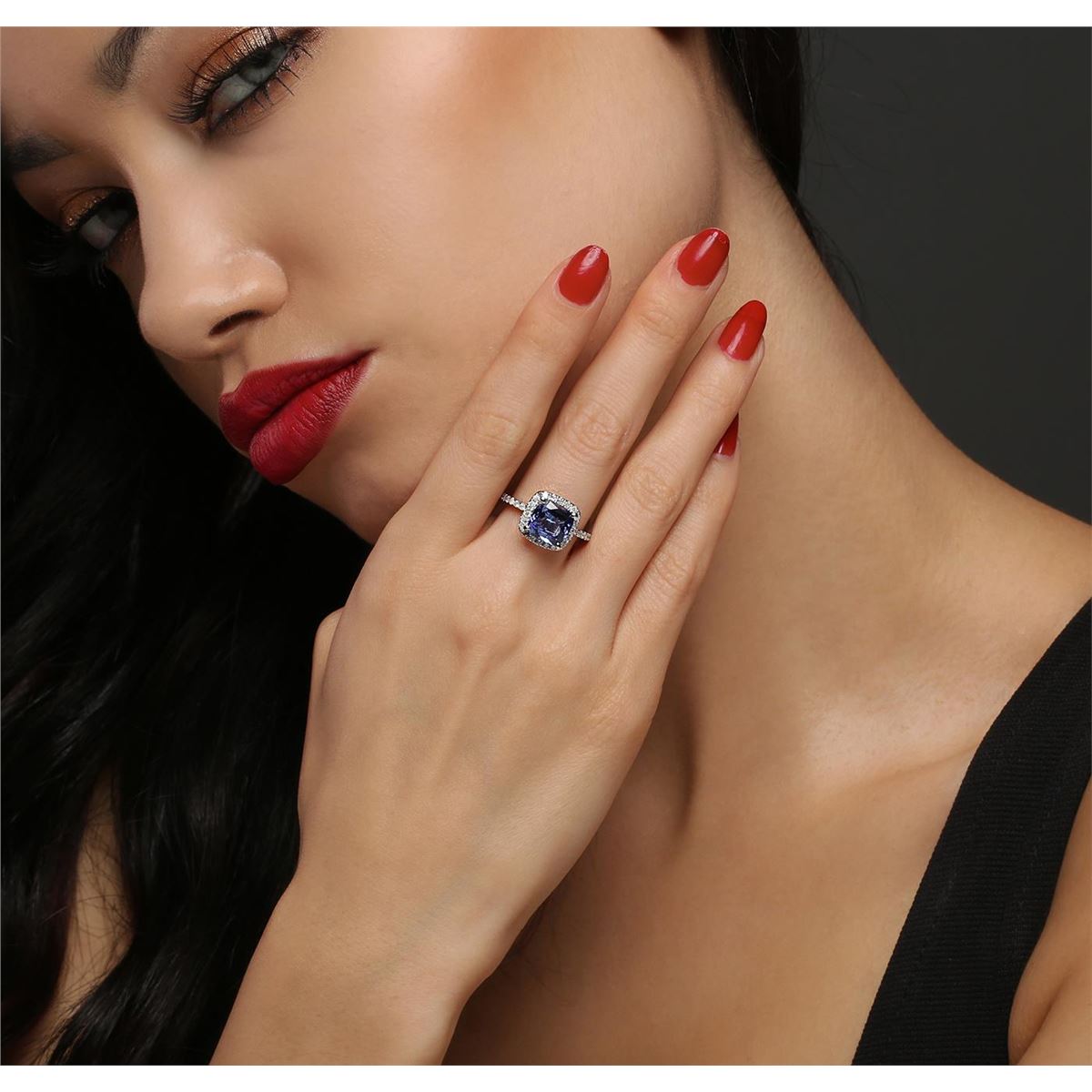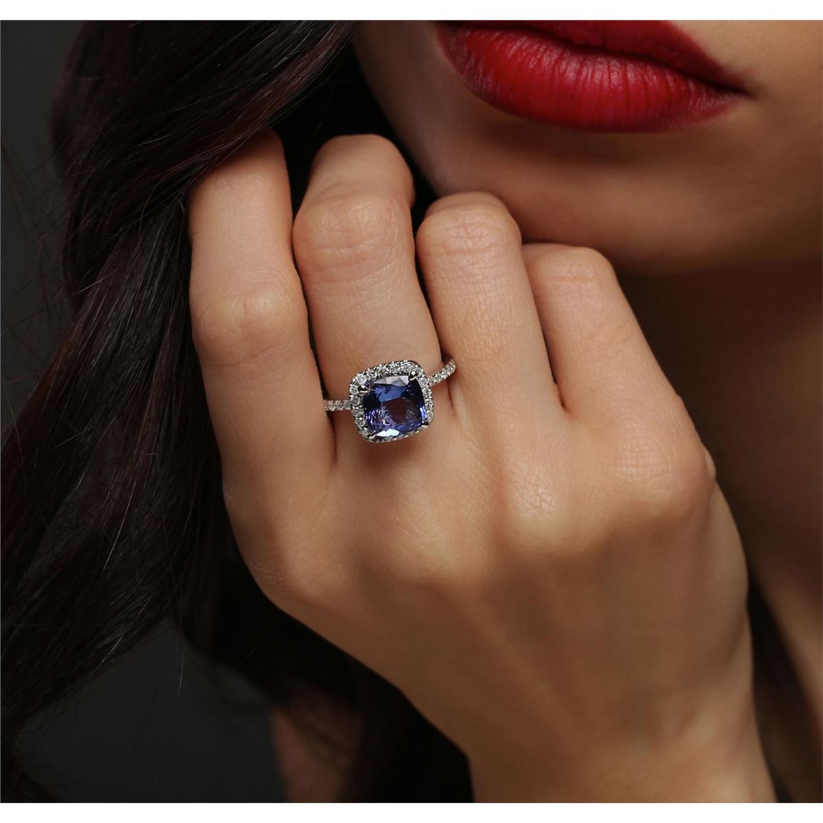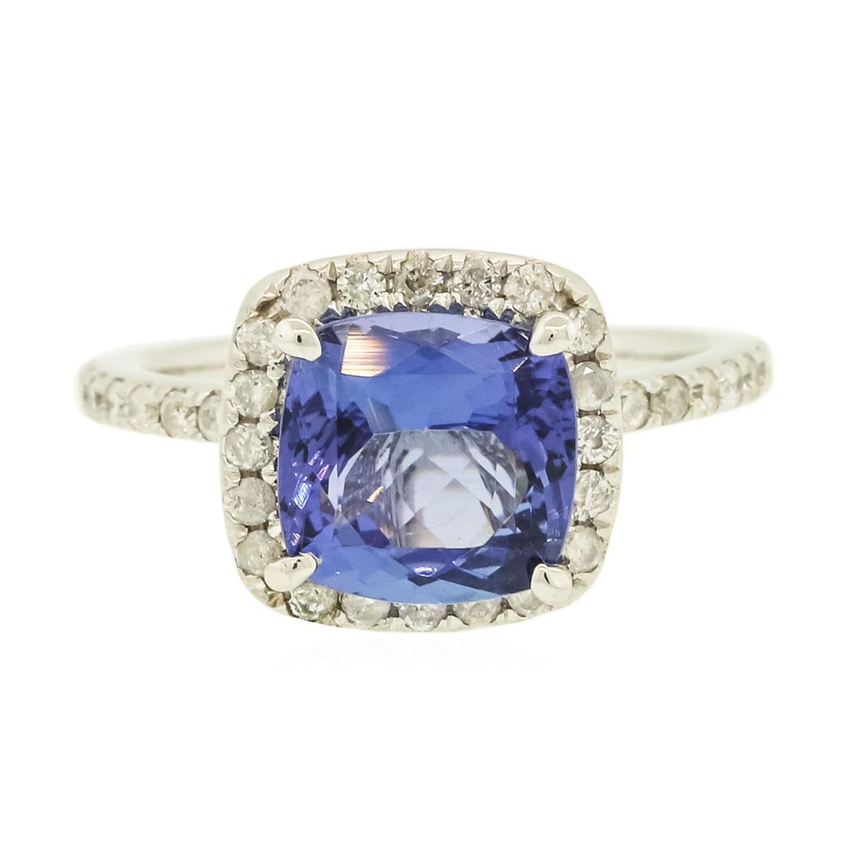 One electronically tested 14KT white gold ladies cast tanzanite and diamond ring with a bright polish finish. The featured tanzanite is set within a diamond bezel supported by diamond set shoulders, completed by a one and one-half millimeter wide band. Trademark is Orianne. Identified with markings of "14K". Condition is new, good workmanship. Containing: One prong set square cushion brilliant cut natural tanzanite, measuring 8.94 x 8.85 x 4.95mm, 6% bulge factor, approximate weight of 3.27ct., clarity is eye clean, type I, medium dark, very slightly grayish, violetish blue color, (GIA vB 6/3), cut is good. Transmitting light with no distortion, transparent. Graded in the setting. Tanzanite is a very rare gemstone that is only found in the country of Tanzania. Originally discovered in 1967. Tiffany & Company, named the stone Tanzanite. It is found in the Usumburu Mountains that border the Umba Valley of northern Tanzania. Tanzanite occurs in gray, brown, violet, blue, reddish-purple, & green. The gem is interesting because of its exceptional pleochroism. Rotated in different directions a tanzanite will exhibit multiple changes of color. Tanzanite has a low tolerance to ultrasonic cleaning, and should not be cleaned using this method. Sixty-Four prong set round brilliant cut diamonds, measuring 1.50 - 1.40 x 0.87mm (depth est.) approximate total weight of 64 Stones = 0.81ct. Graded in the setting. Clarity: I-1 to I-2. Color: H - J. Total Weight of Colored Stones 3.27ct. Total Weight of Diamonds 0.81ct. Total Weight of Ring 4.84 grams. AIG Appraised at $11,030.00.