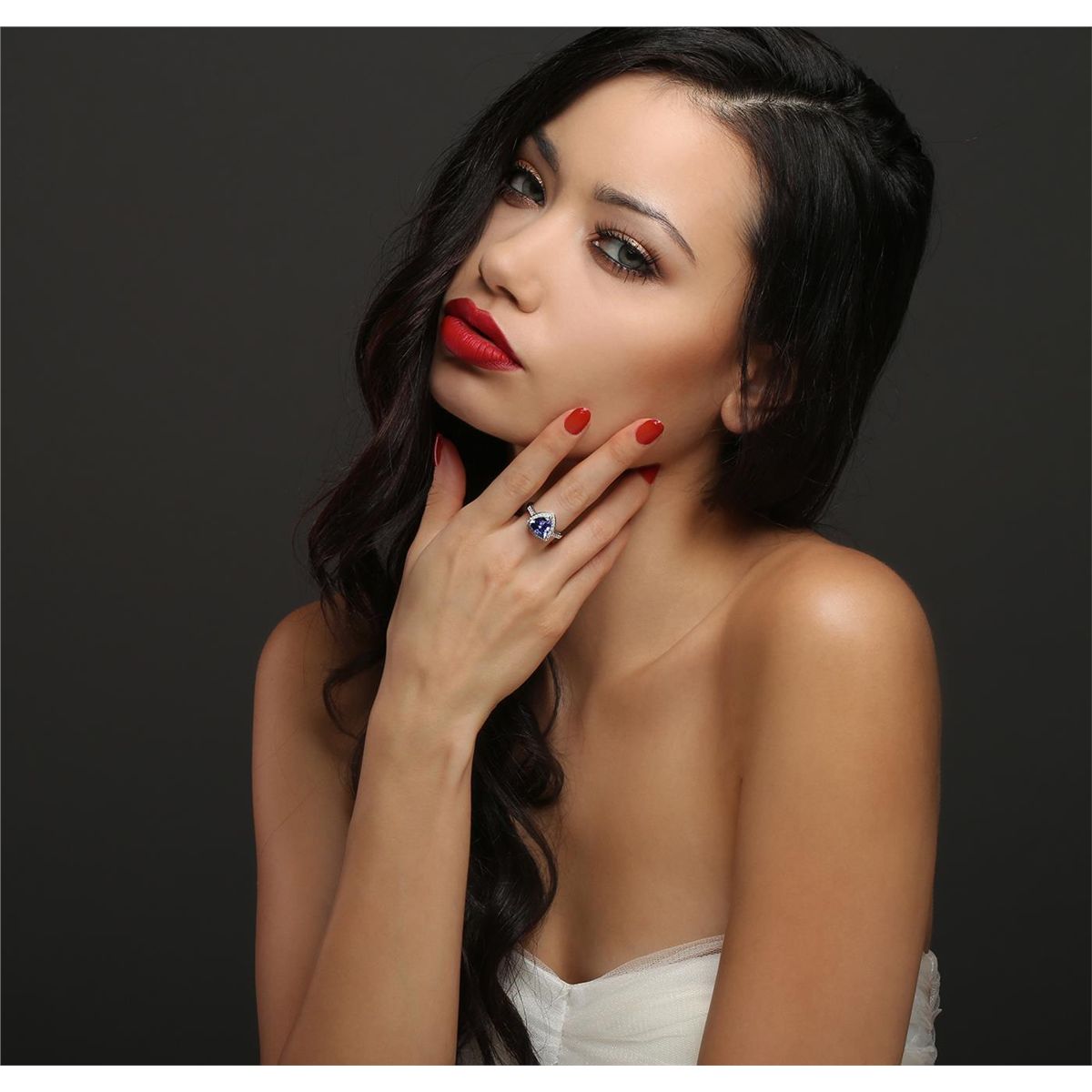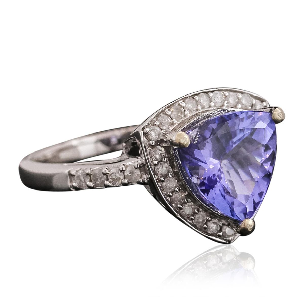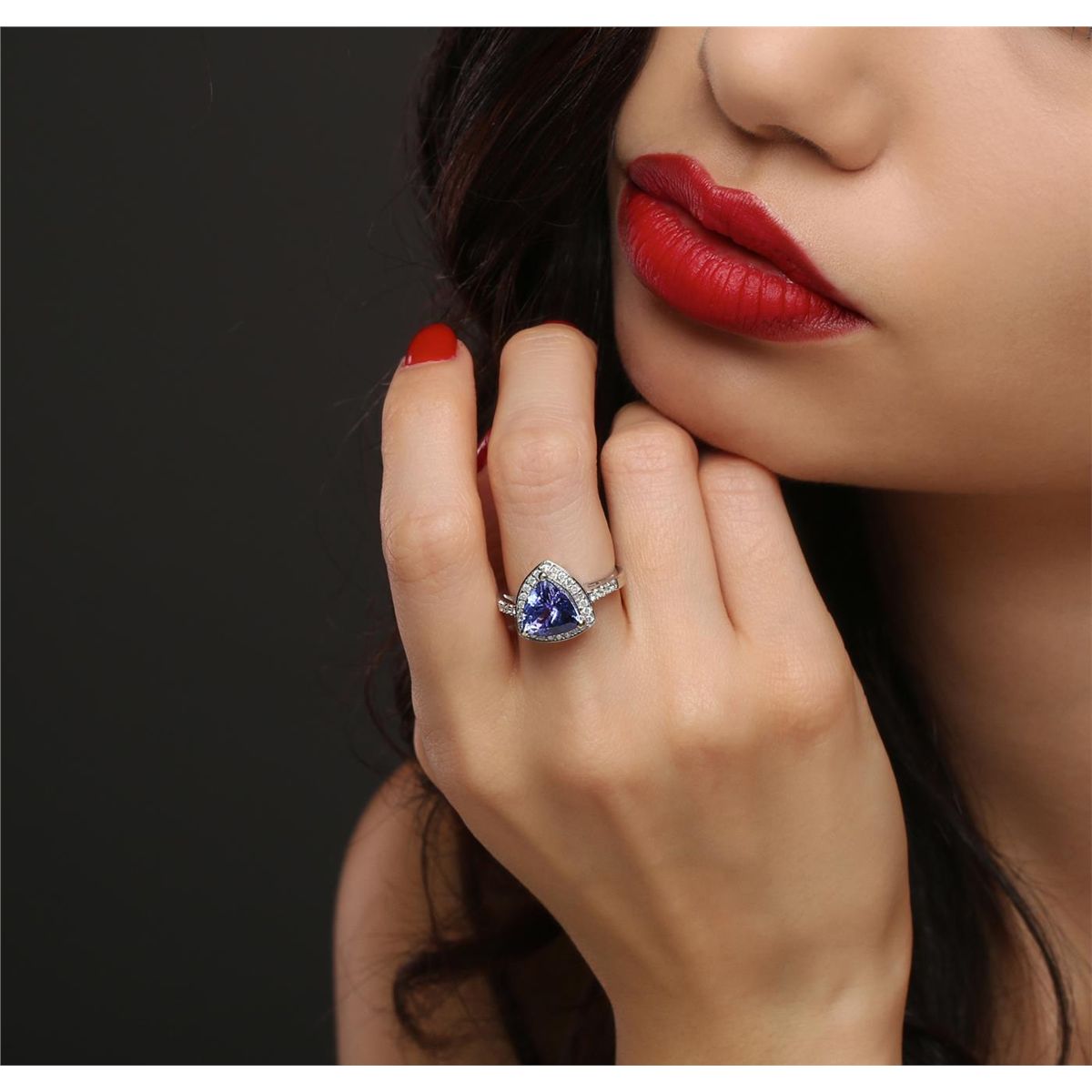 One electronically tested 14KT white gold ladies cast tanzanite and diamond ring with a bright polish finish. The featured tanzanite is set within a diamond bezel supported by diamond set shoulders, completed by a two millimeter wide band. Trademark is Orianne. Identified with markings of "14K". Condition is new, good workmanship. Containing: One prong set triangle mixed cut natural tanzanite, measuring 9.50 x 9.40 x 5.75mm, 6% bulge factor, approximate weight of 3.28ct., clarity is eye clean, type I, medium dark, very slightly grayish, bluish violet color, (GIA bV 6/3), cut is good. Transmitting light with no distortion, transparent. Graded in the setting. Tanzanite is a very rare gemstone that is only found in the country of Tanzania. Originally discovered in 1967. Tiffany & Company, named the stone Tanzanite. It is found in the Usumburu Mountains that border the Umba Valley of northern Tanzania. Tanzanite occurs in gray, brown, violet, blue, reddish-purple, & green. The gem is interesting because of its exceptional pleochroism. Rotated in different directions a tanzanite will exhibit multiple changes of color. Tanzanite has a low tolerance to ultrasonic cleaning, and should not be cleaned using this method. Thirty-Two prong set round brilliant cut diamonds, measuring 1.50 - 1.40 x 0.87mm (depth est.) approximate total weight of 32 Stones = 0.45ct. Graded in the setting. Clarity: I-1 to I-3. Color: H - J. Total Weight of Colored Stones 3.28ct. Total Weight of Diamonds 0.45ct. Total Weight of Ring 5.36 grams. AIG Appraised at $10,130.00.
