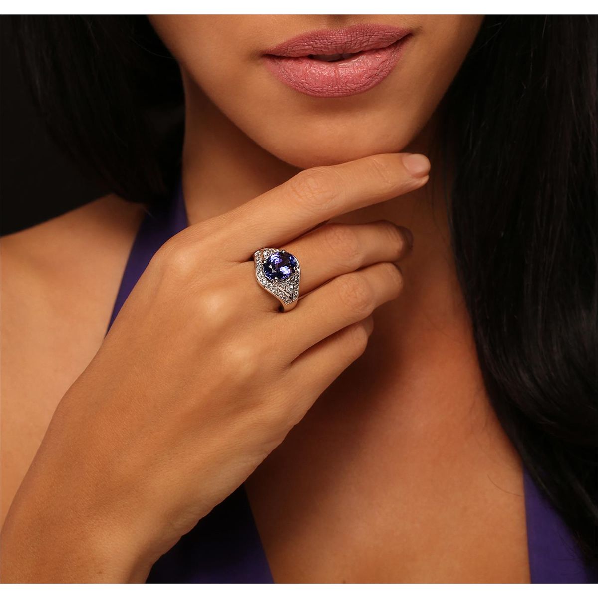 One electronically tested 14KT white gold Ladies combination cast & assembled ring with a bright polish finish. Condition is new. Identified with markings of "K14". Containing: One prong set oval modified brilliant cut natural tanzanite, measuring 10.50 x 8.20 x 5.60mm, approximate weight of 3.28ct., clarity is eye clean, type I, medium, moderately strong, bluish violet color, (GIA bV 5/4), cut is very good. Colored gemstones are presumed to have been subjected to commonly used color/clarity enhancement processes. Twenty-Eight prong set round brilliant cut diamonds, measuring 2.20 - 1.90 x 1.23mm (depth est.) approximate. Total Weight of 28 Stones = 0.88ct. Clarity: SI-2. Color: K - L, Cut is Good. Total Weight of Colored Stones 3.28ct. Total Weight of Diamonds 0.88ct. Total Weight of Ring 8.10 grams. GGL Appraised at $6,505.00.