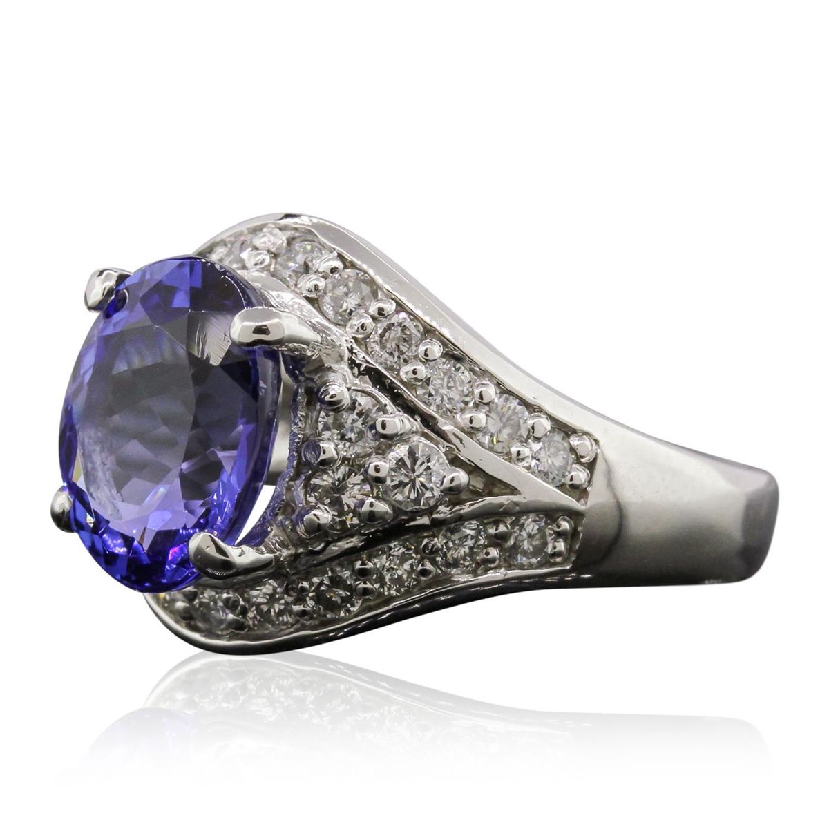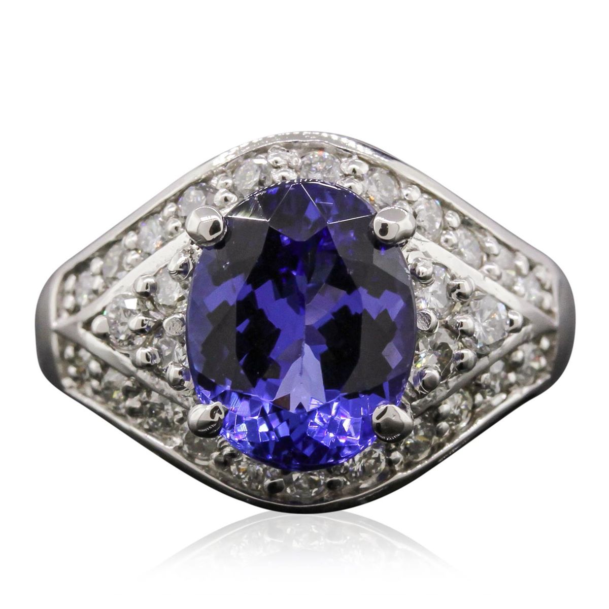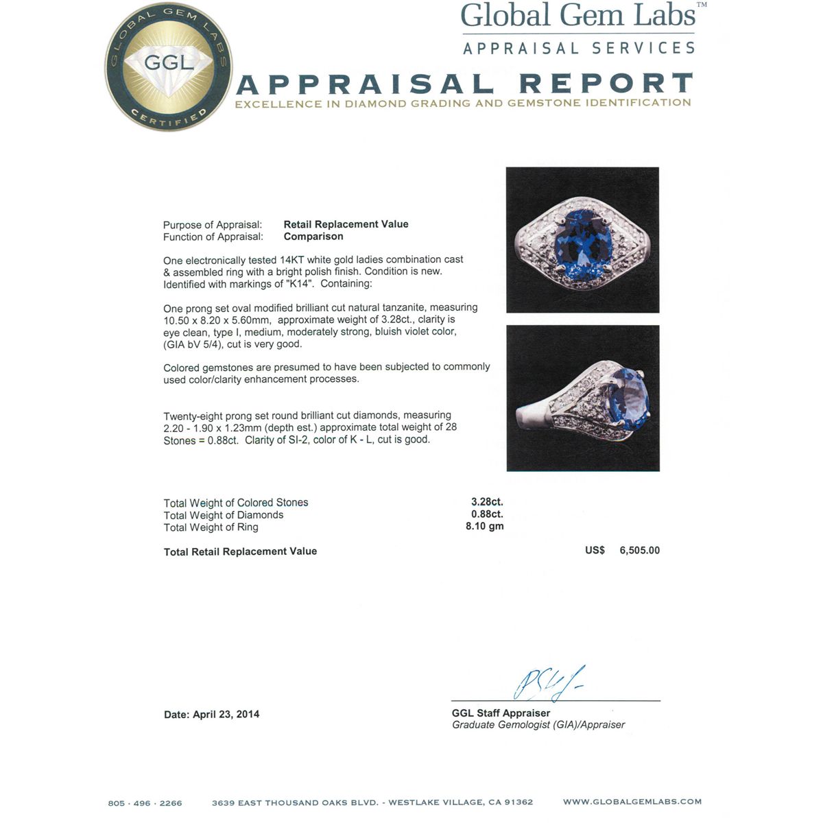 One electronically tested 14KT white gold Ladies combination cast & assembled ring with a bright polish finish. Condition is new. Identified with markings of "K14". Containing: One prong set oval modified brilliant cut natural tanzanite, measuring 10.50 x 8.20 x 5.60mm, approximate weight of 3.28ct., clarity is eye clean, type I, medium, moderately strong, bluish violet color, (GIA bV 5/4), cut is very good. Colored gemstones are presumed to have been subjected to commonly used color/clarity enhancement processes. Twenty-Eight prong set round brilliant cut diamonds, measuring 2.20 - 1.90 x 1.23mm (depth est.) approximate. Total Weight of 28 Stones = 0.88ct. Clarity: SI-2. Color: K - L, Cut is Good. Total Weight of Colored Stones 3.28ct. Total Weight of Diamonds 0.88ct. Total Weight of Ring 8.10 grams. GGL Appraised at $6,505.00.