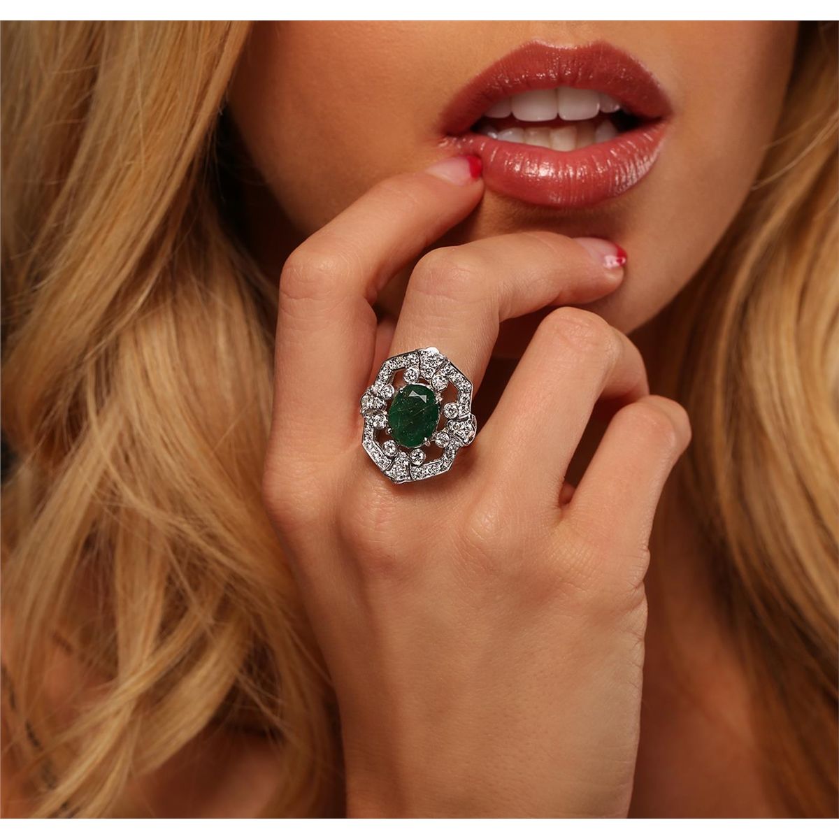 One electronically tested 14KT white gold Ladies combination cast & assembled fancy ring with a high polish finish. Condition is new. Identified with markings of "14K". Containing: One prong set oval modified brilliant cut natural emerald, measuring 11.60 x 9.00 x 5.70mm, approximate weight of 3.29ct., clarity is heavily included, type III, medium dark, moderately strong, green color, (GIA G 6/4), cut is good. Colored gemstones are presumed to have been subjected to commonly used and possible undetectable color/clarity enhancement processes. Ten bezel set round brilliant cut diamonds, measuring 2.50 - 2.50 x 1.66mm (depth est.) approximate total weight of 10 Stones = 0.63ct. Clarity of SI-1 to I-1, Color of J - K, Cut is Good. Twenty-Seven bead set round brilliant cut diamonds, measuring 2.10 - 1.80 x 1.17mm (depth est.) approximate total weight of 27 Stones = 0.73ct. Clarity of SI-1 to SI-2, Color of J - L, Cut is Good. Total Weight of Colored Stones 3.29ct. Total Weight of Diamonds 1.36ct. Total Weight of Ring 8.60 grams. GGL Appraised at $12,065.00.
